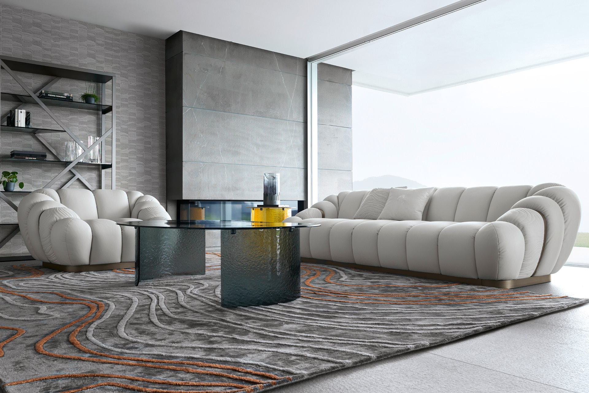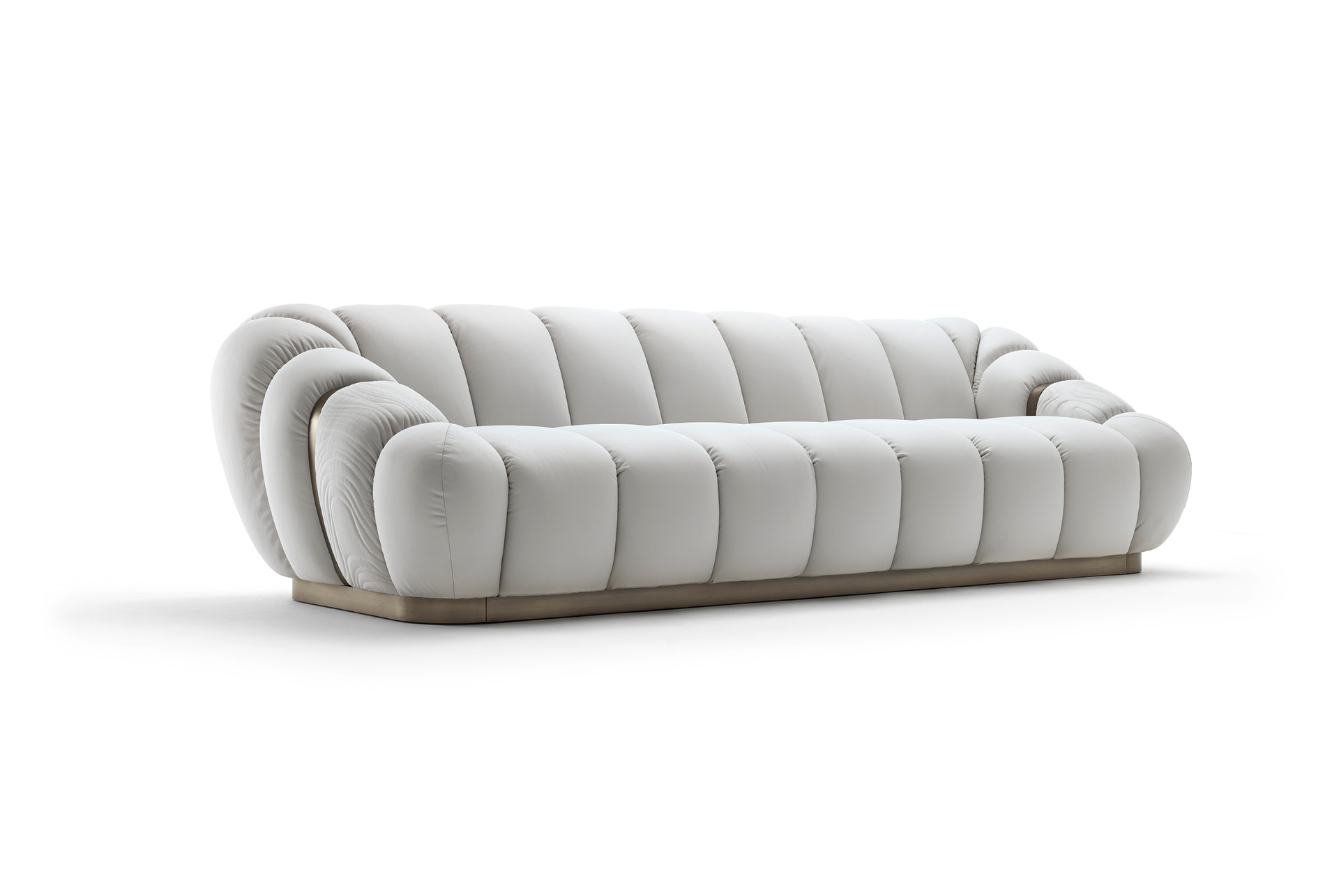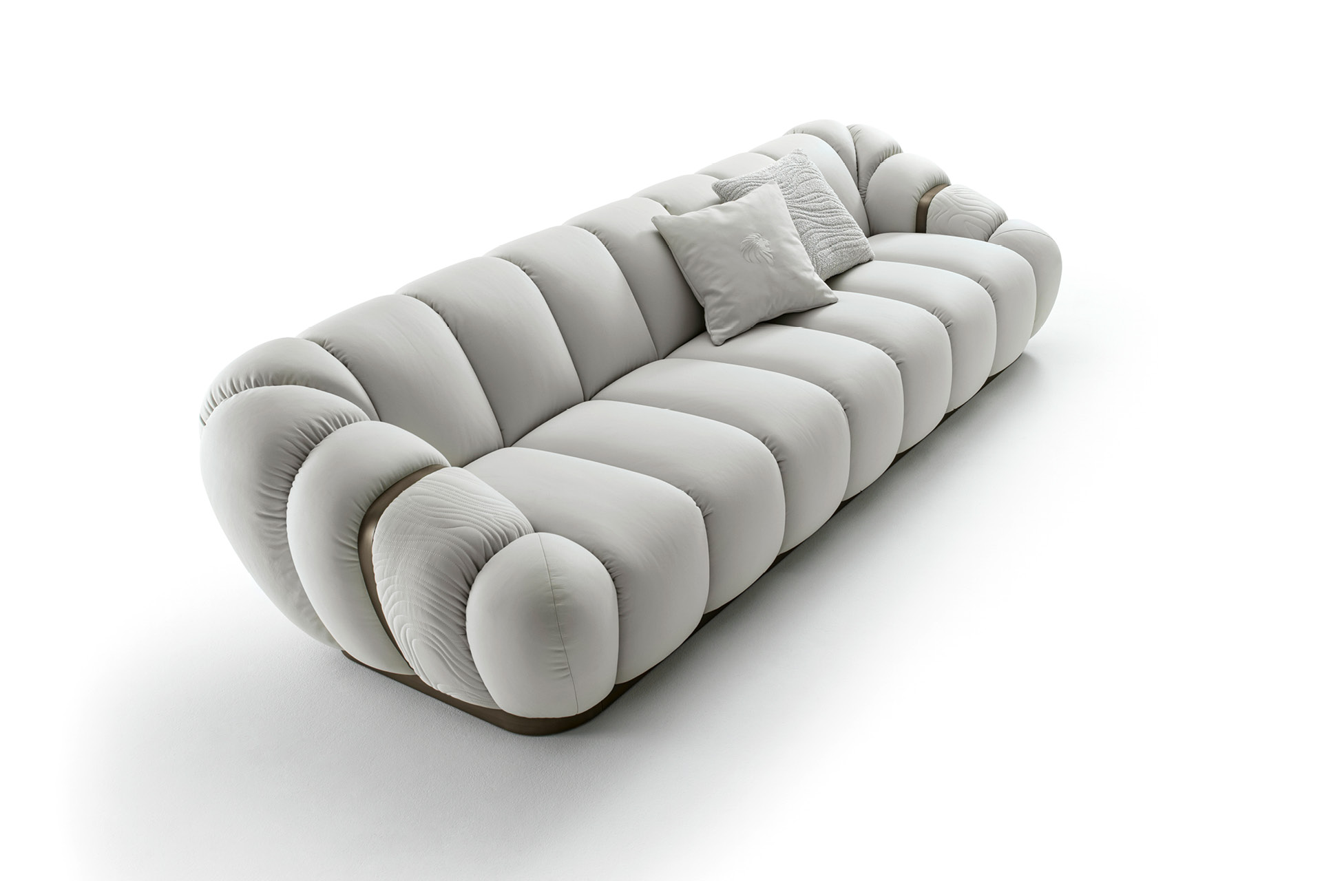 أريكة متوفرة بجلد من الدرجة الأولى، جلد النوبوك، جلد السحلية المطبوع، قماش المخمل أو الجلد الغزال. مقاعد أريكة والجوانب مع خياطة خاصة في رغوة البولي يوريثان ملفوفة بالريش. مساند الذراعين مبطنة. حواف أساسية ومعدنية على مساند الذراعين من الفولاذ المقاوم للصدأ البرونزي اللامع مع شعار جورجيو كلكشن. ارتفاع المقعد سم. 42