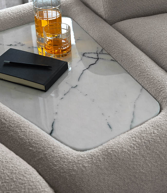 أريكة معيارية متوفرة بجلد من الدرجة الأولى، جلد النوبوك، جلد السحلية المطبوع، قماش المخمل أو جلد الغزال. مقاعد الأريكة والجوانب بخياطة خاصة من رغوة البولي يوريثان ملفوفة بالريش. مساند الذراعين مبطنة. حواف أساسية ومعدنية على مساند الذراعين من الفولاذ المقاوم للصدأ البرونزي اللامع مع شعار جورجيو كلكشن. ارتفاع المقعد سم. 42