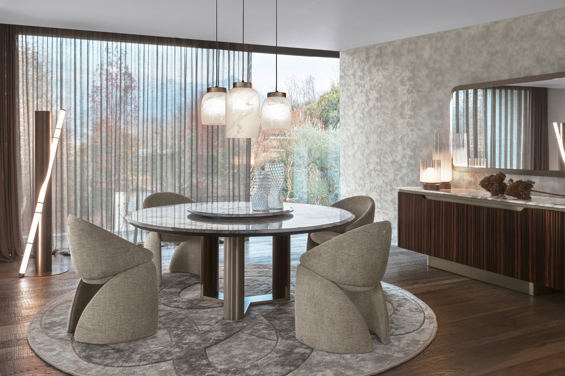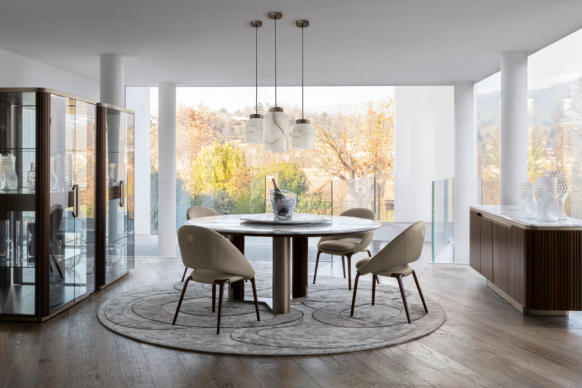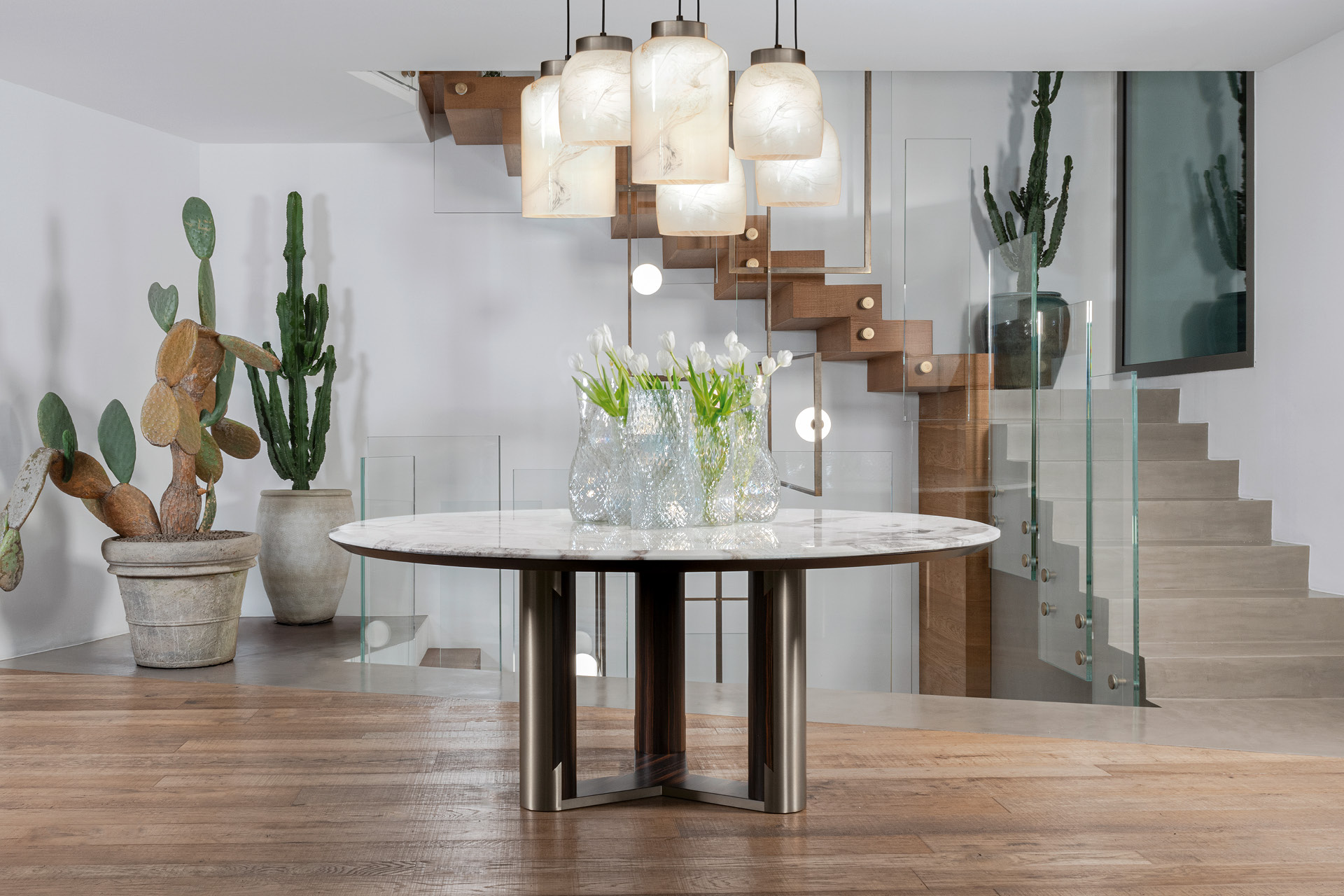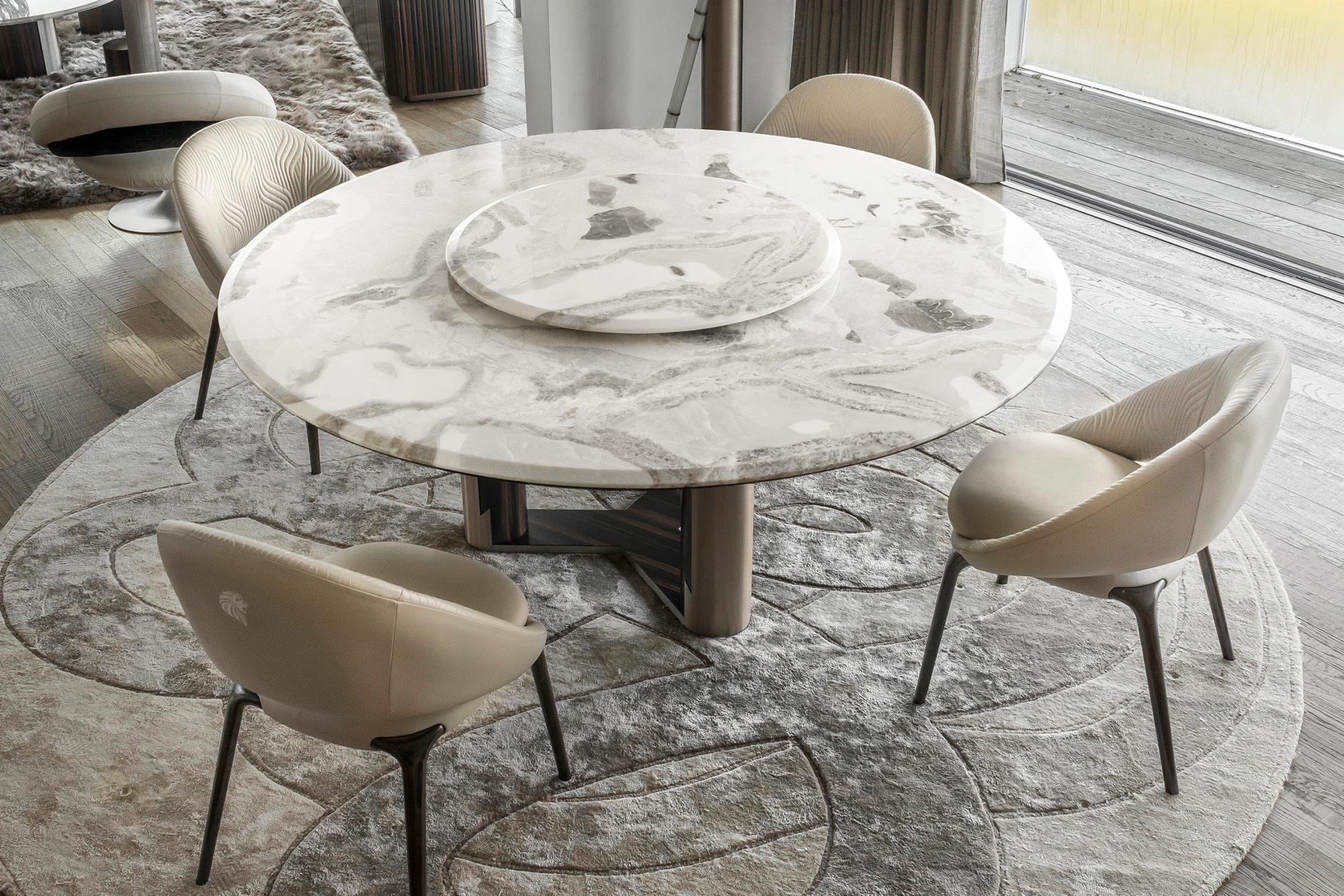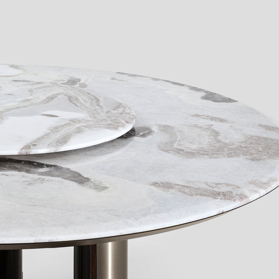 طاولة مستديرة مع سطح علوي مشطوف من الرخام الناميبي المحاري شديد اللمعان. 3 أرجل وقاعدة بمزيج من قشرة خشب الأبنوس الماكاسار المكسو بالتيتانيوم المجلفن والستانلس ستيل المجلفن المكسو بالتيتانيوم.