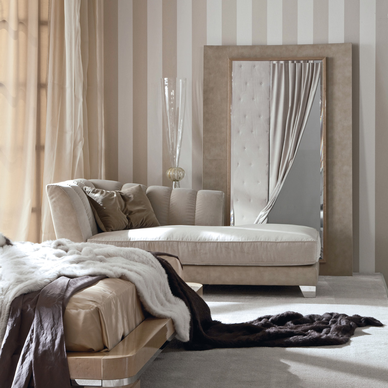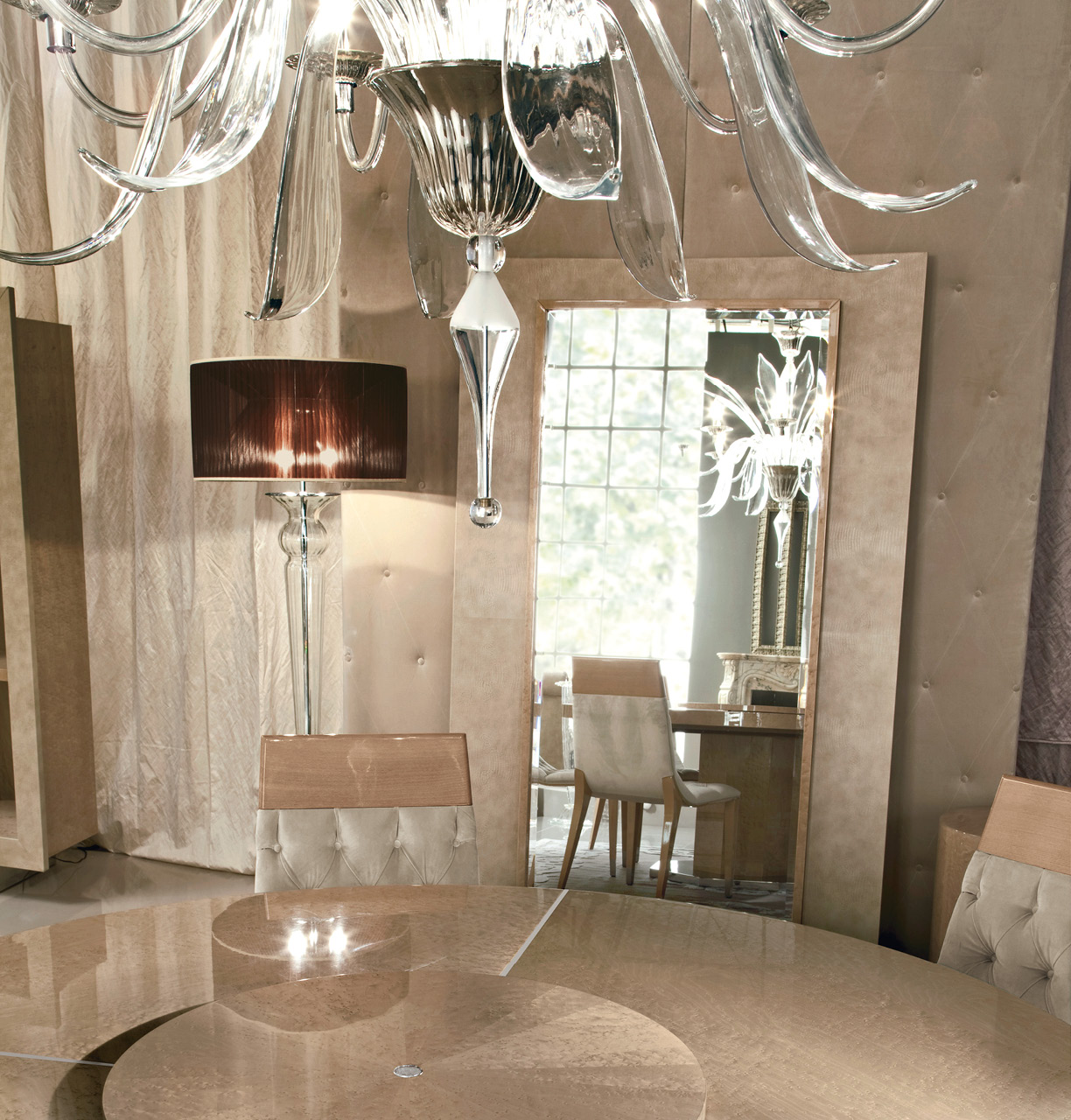 مرآة أرضية بتصميم مزيج من خشب القيقب المطلي بالشامبانيا وجلد الإغوانا المطبوع. تشطيب عالي اللمعان بوليستر.