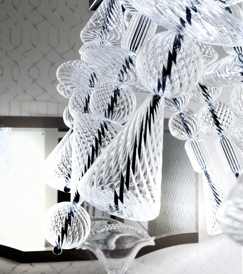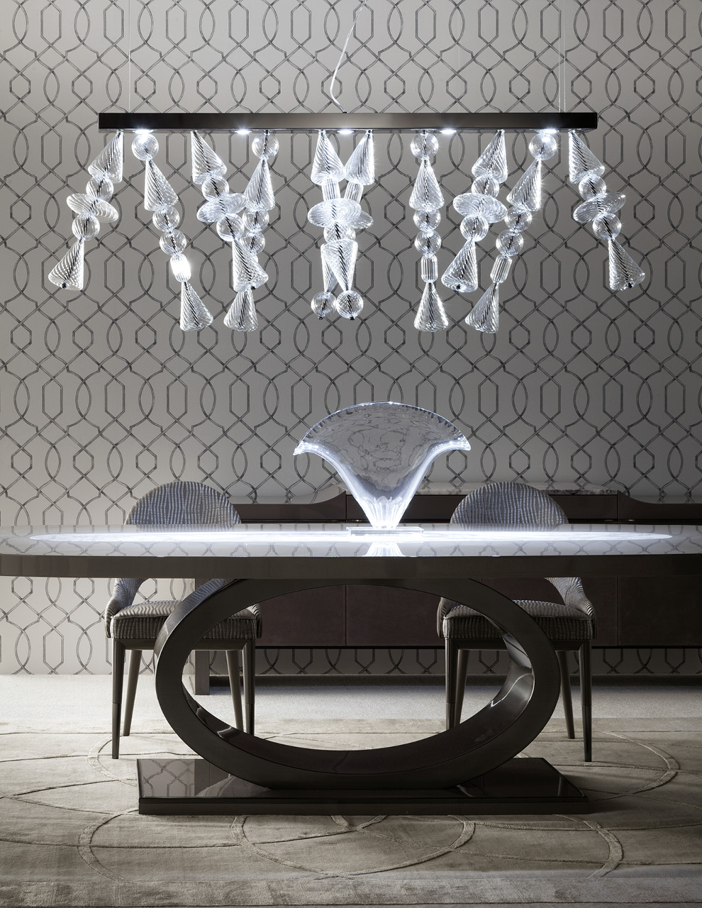 ثريا مستطيلة من زجاج مورانو البلوري المنفوخ. 9 أذرع من زجاج مورانو البلوري المنفوخ مع 9 أضواء LED مدمجة في قاعدة من النيكل الأسود الصلب.
