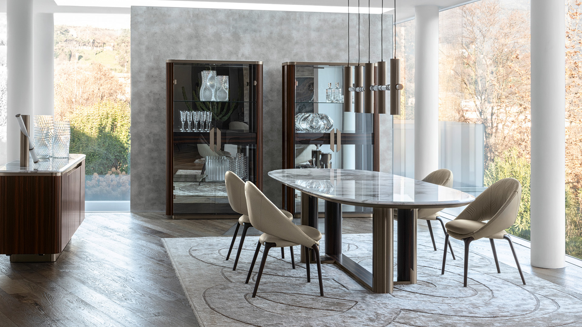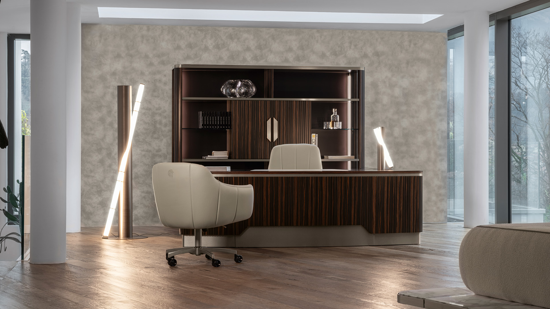 الفخامة الأصيلة لا يمكن رؤيتها، بل يمكن الإحساس بها: إنها العاطفة الكامنة في التفاصيل. إن الفخامة والأناقة والجاذبية هي السمات الرئيسية لمجموعة LUXOR. خشب خشب الأبنوس الماكاسار الذي تم اختياره ليكون بطل المجموعة بلمسة نهائية خاصة مشبعة بالألوان يعكس روعة جمالية صنع في إيطاليا بعروقه البنية الداكنة الدافئة. ويقترن عمق لون الخشب بشكل راقٍ مع رخام المحار الناميبي شديد اللمعان الذي يتناسب تماماً مع ظلال LUXOR التي تحتضن الألوان. وأخيراً، فإن التفاصيل المصنوعة من الفولاذ المقاوم للصدأ ”تيتانيوم“ المجلفن تؤطر المناطق الرئيسية في المجموعة: غرفة المعيشة، وغرفة الطعام، وغرفة النوم، والمكتب.