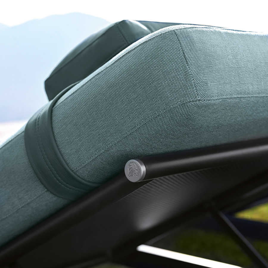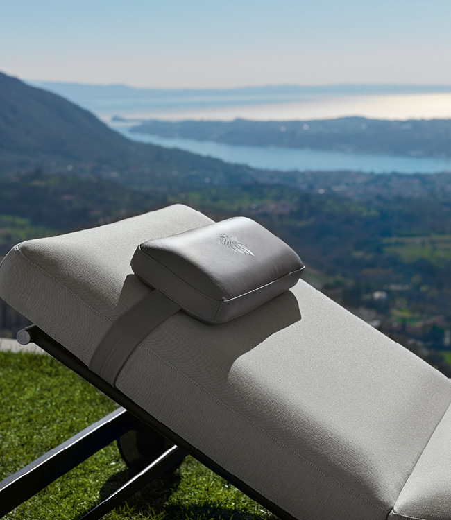 سرير تشمس خارجي متوفر بنسيج معالج بشكل خاص أو جلد من الدرجة الأولى. مسند رأس مطرز بشعار جورجيو كلكشن. هيكل من المعدن الأسود اللامع مع شعار جورجيو كلكشن وإمالة قابلة للتعديل.