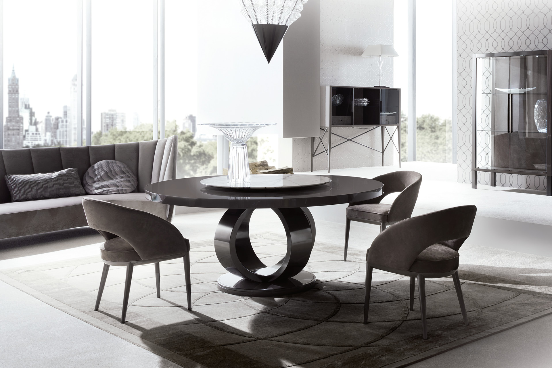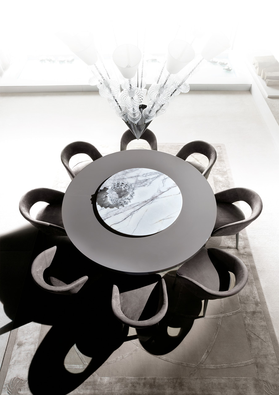 طاولة دائرية مصنوعة من طلاء عالي اللمعان بلون رمادي بوليستر. الجزء العلوي ثابت مع قاعدة من الفولاذ المطلي بالنيكل الأسود.