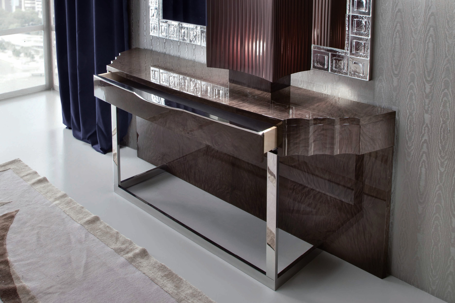 كونسول مصنوع من توليفة من خشب الجوز التامو الياباني بلمعان عالٍ من البوليستر وأرجل أمامية من الفولاذ المقاوم للصدأ المصقول. يحتوي على 2 درج ممتد بالكامل بقاعدة من القماش الفلفت.