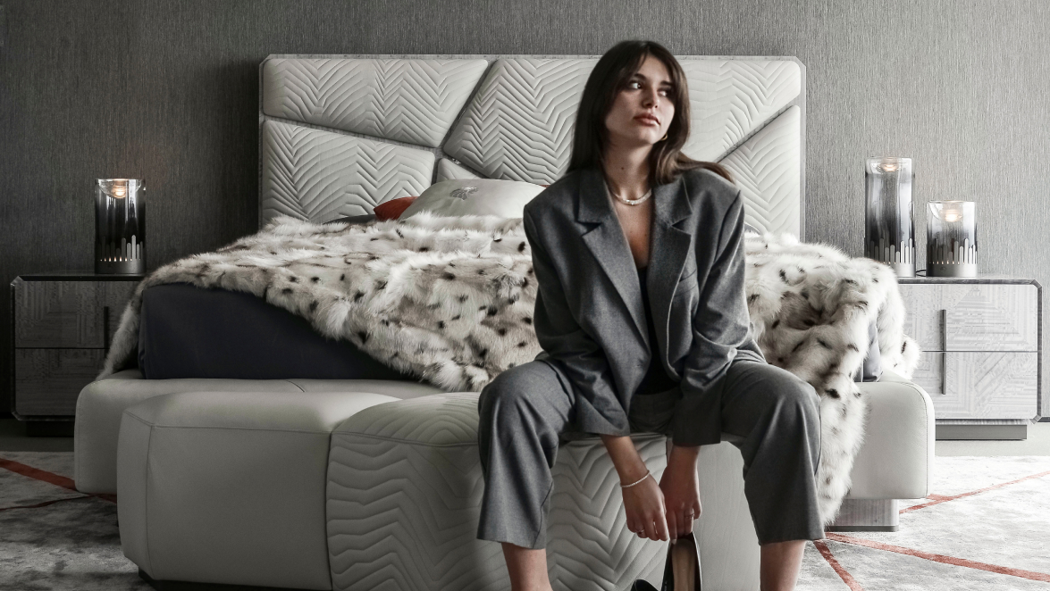 Moonlight bed stands out for its modern attitude and its impressive geometries, resulting in a welcoming and suggestive atmosphere. The headboard is a statement of contemporary design, made in precious Tasmanian curly Eucalyptus veneer with inserted quilted upholstery. The same headboard pattern also characterizes Moonlight bench, an exclusive and versatile piece that creates with its details a fascinating interplay of lines.