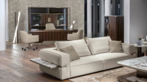 A dedicated meeting area completes the project with iconic pieces from Charisma collection: such as the round table, side chairs and bar unit. The penthouse also includes a home office, furnished with the functional and sophisticated design of Charisma desk together with the occasional swivel chairs around the sleek cocktail table.