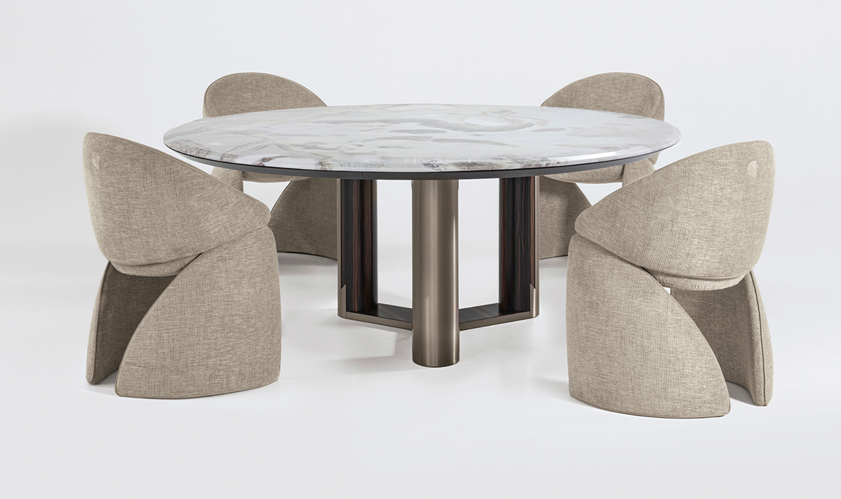 With its sturdy structure and minimalist design, Mirage chair is highly appreciated in luxury interiors that focus on rich materials and discreetly sophisticated atmospheres. Its balanced geometry and combination of fine fabrics make it a refined presence that enhances any dining table.