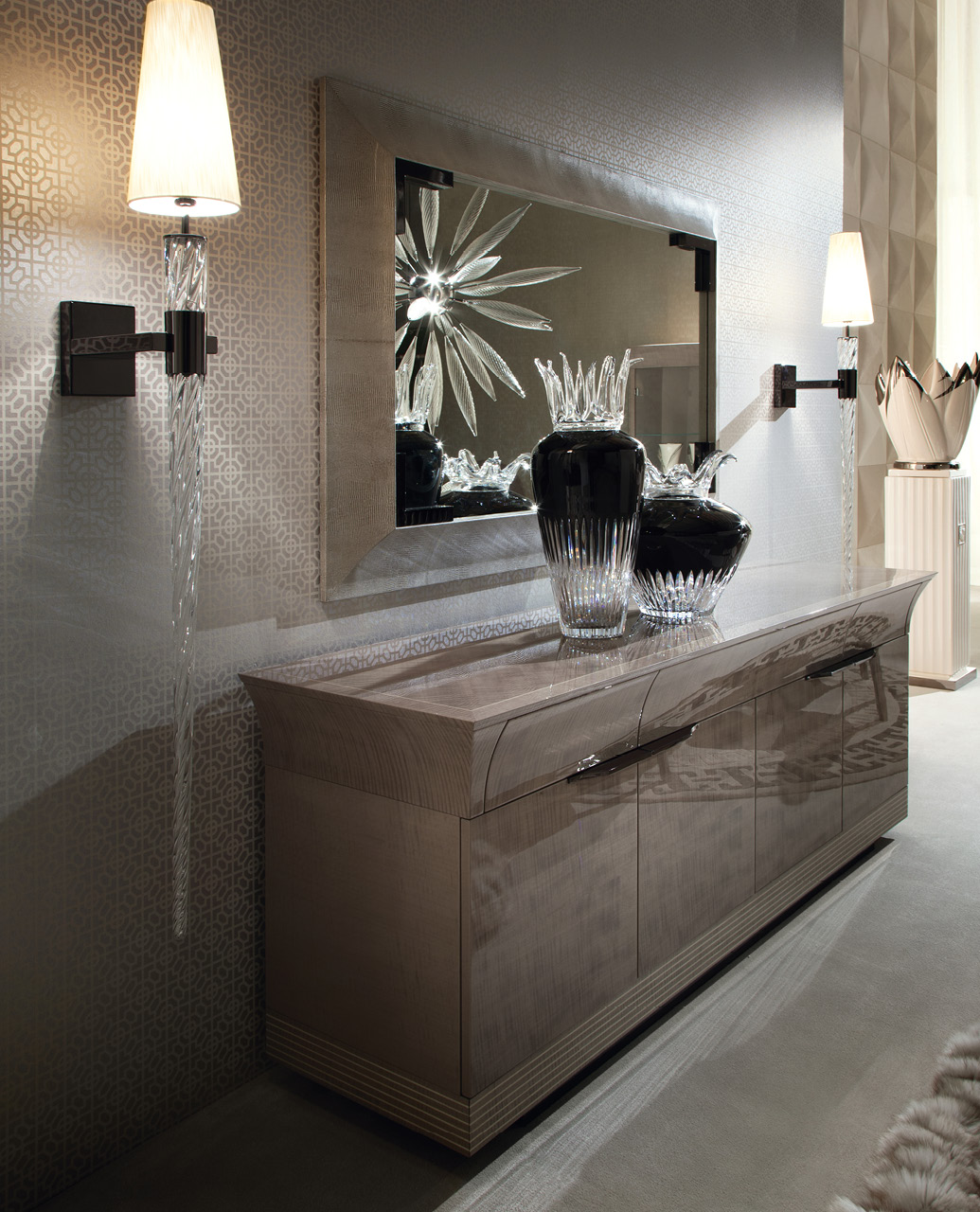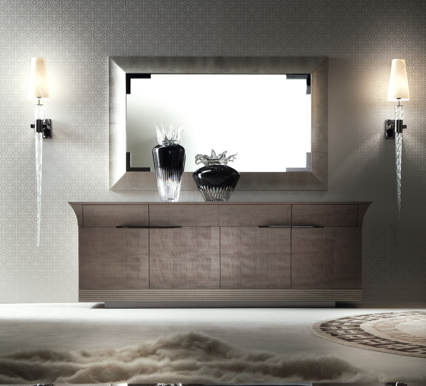 Buffet à 4 portes + 3 tiroirs à extraction totale avec fond en cuir imprimé lézard argenté, plaqué sycomore africain tigré avec finition polyester brillant, poignées et base en acier inoxydable avec finition gris foncé tempête. Fine incrustation d'érable blanc sur le dessus. 2 étagères internes en verre réglables.