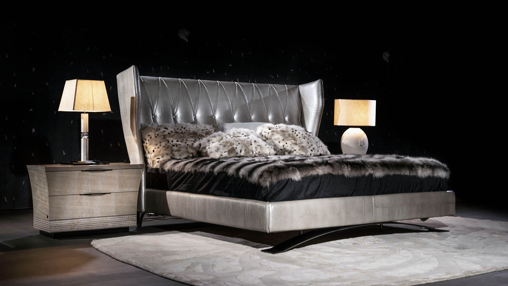 Table de nuit en placage de sycomore africain tigre avec finition polyester haute brillance et poignées et base en acier inoxydable finition gris foncé orage. 2 tiroirs à extension totale avec fond en cuir imprimé lézard argenté. Incrustation de lignes fines en érable blanc dans le haut et dans la base.