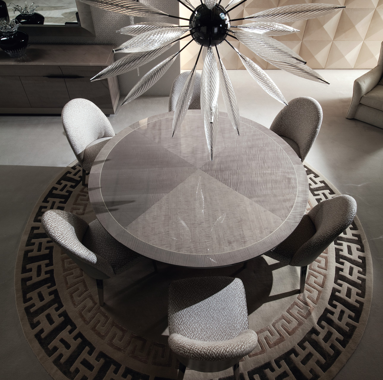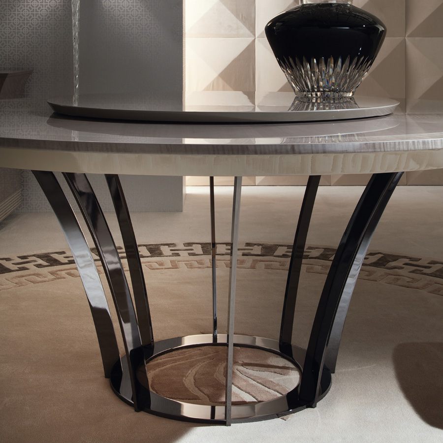 Table ronde plaquée sycomore africain tigré avec finition polyester brillant. Plan fixe avec base en acier inoxydable et finition gris foncé tempête. Avec incrustation fine en érable blanc sur le plan.