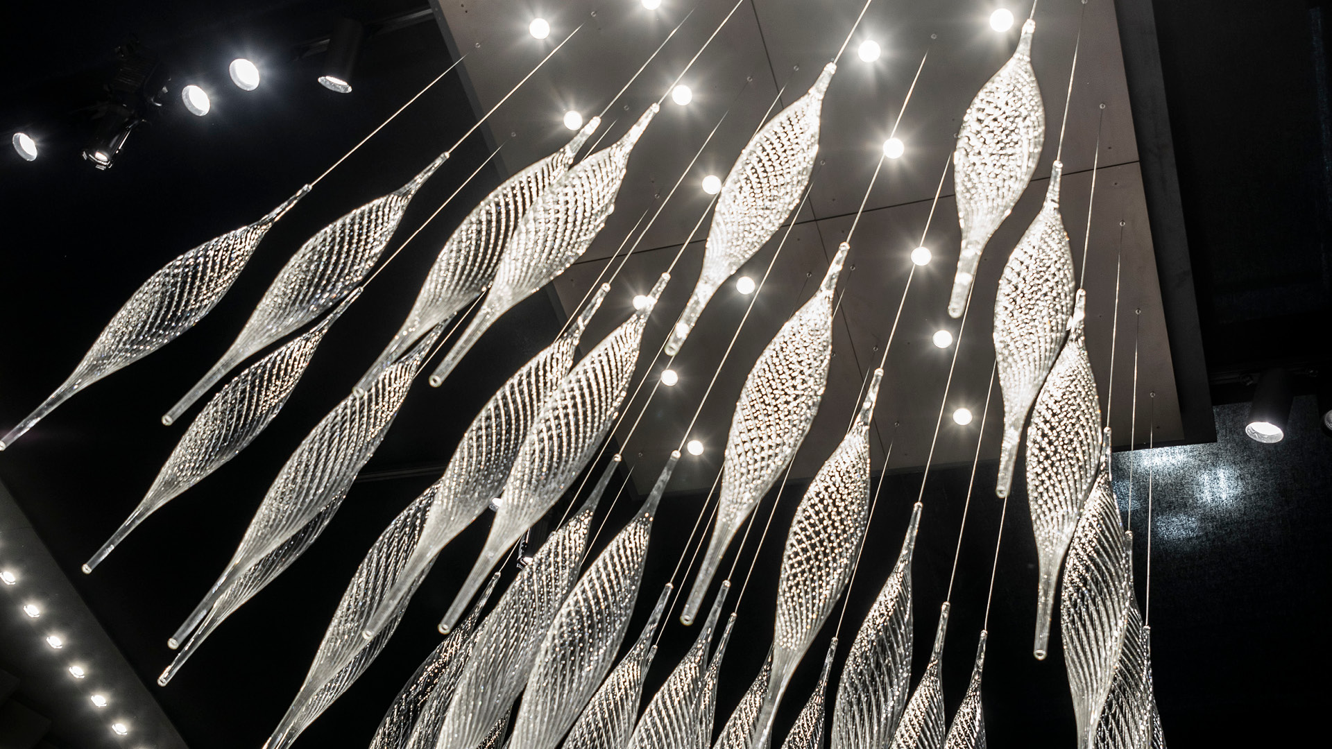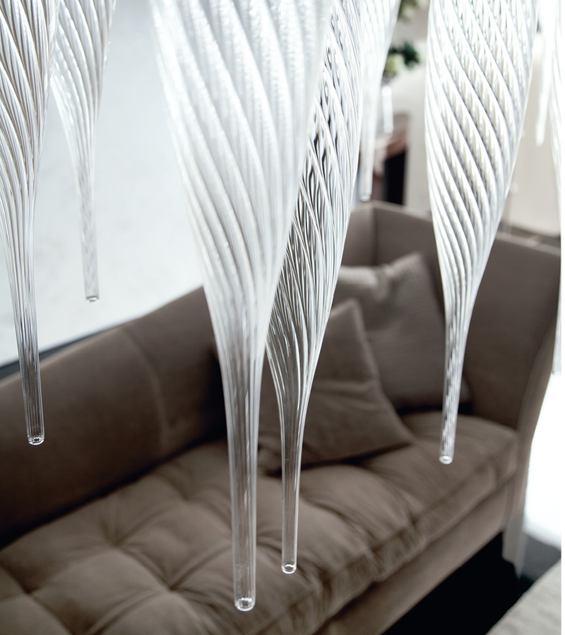 Élément carré pour lustre composé de : - 6 LED - 9 verres soufflés vénitiens « Murano » transparents Structure en acier inoxydable couleur bronze