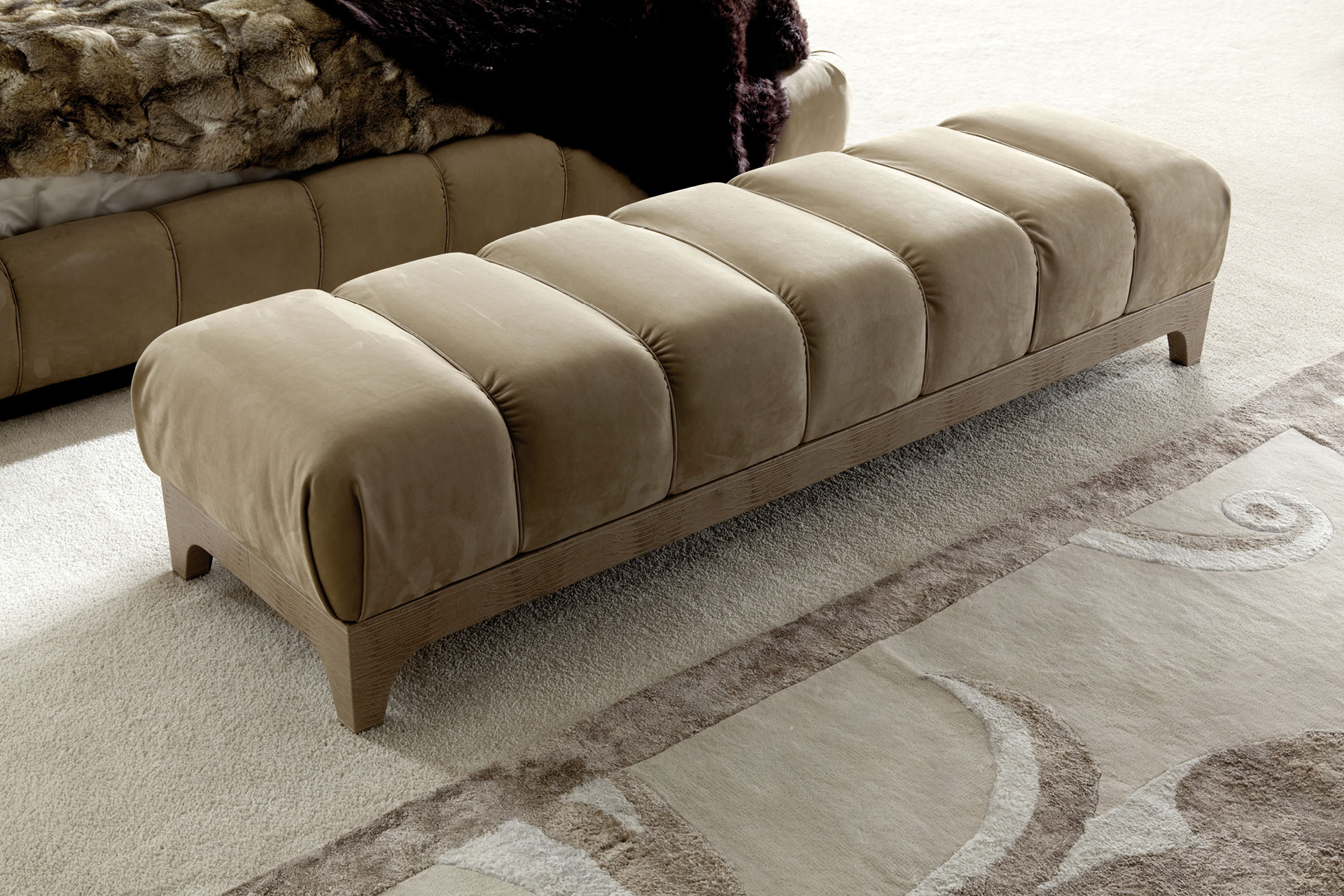 Banquette rembourrée disponible en cuir de qualité supérieure, cuir nubuck, cuir imprimé lézard, velours ou suède.