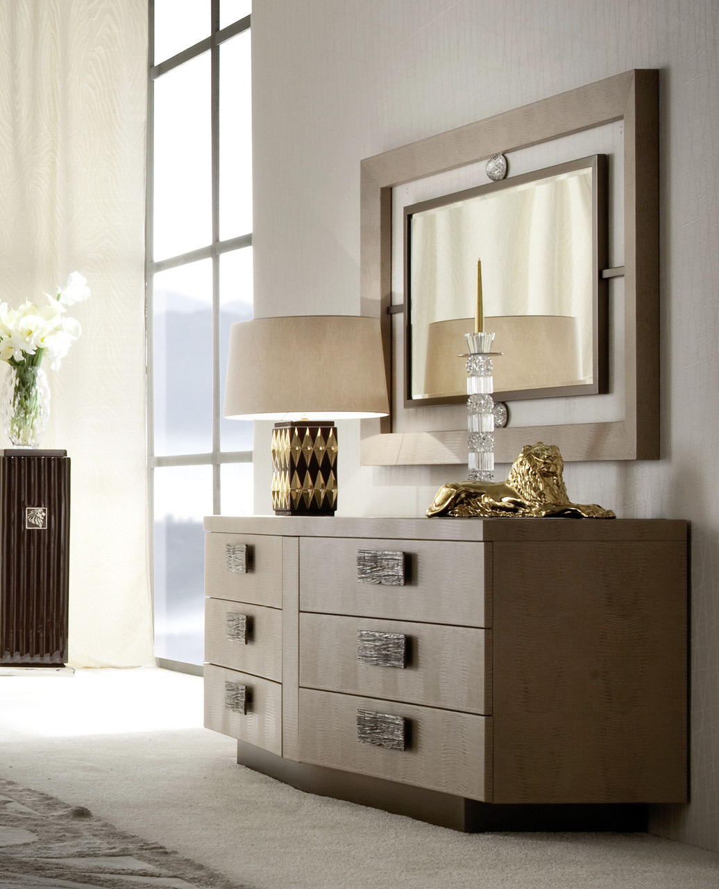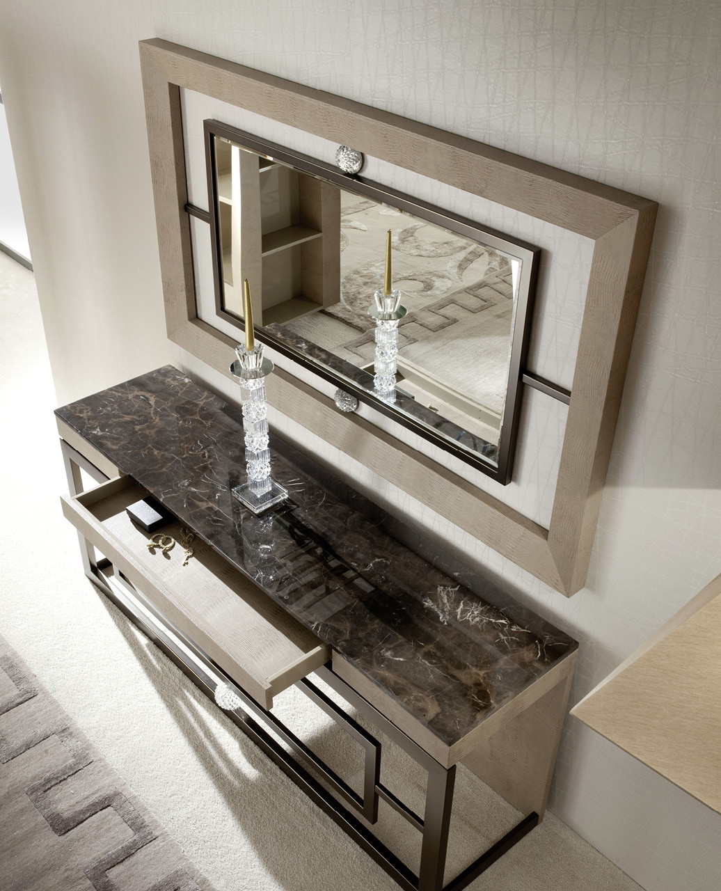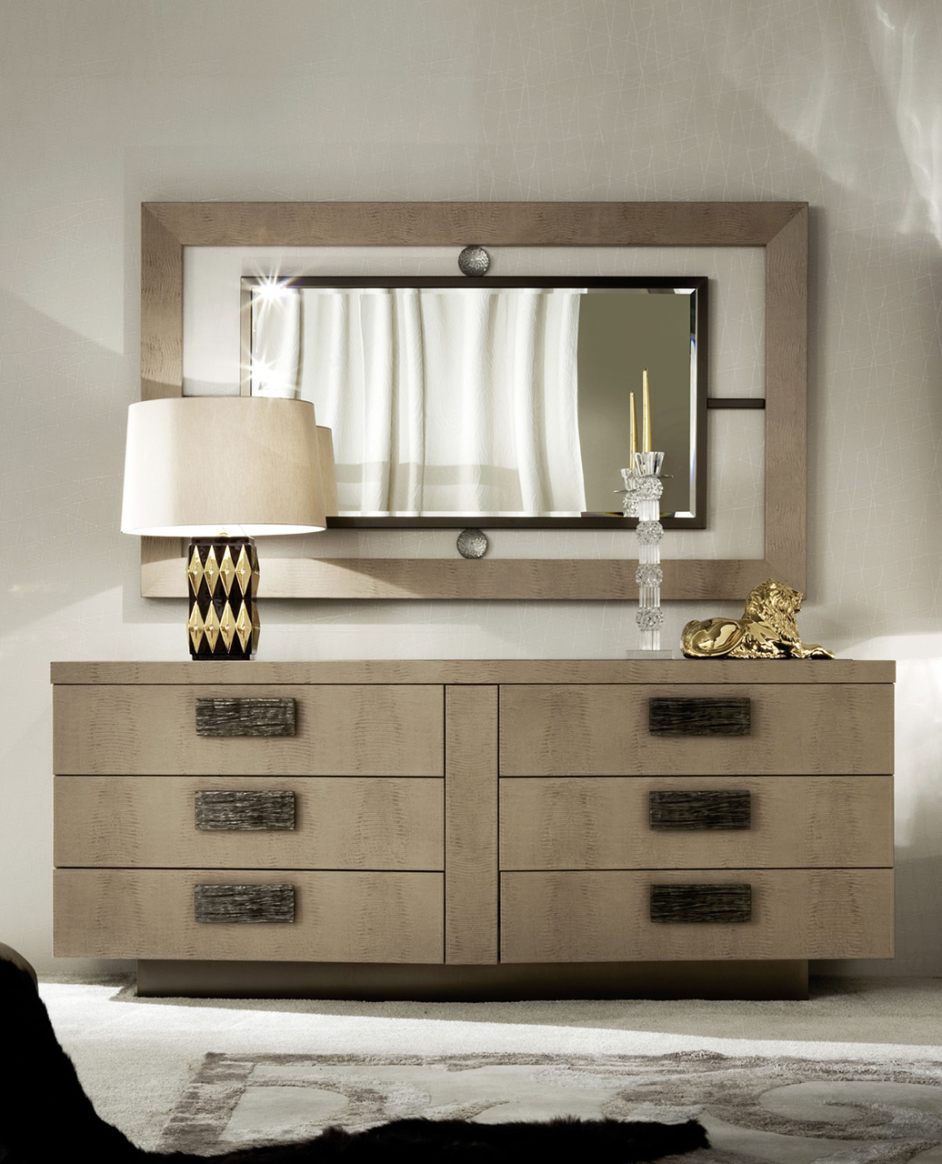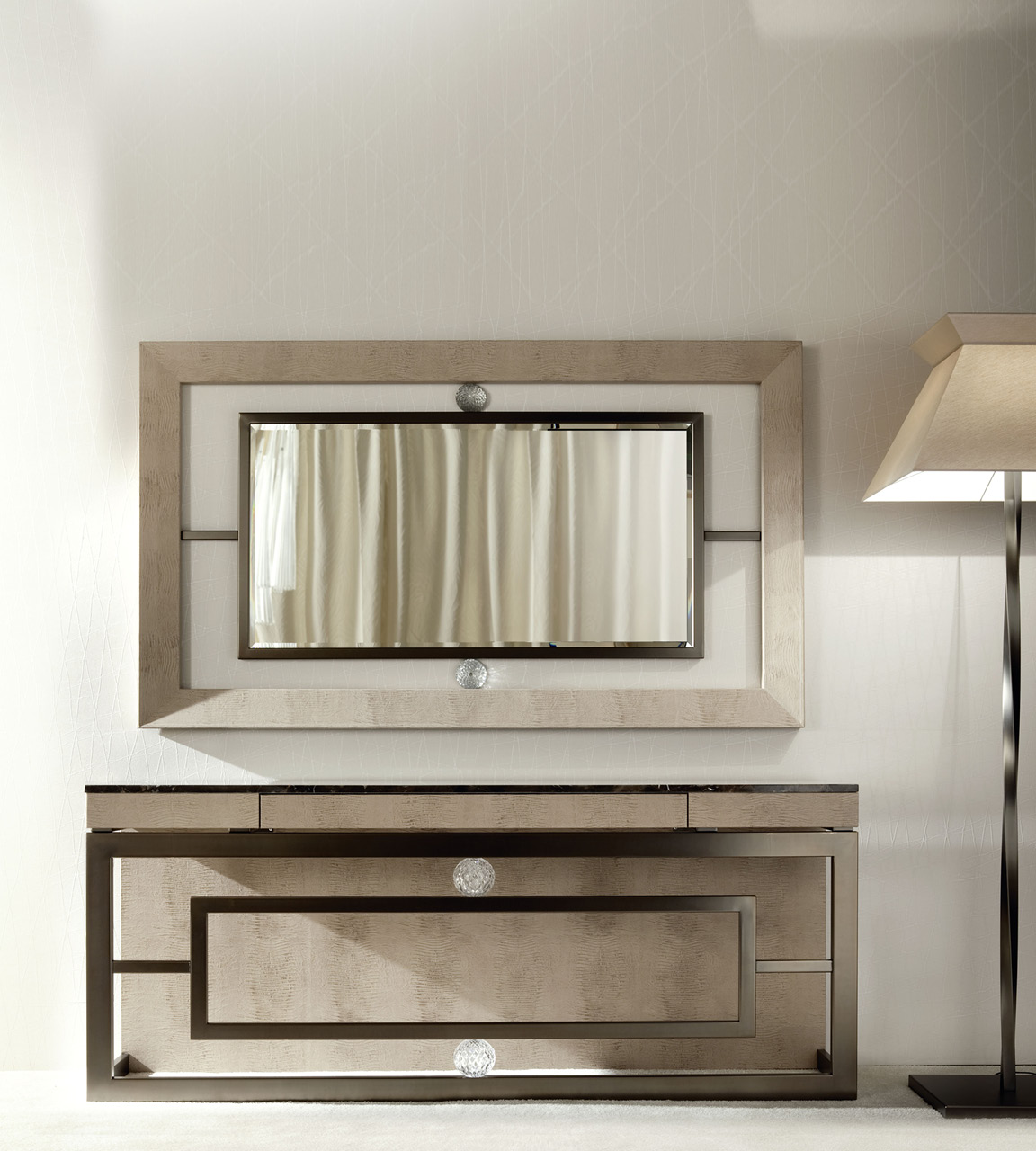 Miroir avec combinaison de cuir imprimé tatou, laiton couleur bronze, sphères de cristal « Murano » et miroir biseauté.