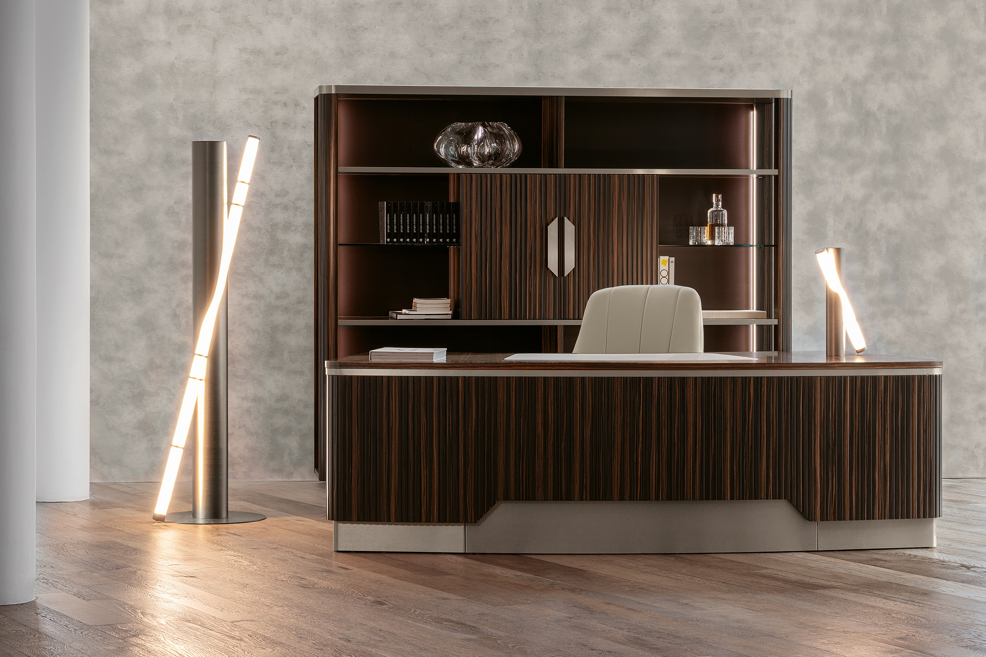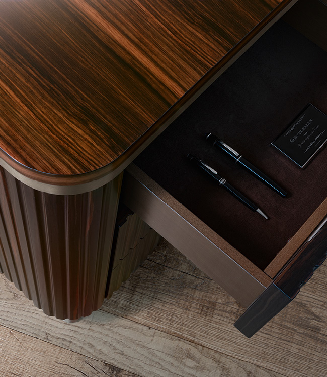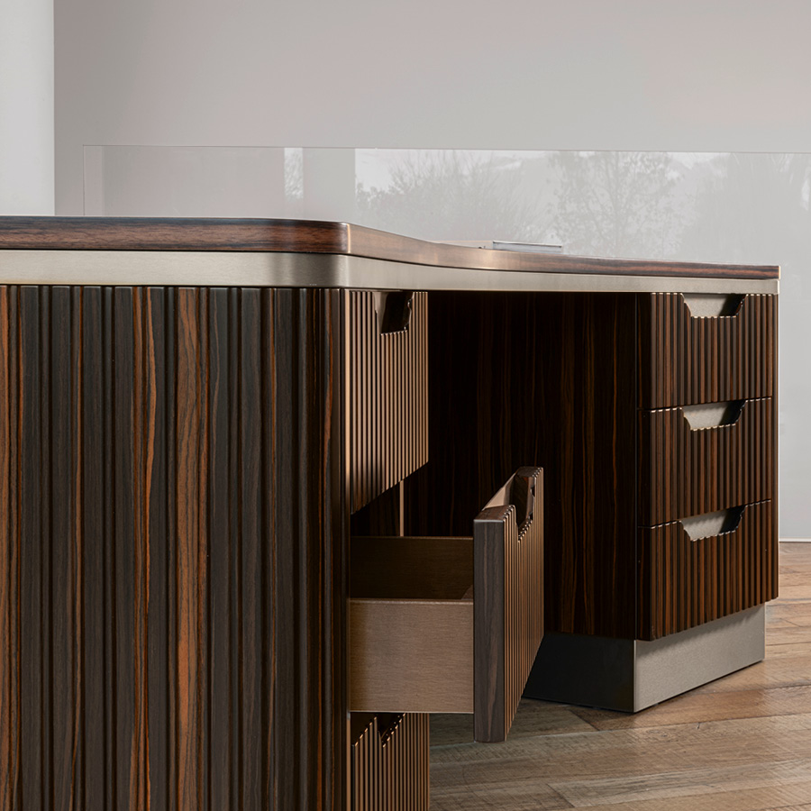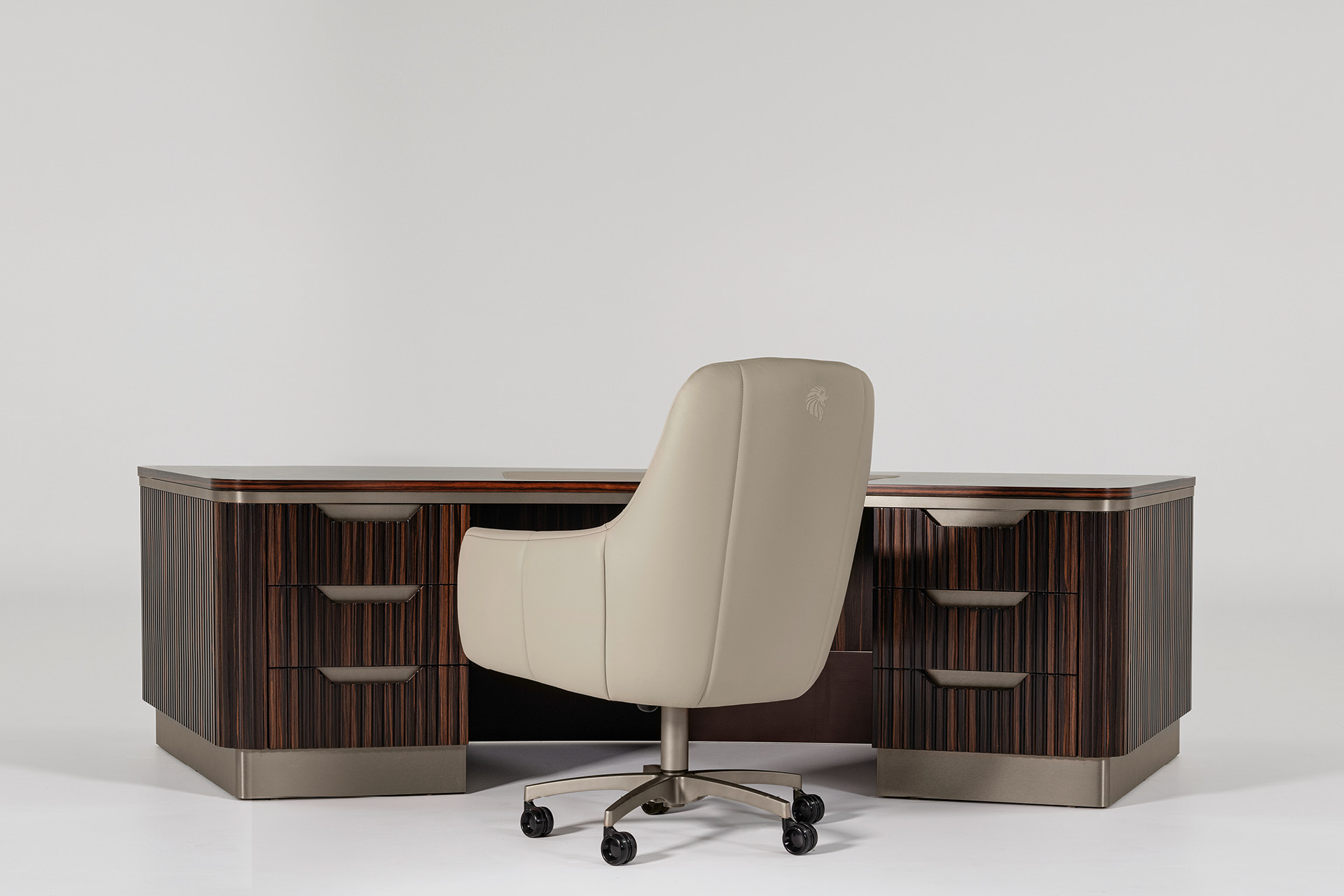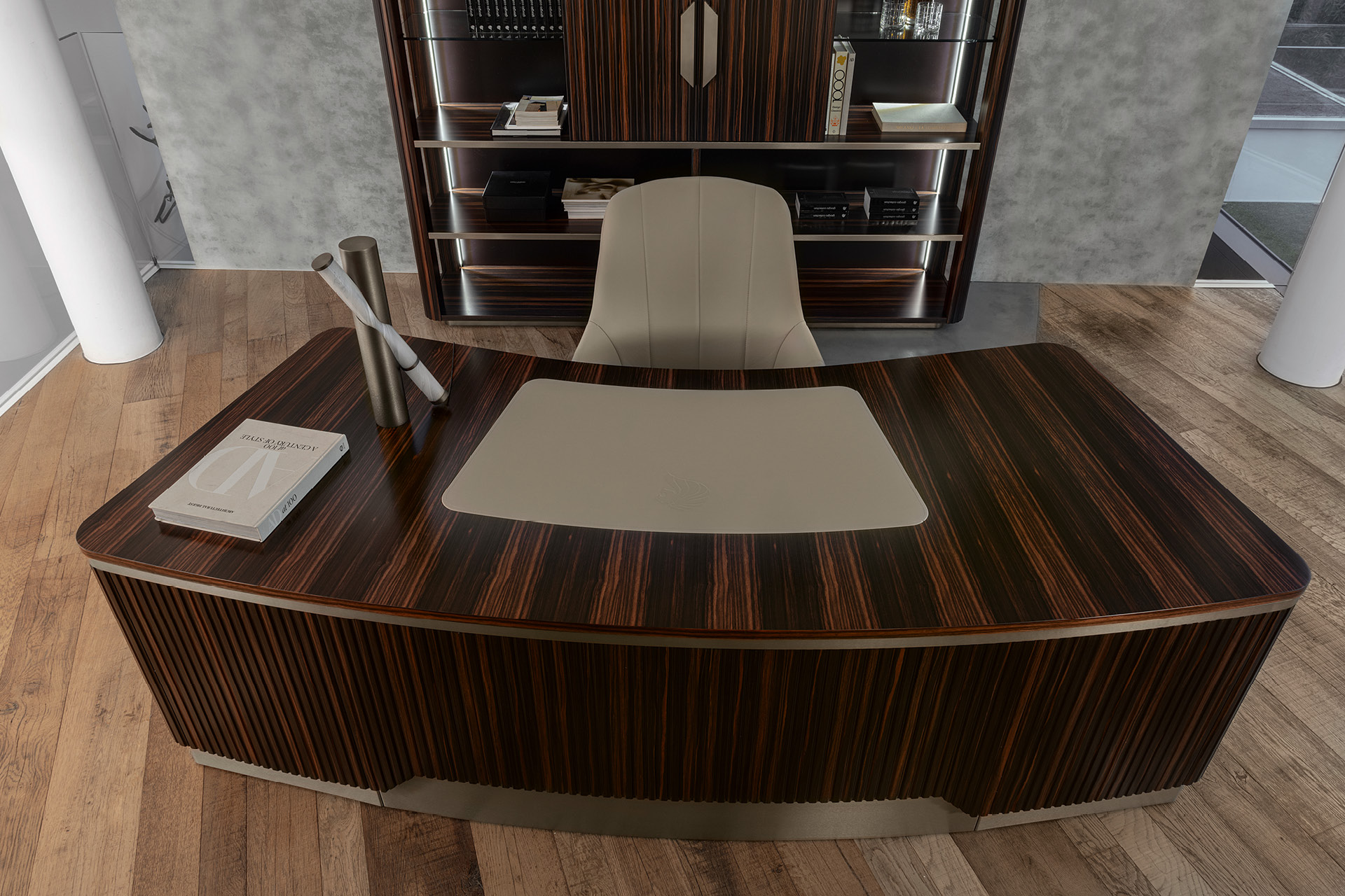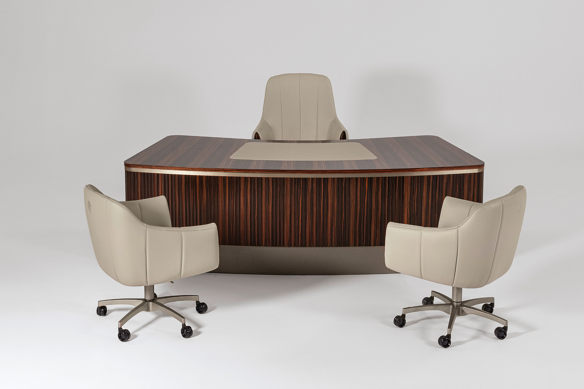 Bureau présidentiel courbe en placage d'ébène de Makassar satiné nervuré. Dessus avec sous-main en cuir inséré portant le logo de Giorgio Collection. 2 tiroirs à extension complète avec fond en tissu velours et 1 tiroir pour dossiers de chaque côté. Base, poignées et détails en acier inoxydable finition titane galvanisé satiné.