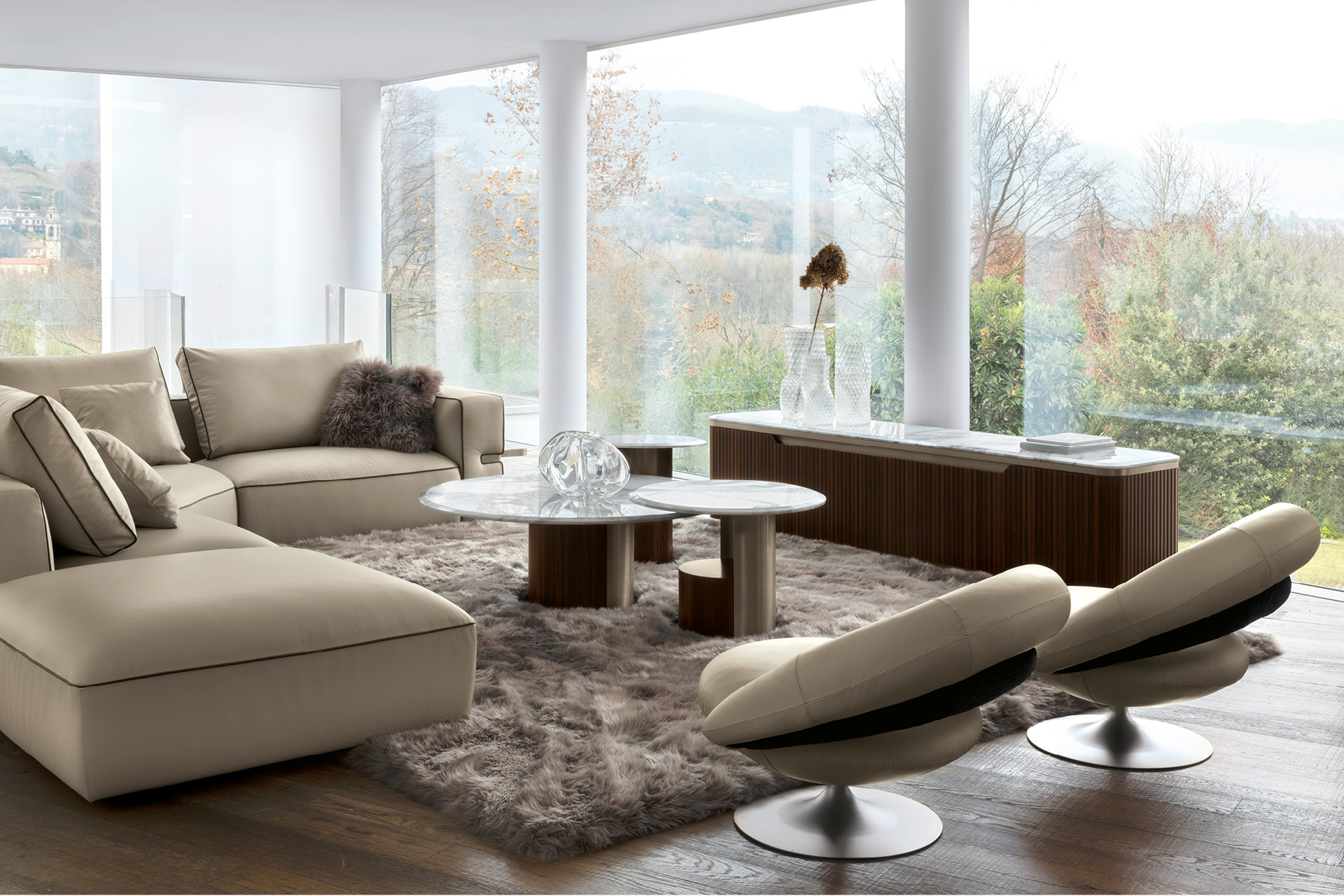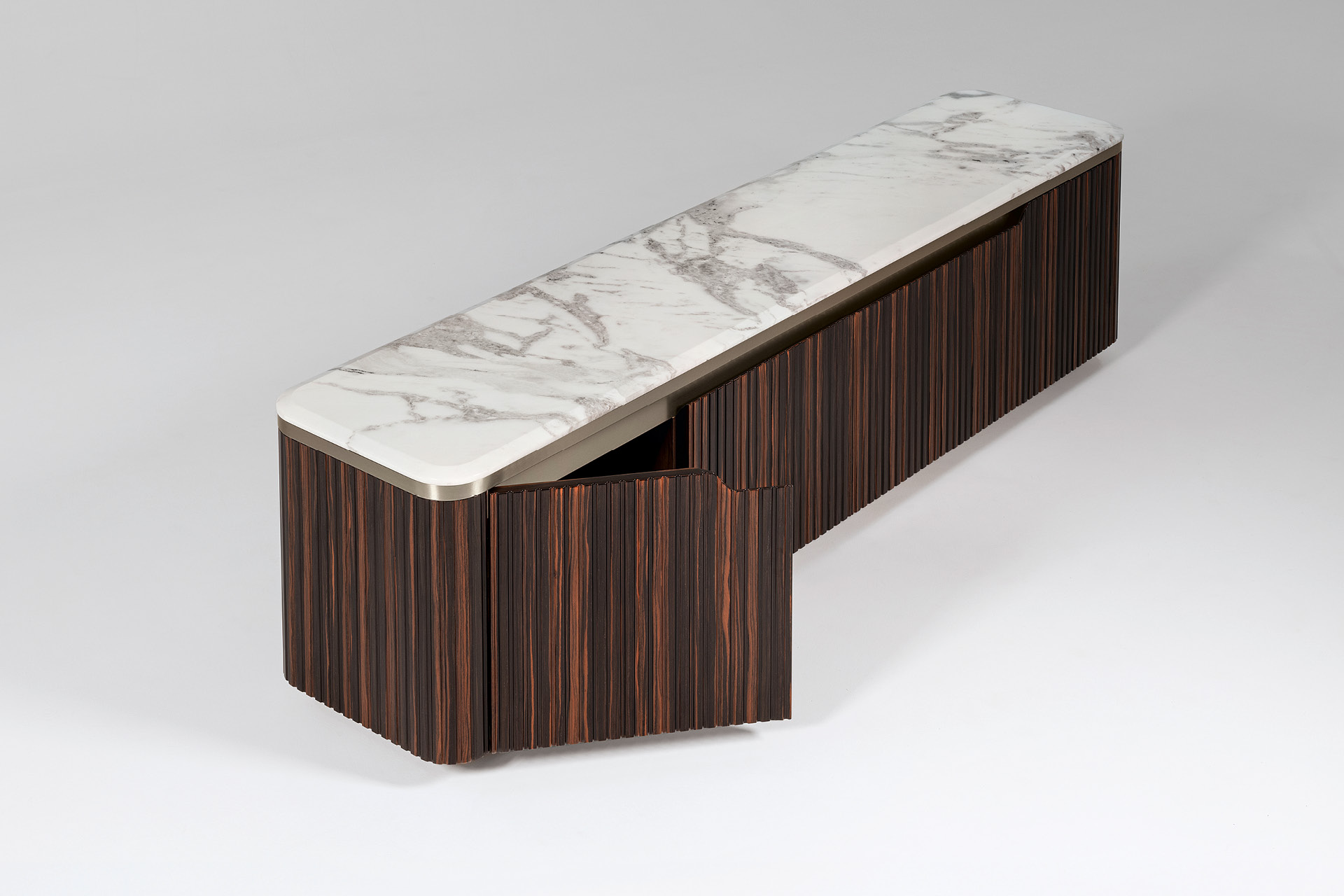 Base pour téléviseur en placage d’ébène de Makassar satiné nervuré. Plateau biseauté en marbre Oyster de Namibie à finition haute brillance. Base et détails en acier inoxydable finition titane galvanisé satiné. 4 portes en bois avec 3 étagères intérieures réglables en verre trempé.
