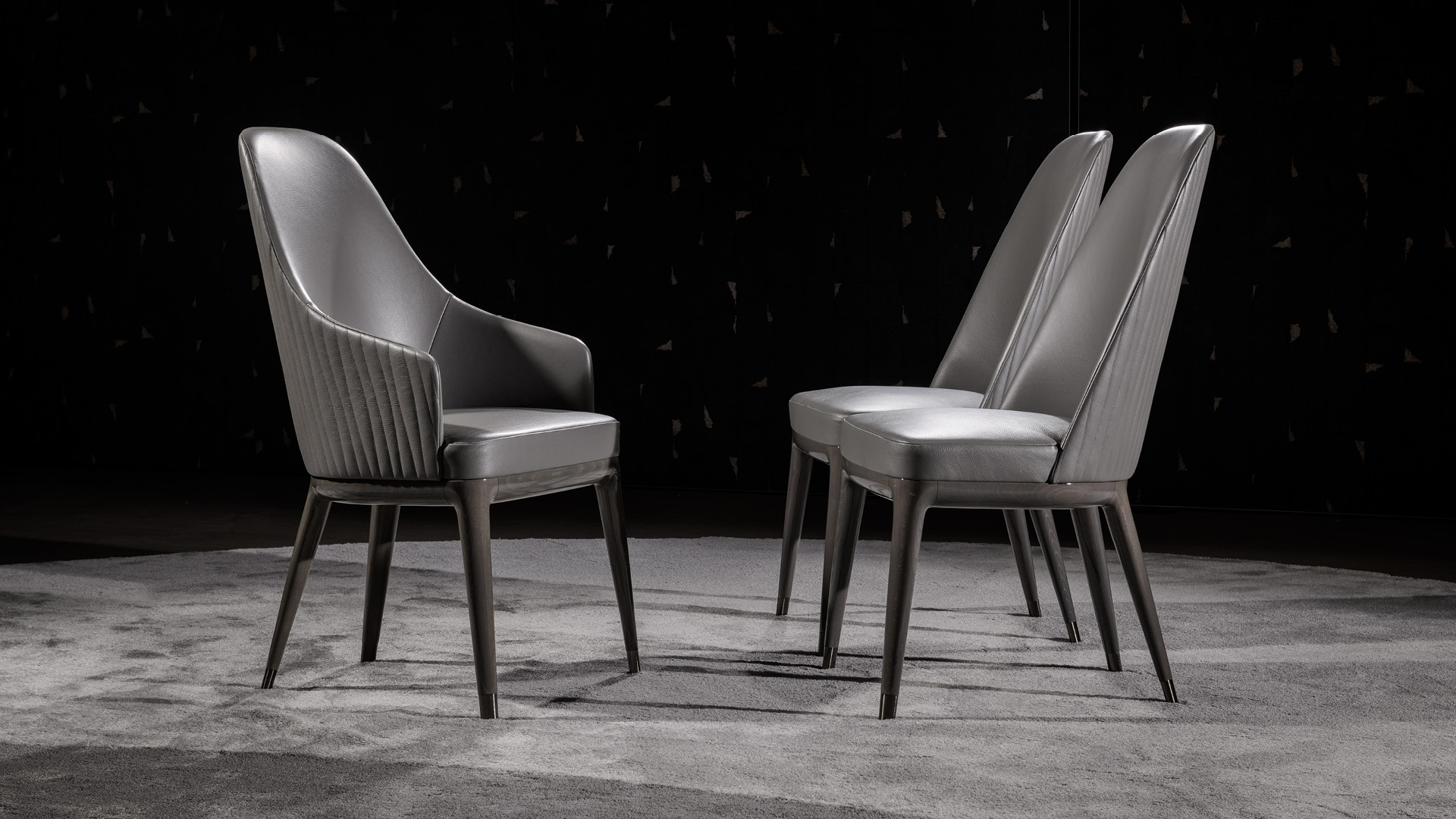 Fauteuil entièrement rembourré en hêtre massif. Dossier en cuir matelassé de qualité supérieure, cuir nubuck, cuir imprimé lézard, velours ou suède. Base en bois avec logo Giorgio Collection. 4 pieds avec détails en acier inoxydable nickel noir satiné.