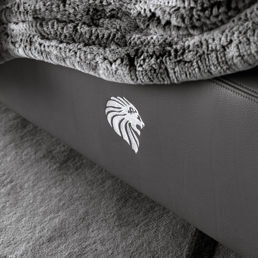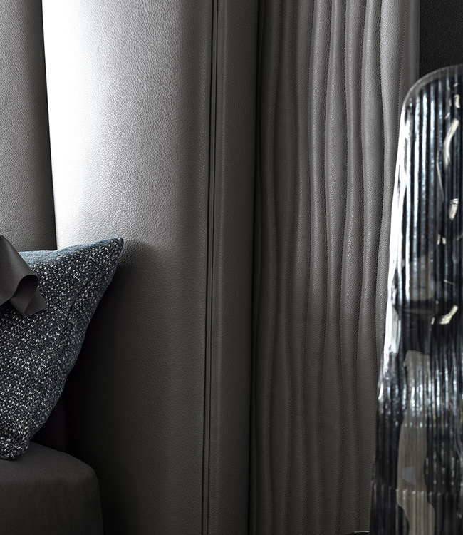 Lit entièrement rembourré en cuir de premier choix, cuir nubuck, cuir imprimé lézard, velours ou tissu suédé. Plateforme avec logo Giorgio Collection. Tête de lit matelassée. Pieds en acier inoxydable nickel satiné noir.