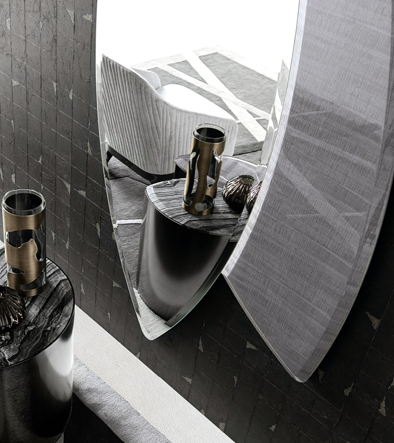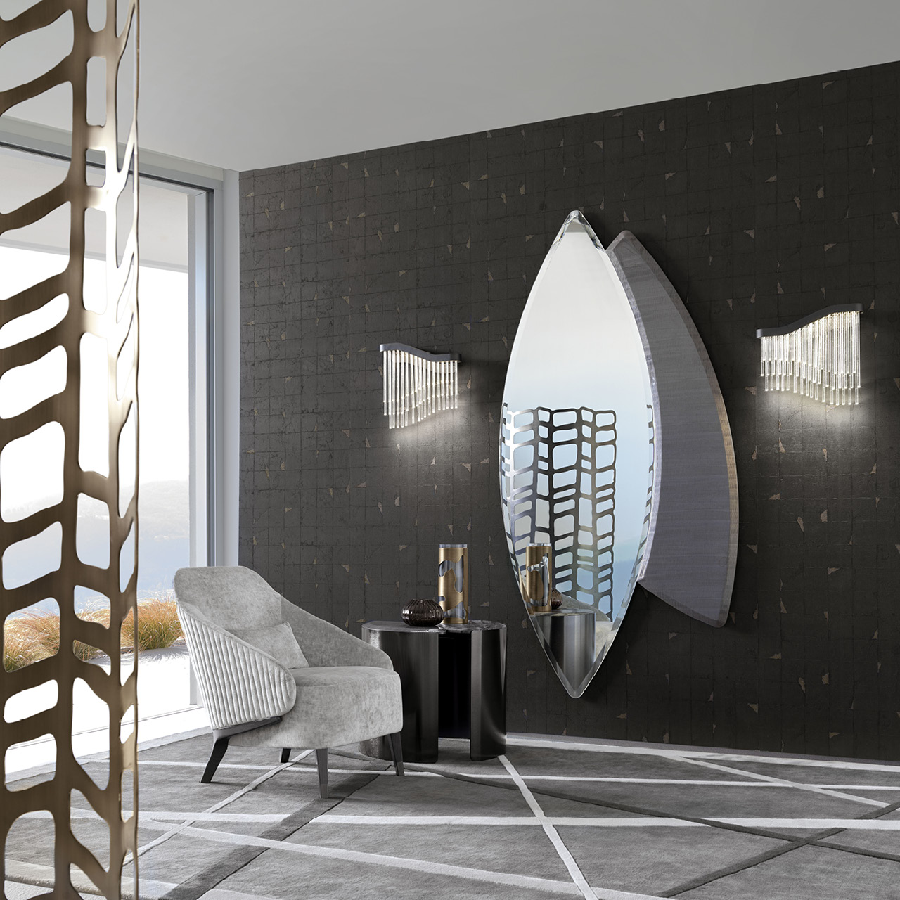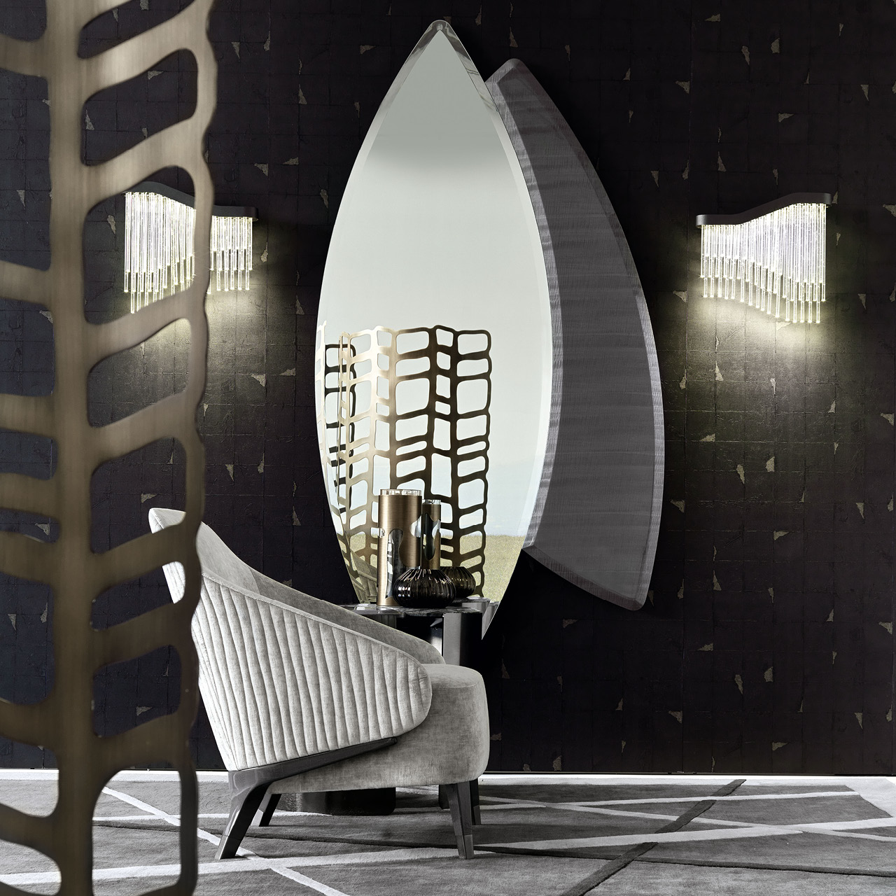 Miroir ovale de sol avec combinaison de verre biseauté et de placage movingui avec motif Madagascar, finition en polyester brillant.