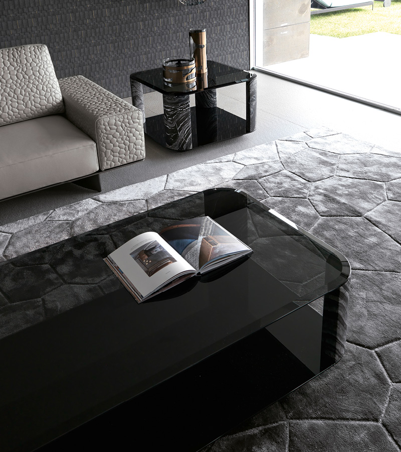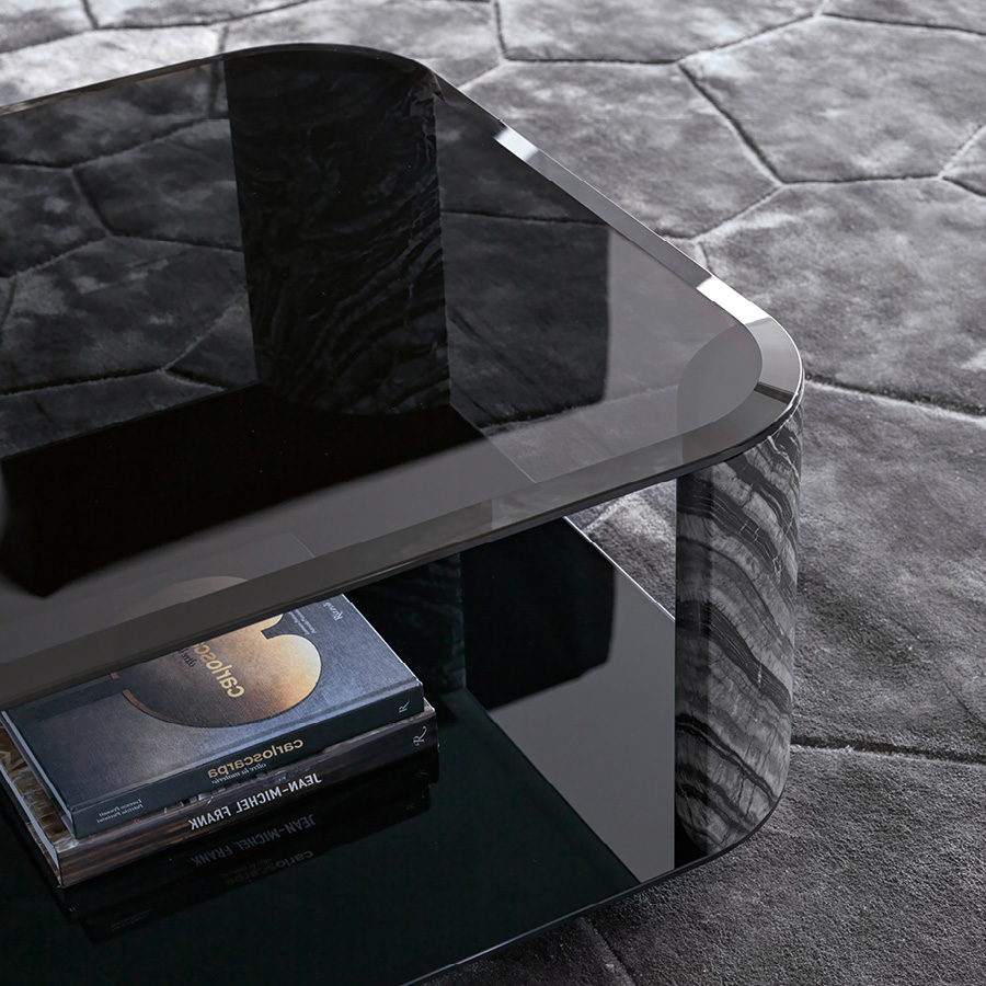 Table basse rectangulaire avec plateau et base en verre trempé biseauté fumé. 4 pieds en marbre massif mat noir Kenya.