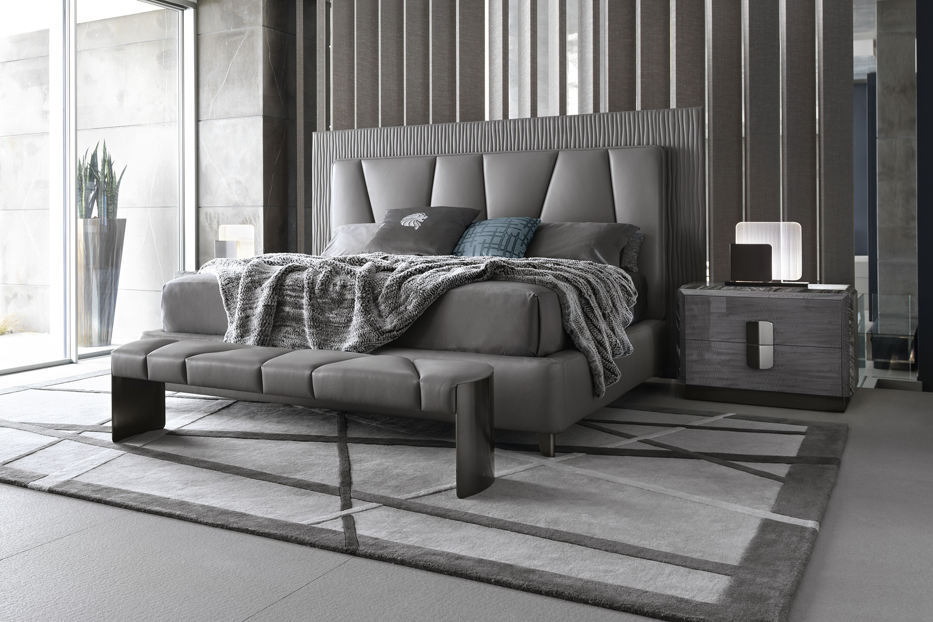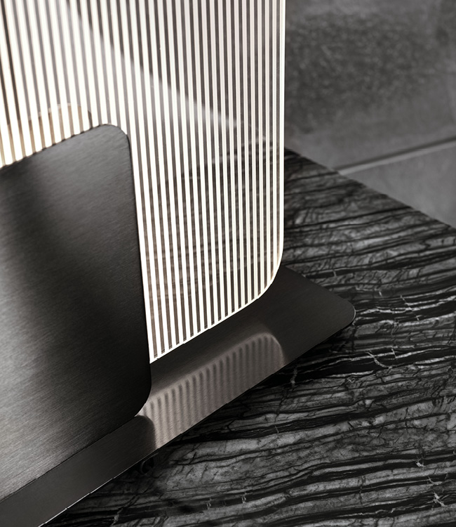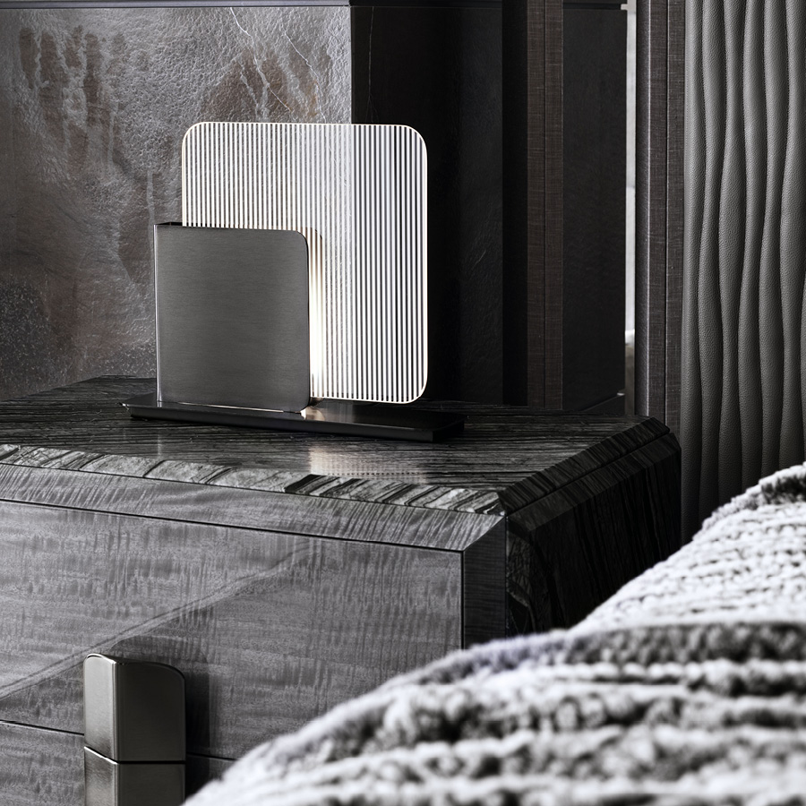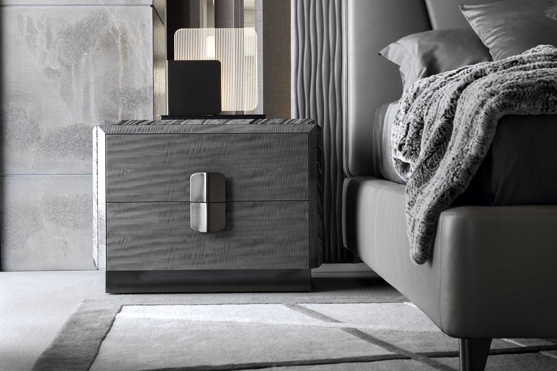 Table de nuit en placage Mowinghi figuré de Madagascar en finition polyester haute brillance. Dessus et côtés en marbre noir du Kenya. Base et poignées en acier inoxydable nickel noir satiné. 2 tiroirs à extension totale avec partie inférieure en tissu velours.