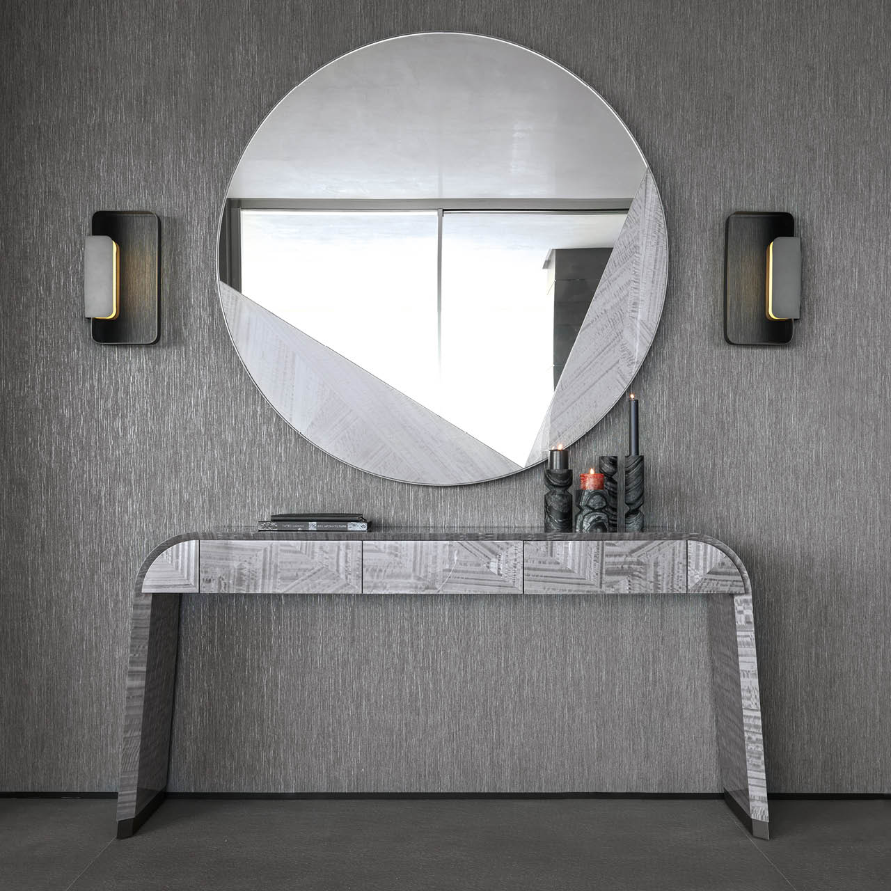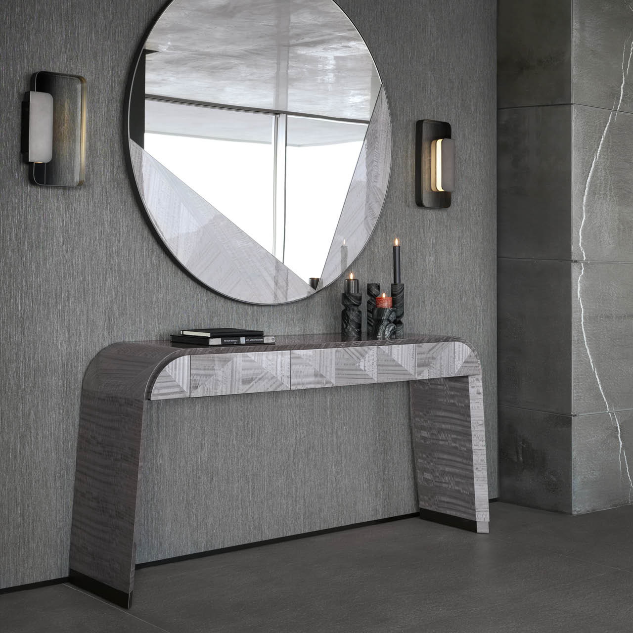 Console incurvée en placage d'Eucalyptus bouclé de Tasmanie incrusté avec finition polyester haute brillance. Pieds galbés avec détails en acier inoxydable nickel gris satiné. 3 tiroirs externes à extension complète avec partie inférieure en tissu velours.