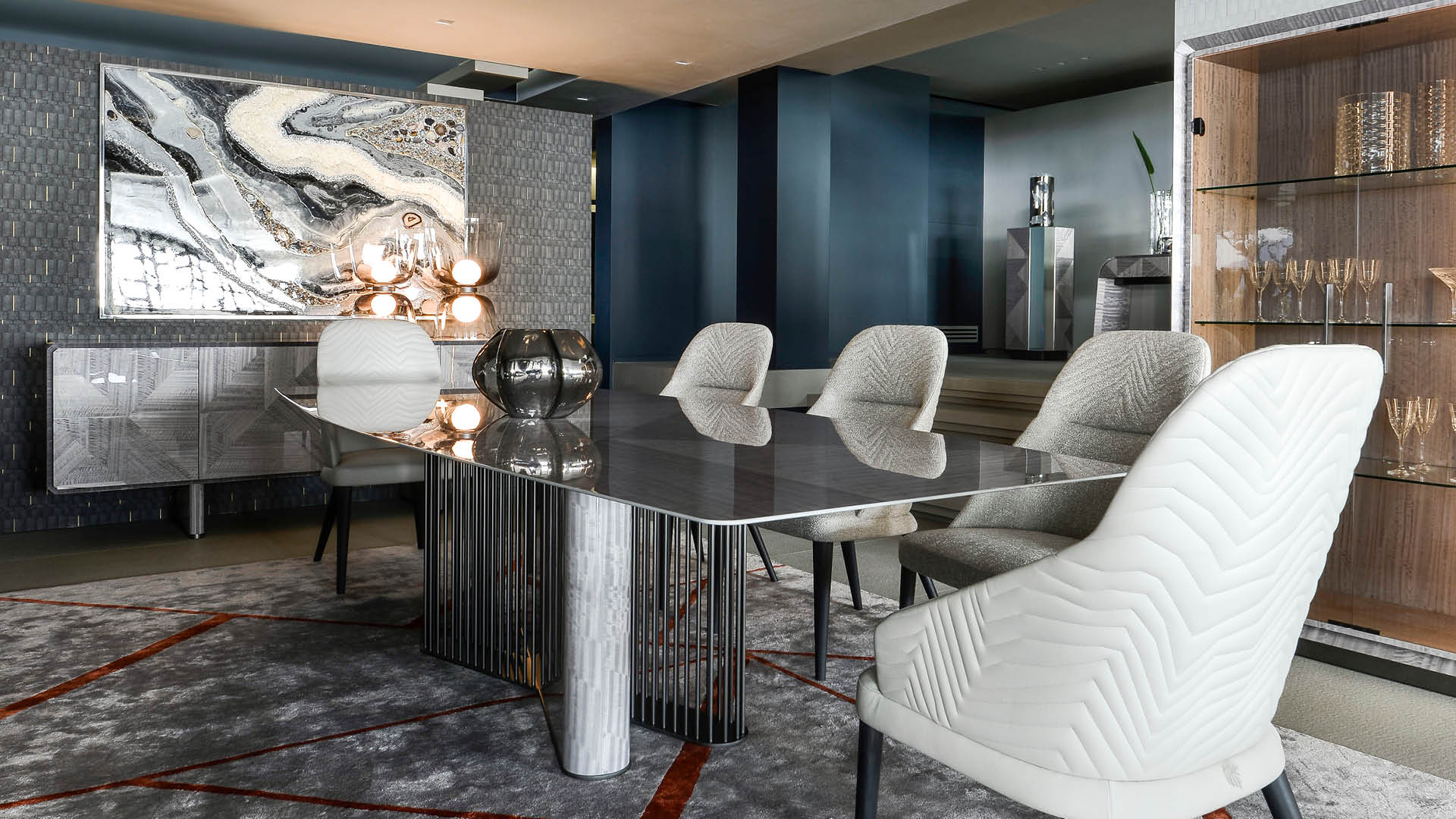 Table rectangulaire avec plateau en placage d'Eucalyptus bouclé de Tasmanie incrusté avec finition en polyester brillant. Plateau fixe en bois biseauté incrusté, base en combinaison d'acier inoxydable nickel gris satiné et de placage d'eucalyptus bouclé de Tasmanie avec finition polyester haute brillance.