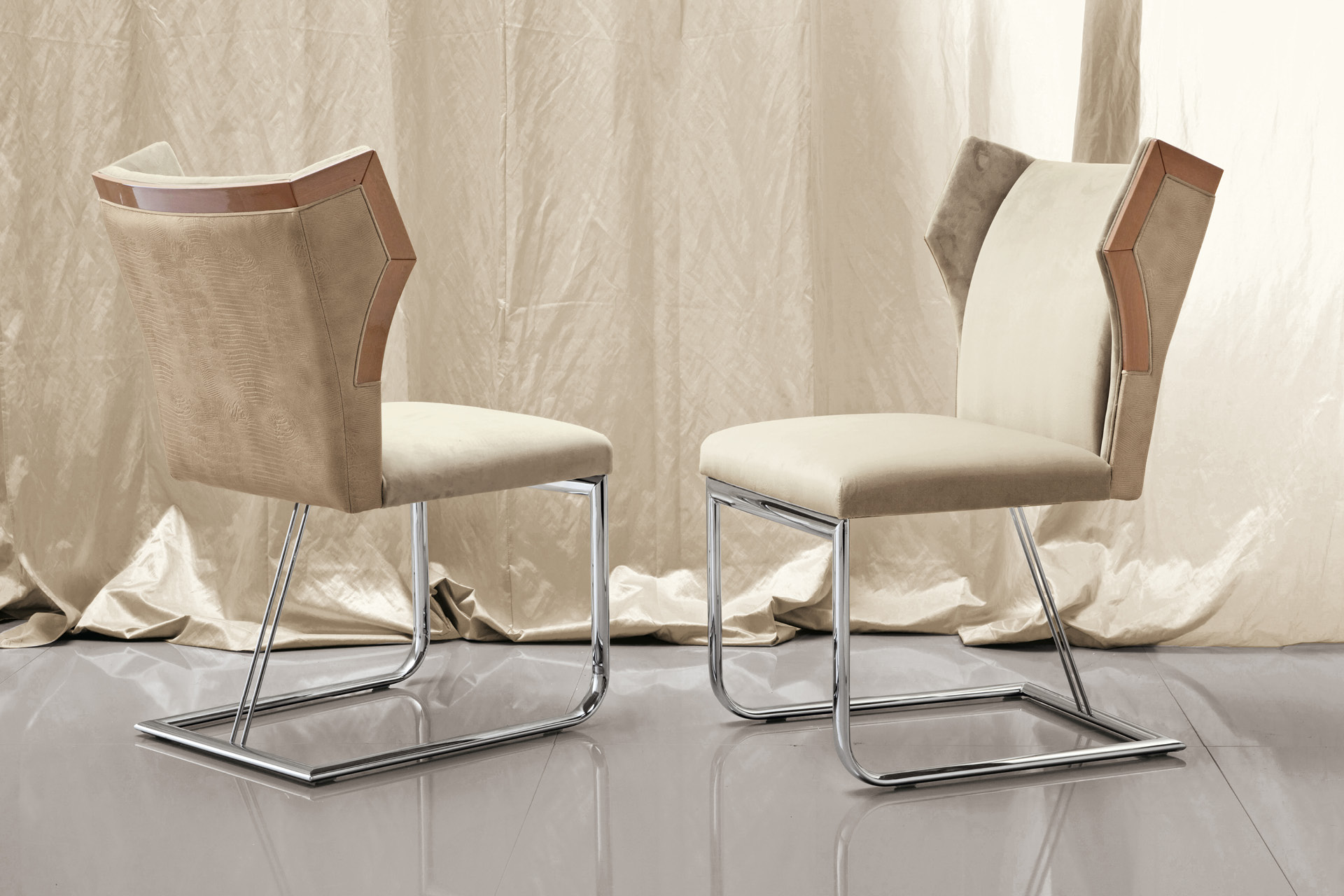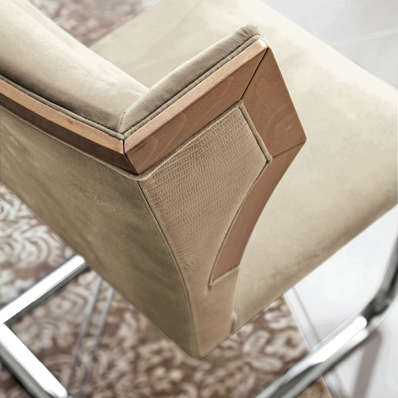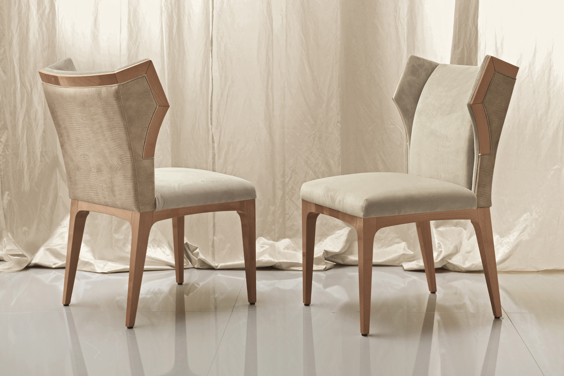 Chaise d’appoint en hêtre massif blanchi avec dossier et assise combinés cuir imprimé iguane et velours ou suède. Base avec 4 pieds en bois. Quantité de tissu requise assise/dossier : 1,4 m. Quantité de cuir requise extérieur/dossier : 1,4 m.