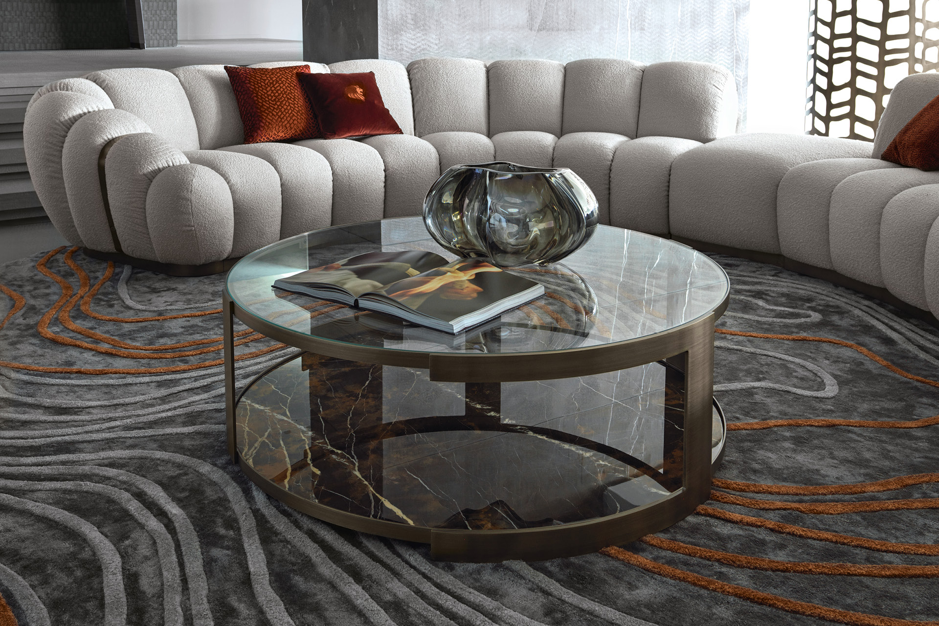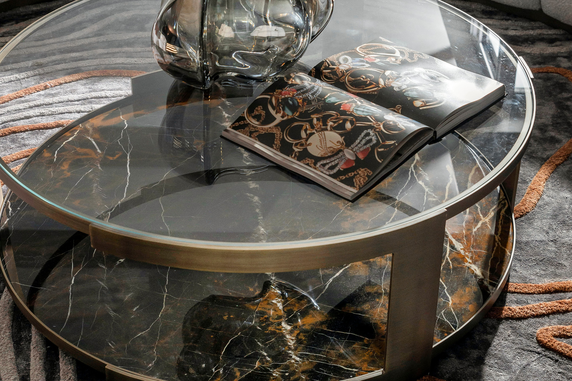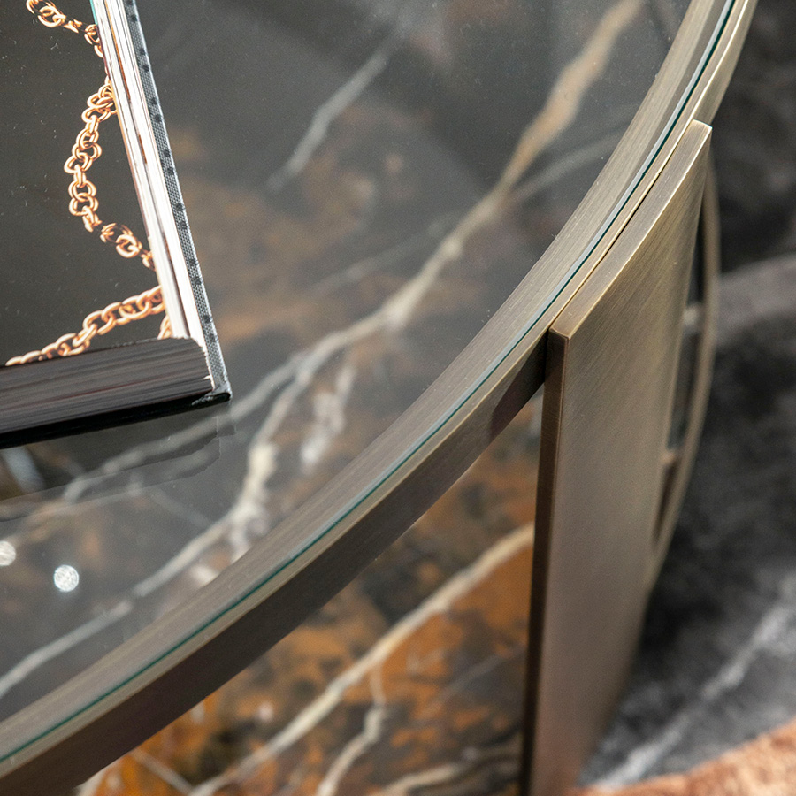 Table basse ronde en acier inoxydable bronzé. Plateau en verre trempé transparent de 10 mm. Piètement en marbre avec finition polyester haute brillance.
