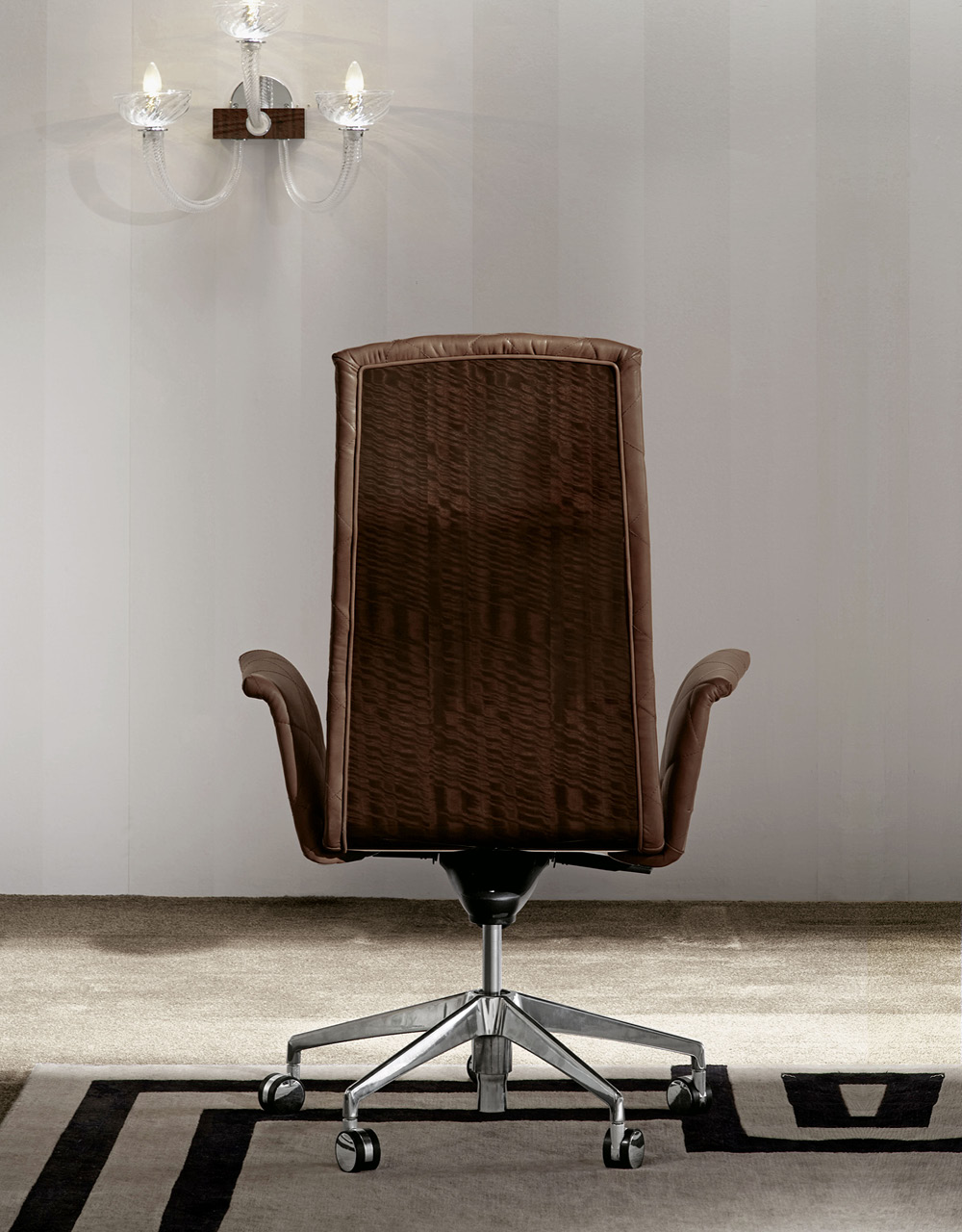 Fauteuil de direction à roulettes pour bureau, à hauteur réglable, panneaux arrière et latéraux en eucalyptus frisé et polyester brillant. Disponible en cuir de qualité supérieure, en velours ou en suède.