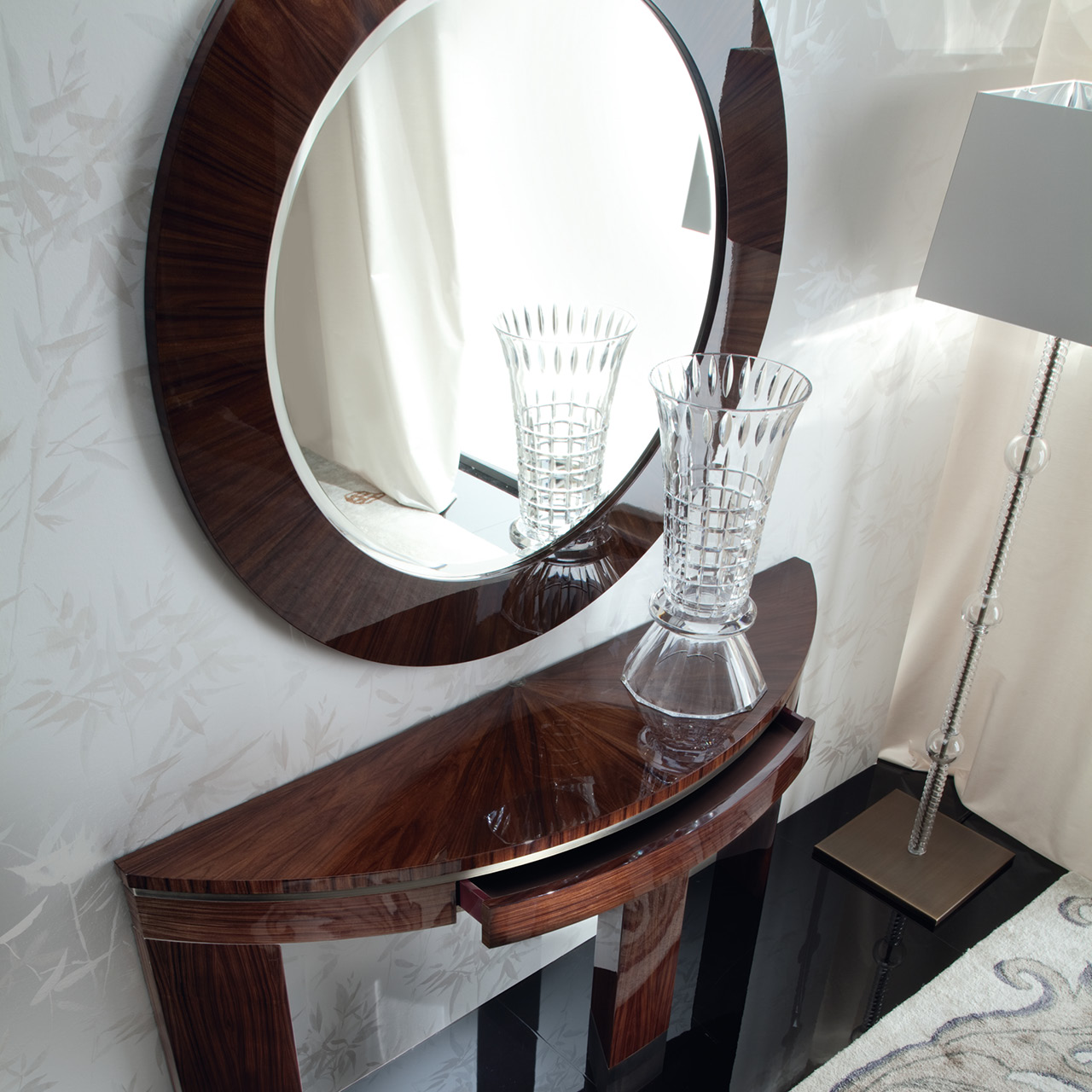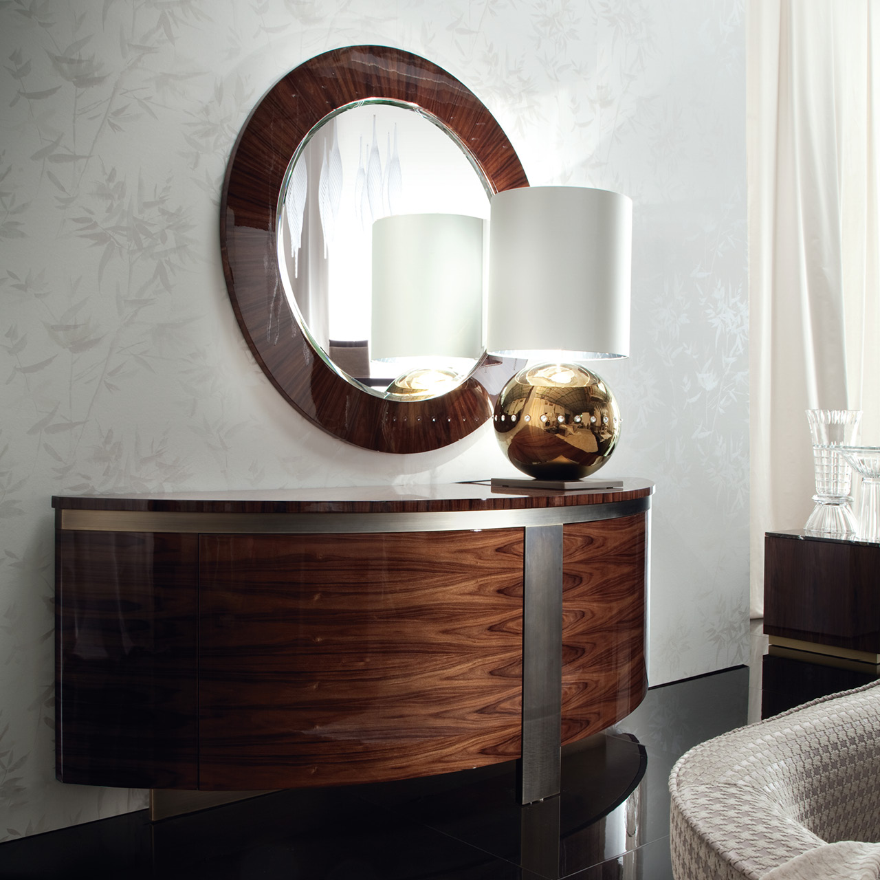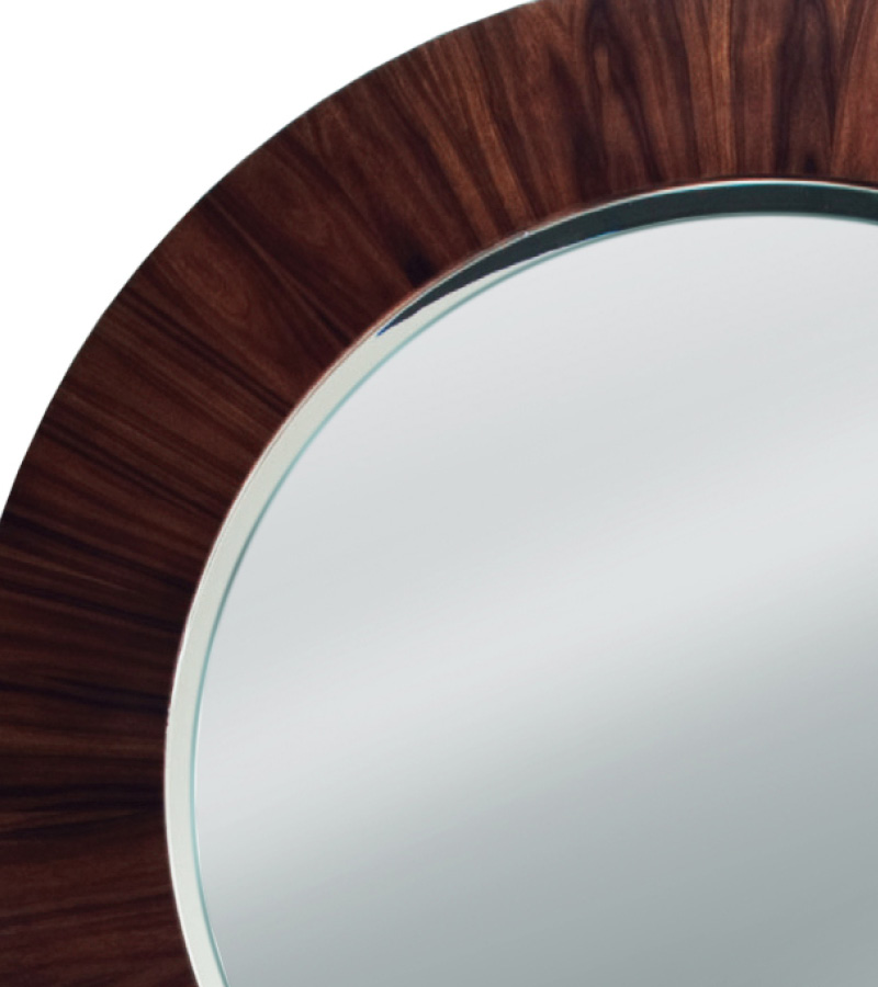 Specchio rotondo smussato impiallacciato in palissandro brasiliano con finitura in poliestere ad alta lucentezza