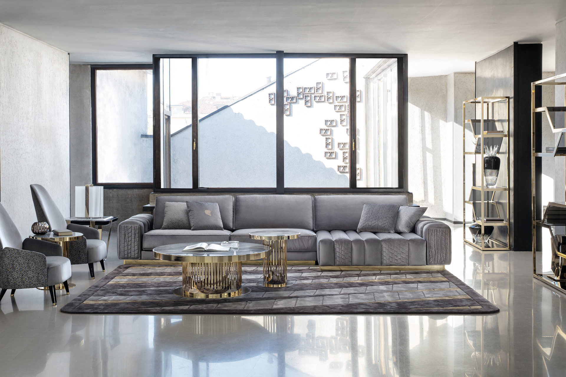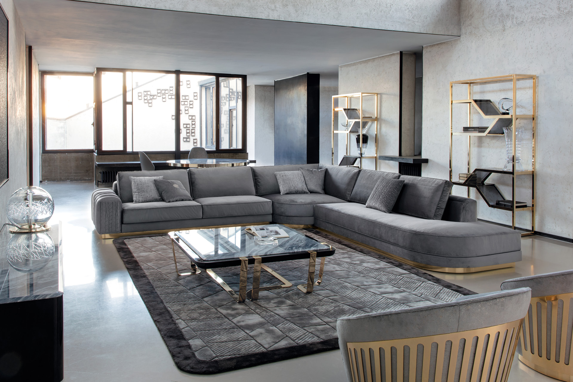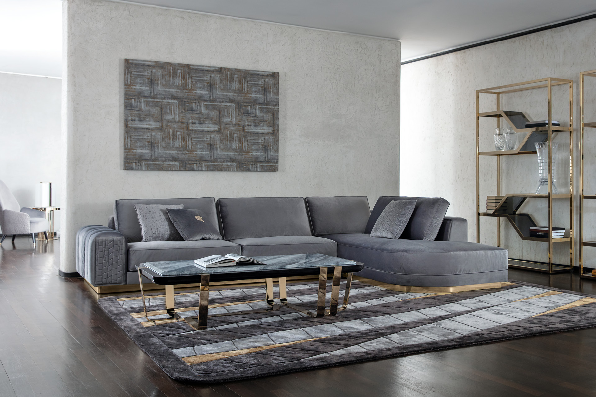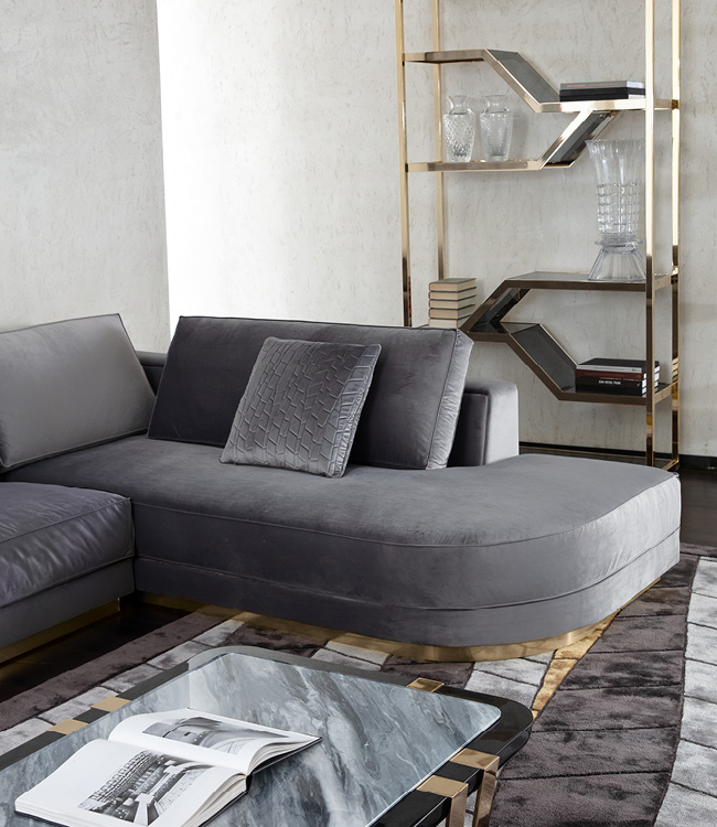 Divano componibile Charisma disponibile in pelle di prima scelta, pelle nabuk, pelle stampata lucertola, tessuto velluto o scamosciato. Sedili e fianchi divano con doppia cucitura in poliuretano espanso rivestito in piuma d'oca. Base in acciaio inox cromato oro chiaro.