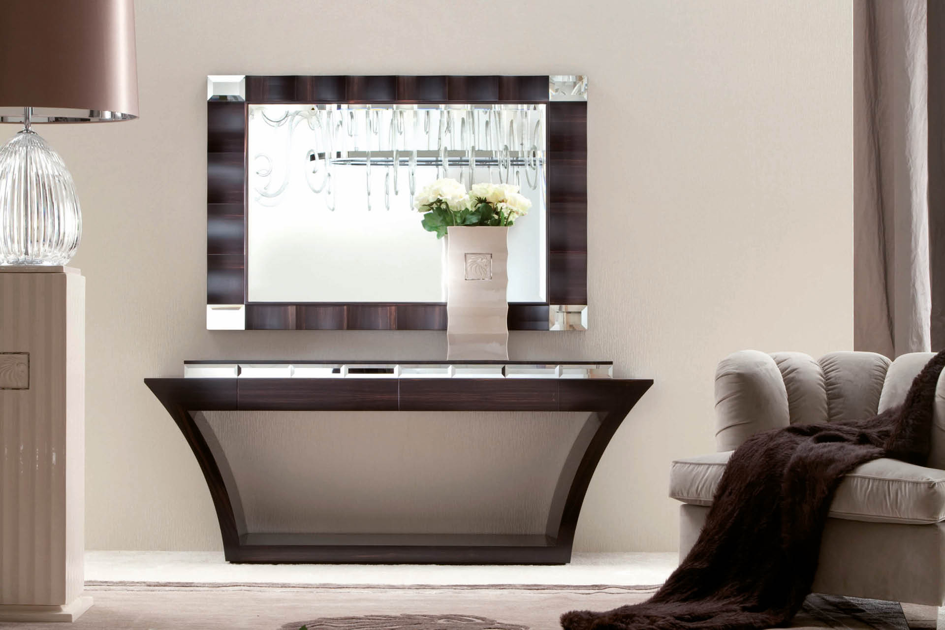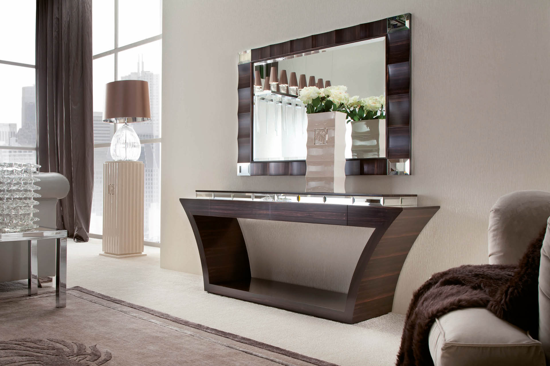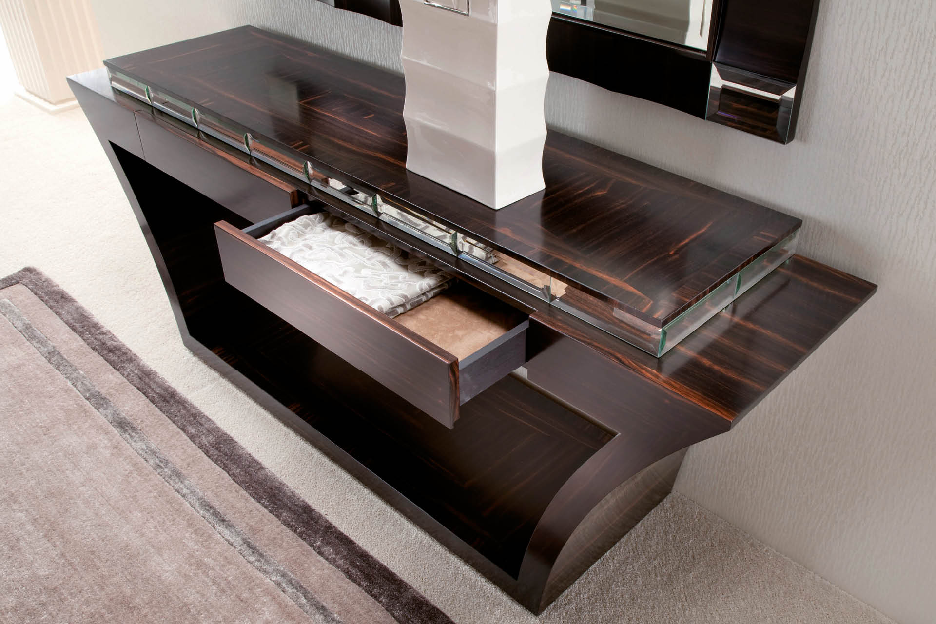 Consolle impiallacciata in ebano makassar con finitura satinata. Piano con inserti in specchi molati e inserto superiore in acciaio inox cromato. 2 cassetti ad estrazione totale con fondo in tessuto di velluto.