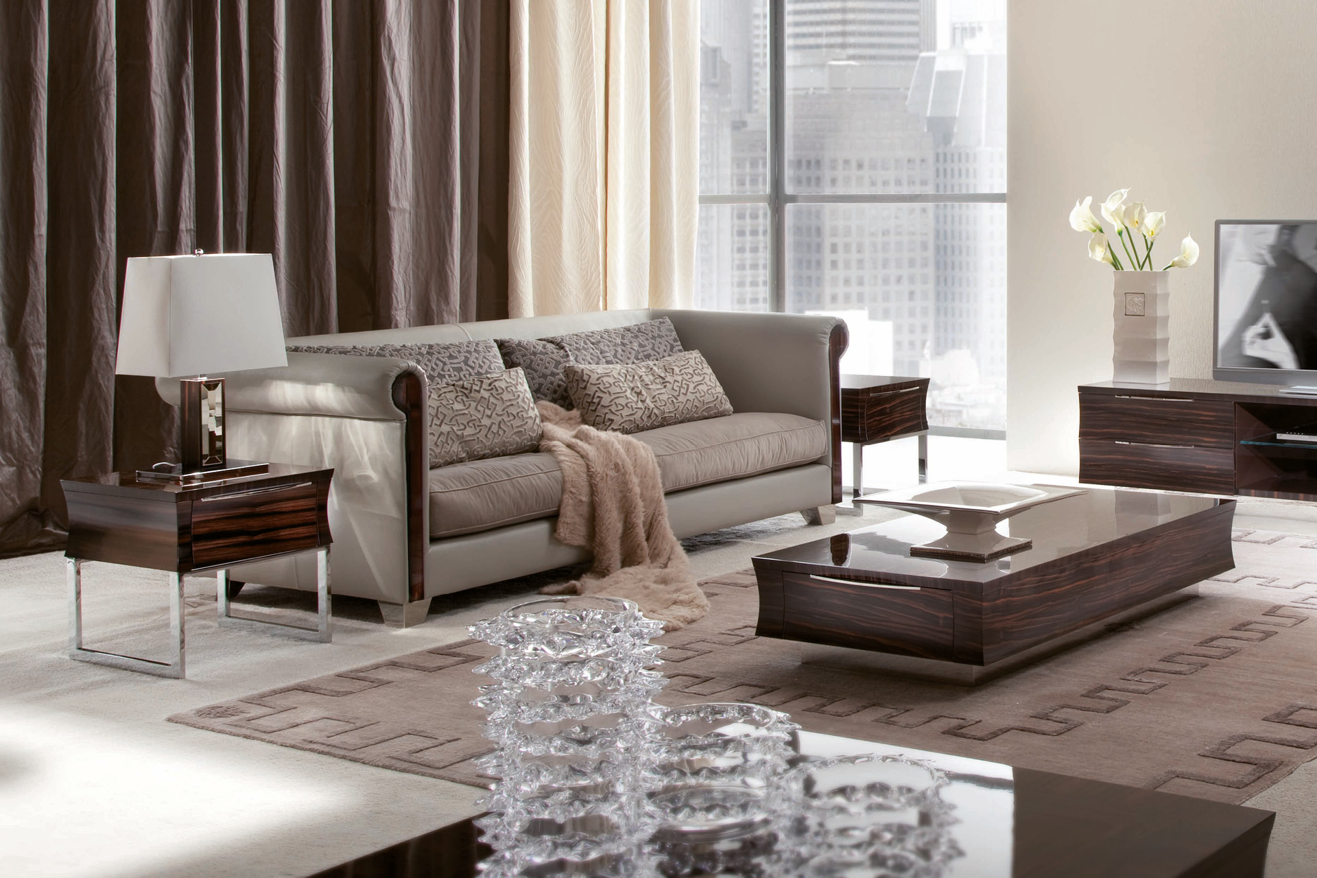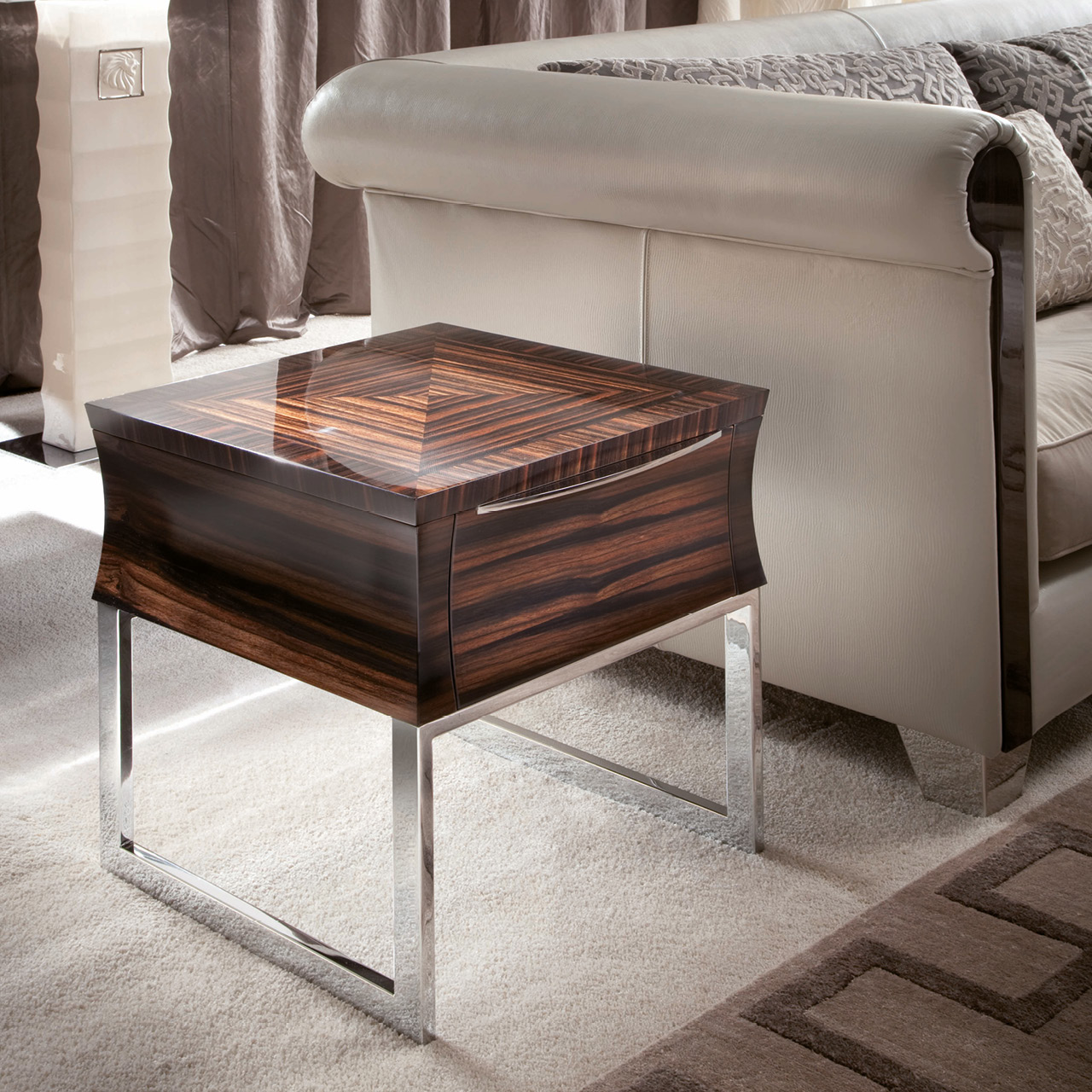 Tavolino quadrato in legno impiallacciato con ebano macassar con finitura satinata. 2 cassetti ad estrazione totale con fondo in velluto. 2 maniglie e base in acciaio inox.
