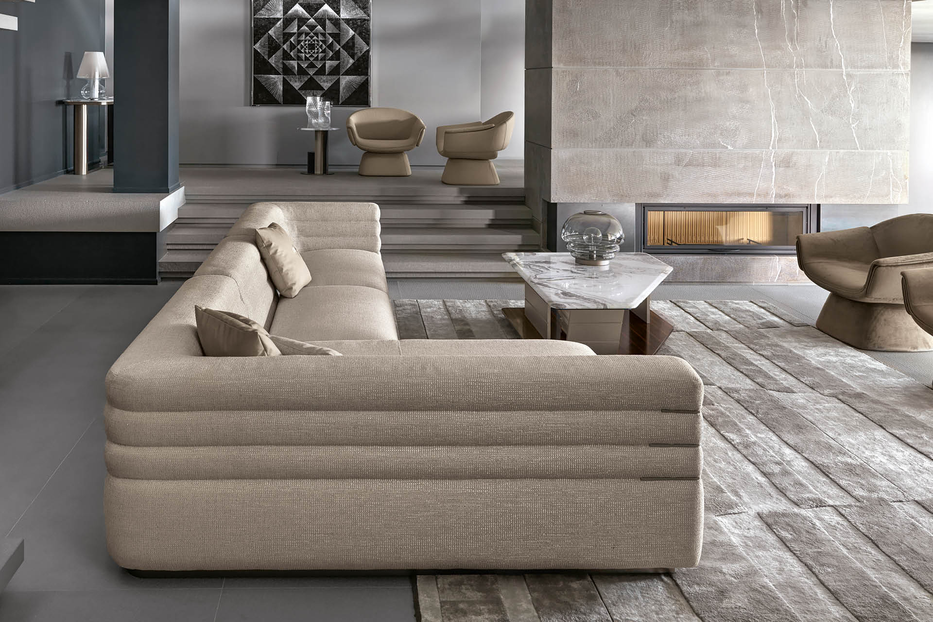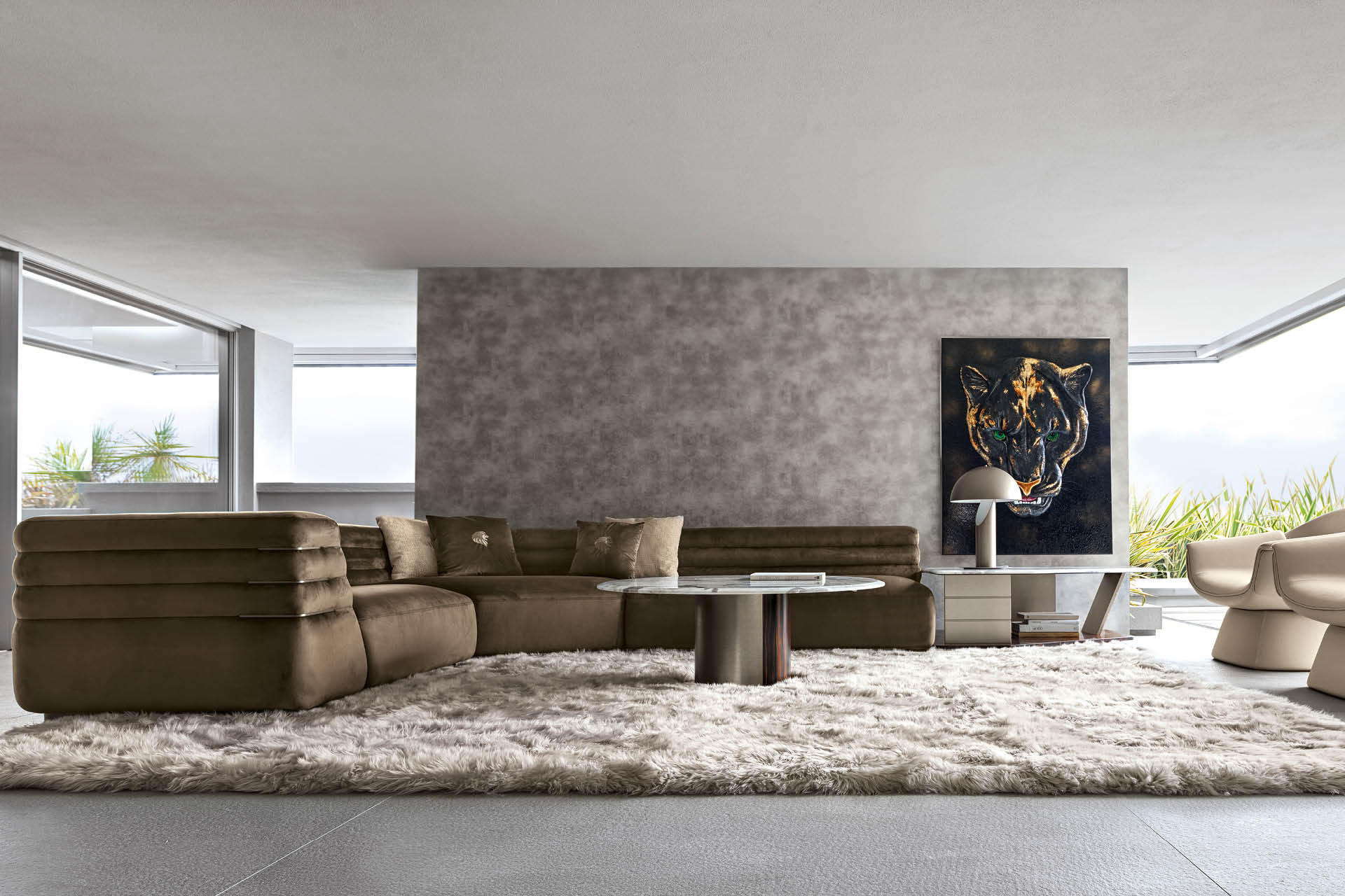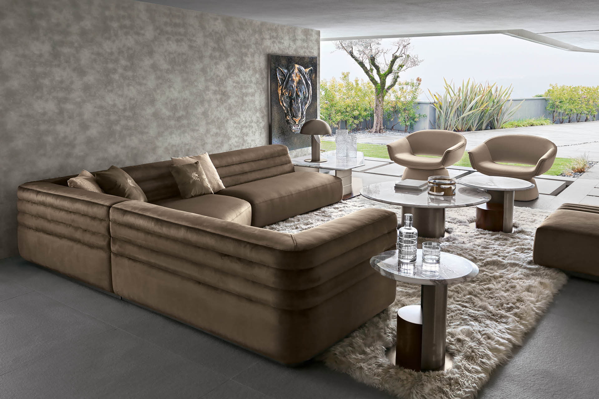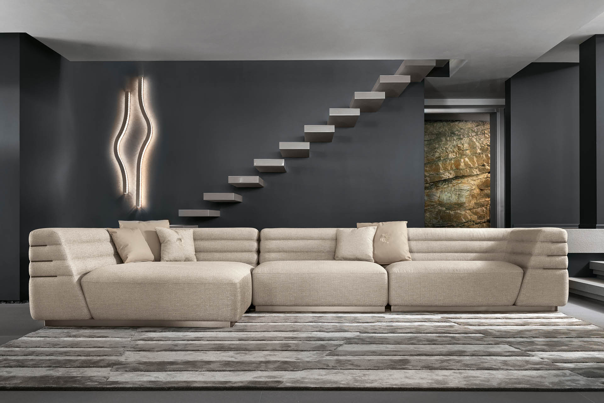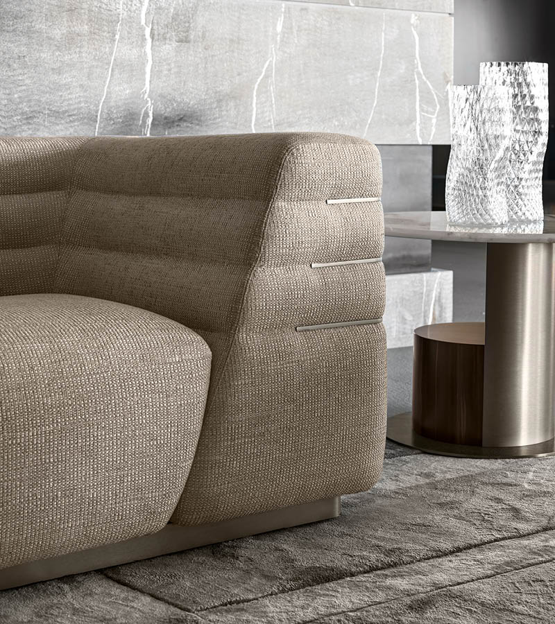 Divano modulare disponibile in pelle di prima scelta, pelle nubuk, pelle stampa lucertola o tessuto. Seduta e fianchi del divano con cucitura speciale in schiuma di poliuretano rivestita in piuma d'oca. Base in acciaio inossidabile con finitura titanio zincato satinato. Altezza seduta cm. 44
