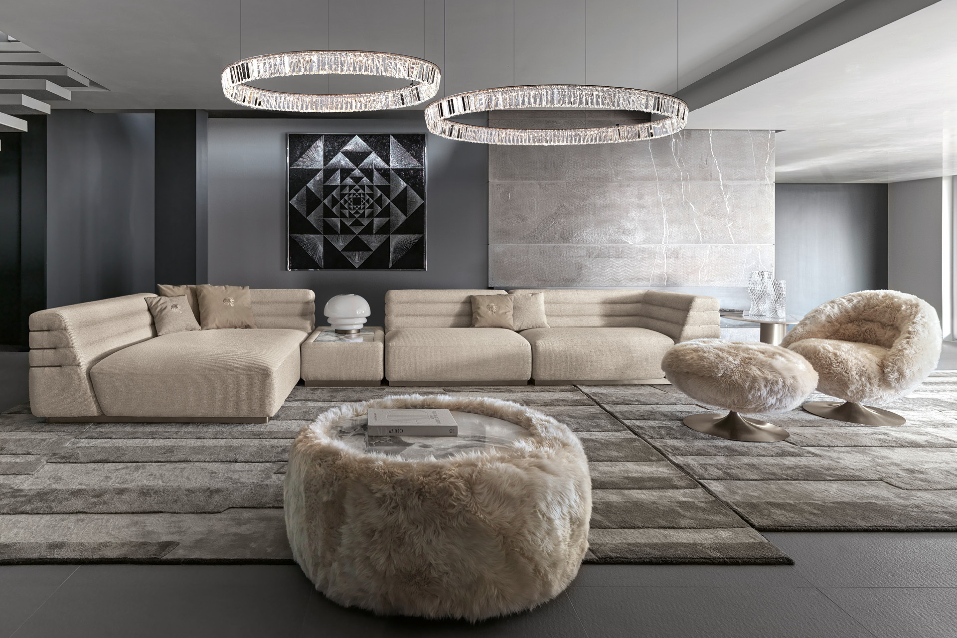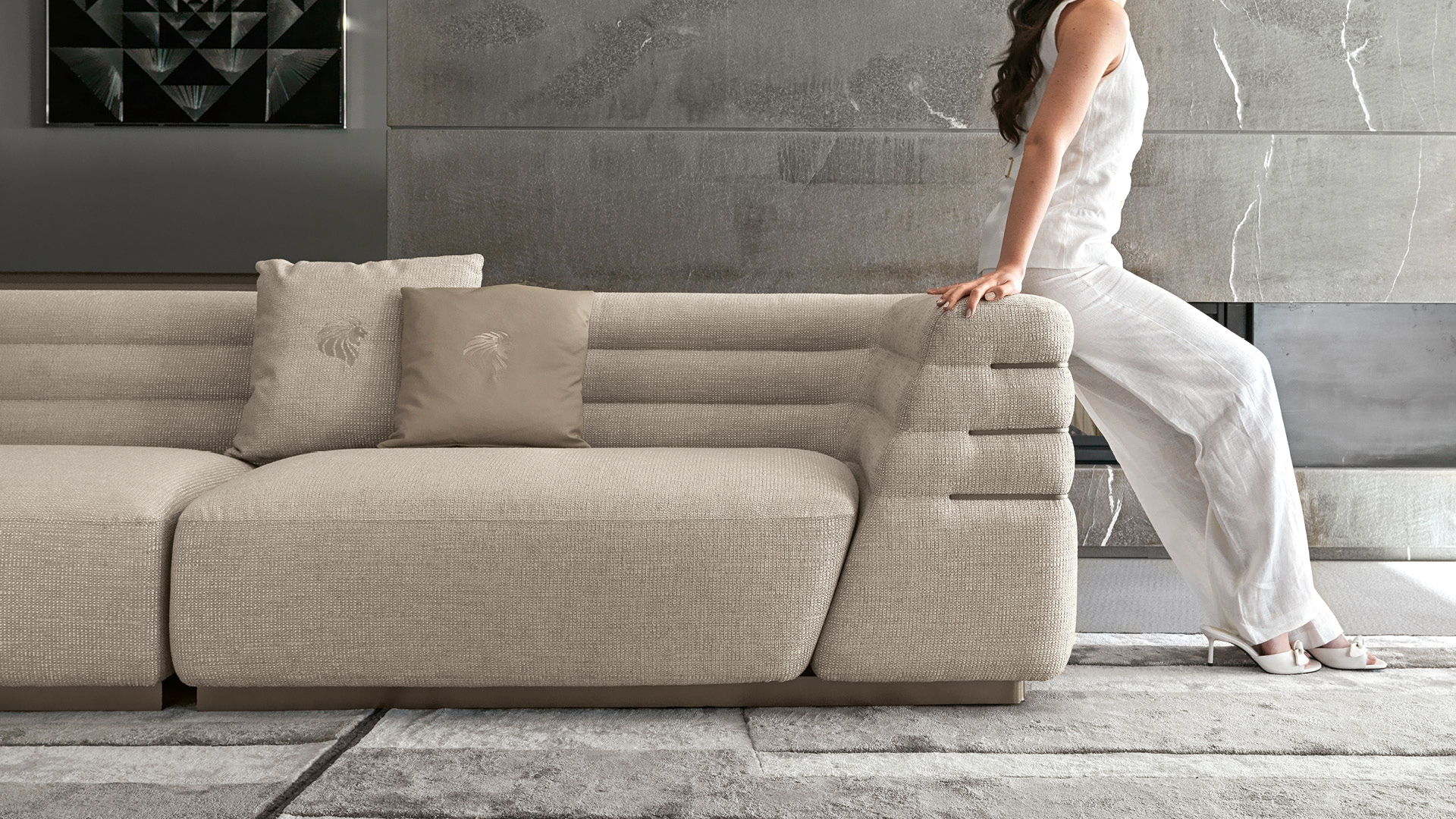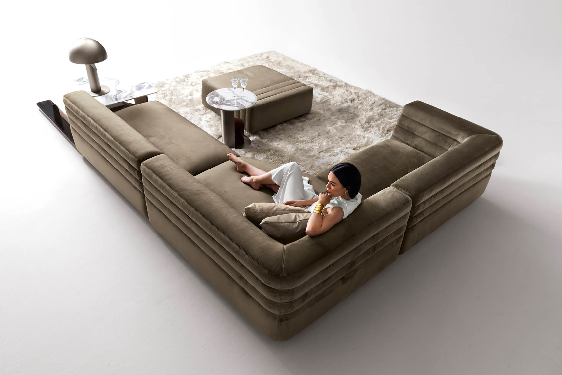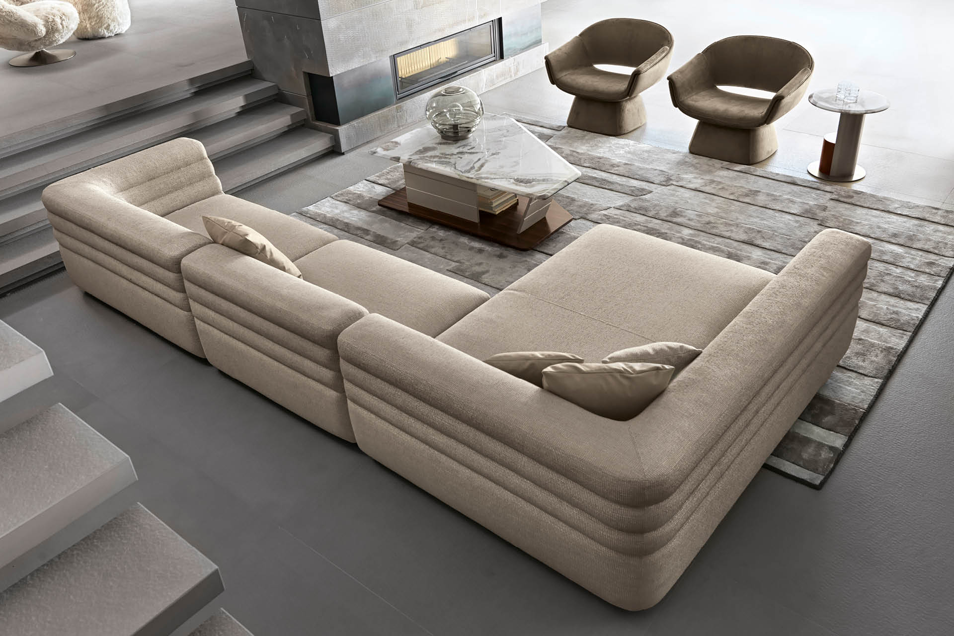 Divano modulare disponibile in pelle di prima scelta, pelle nubuk, pelle stampa lucertola o tessuto. Seduta e fianchi del divano con cucitura speciale in schiuma di poliuretano rivestita in piuma d'oca. Base in acciaio inossidabile con finitura titanio zincato satinato. Altezza seduta cm. 44