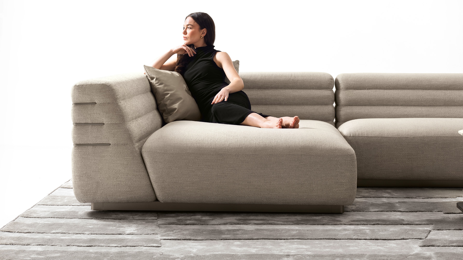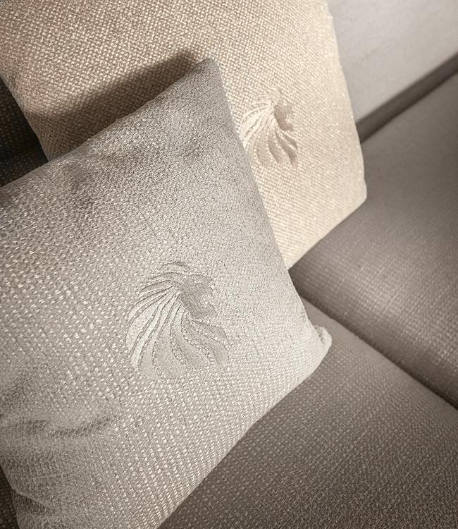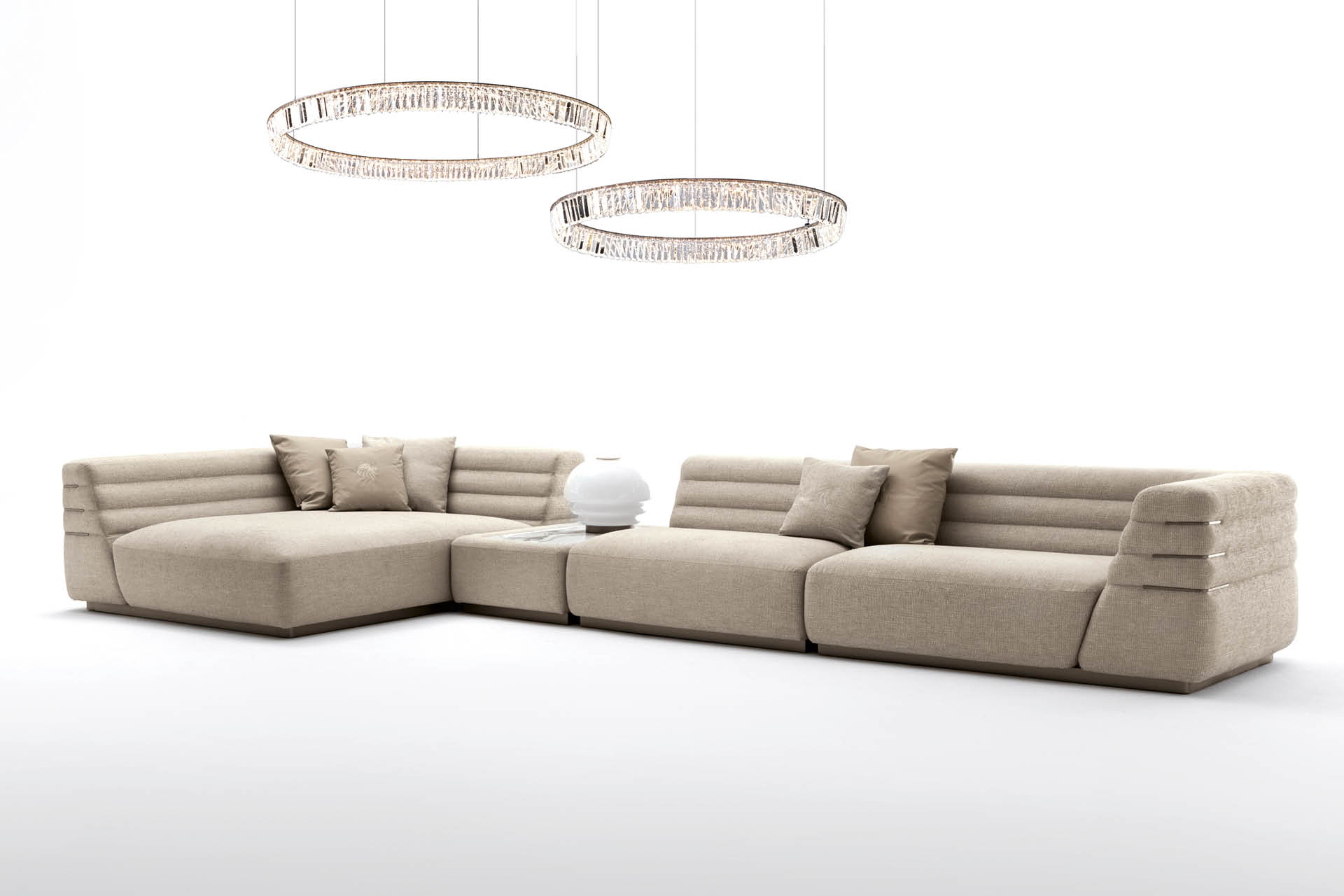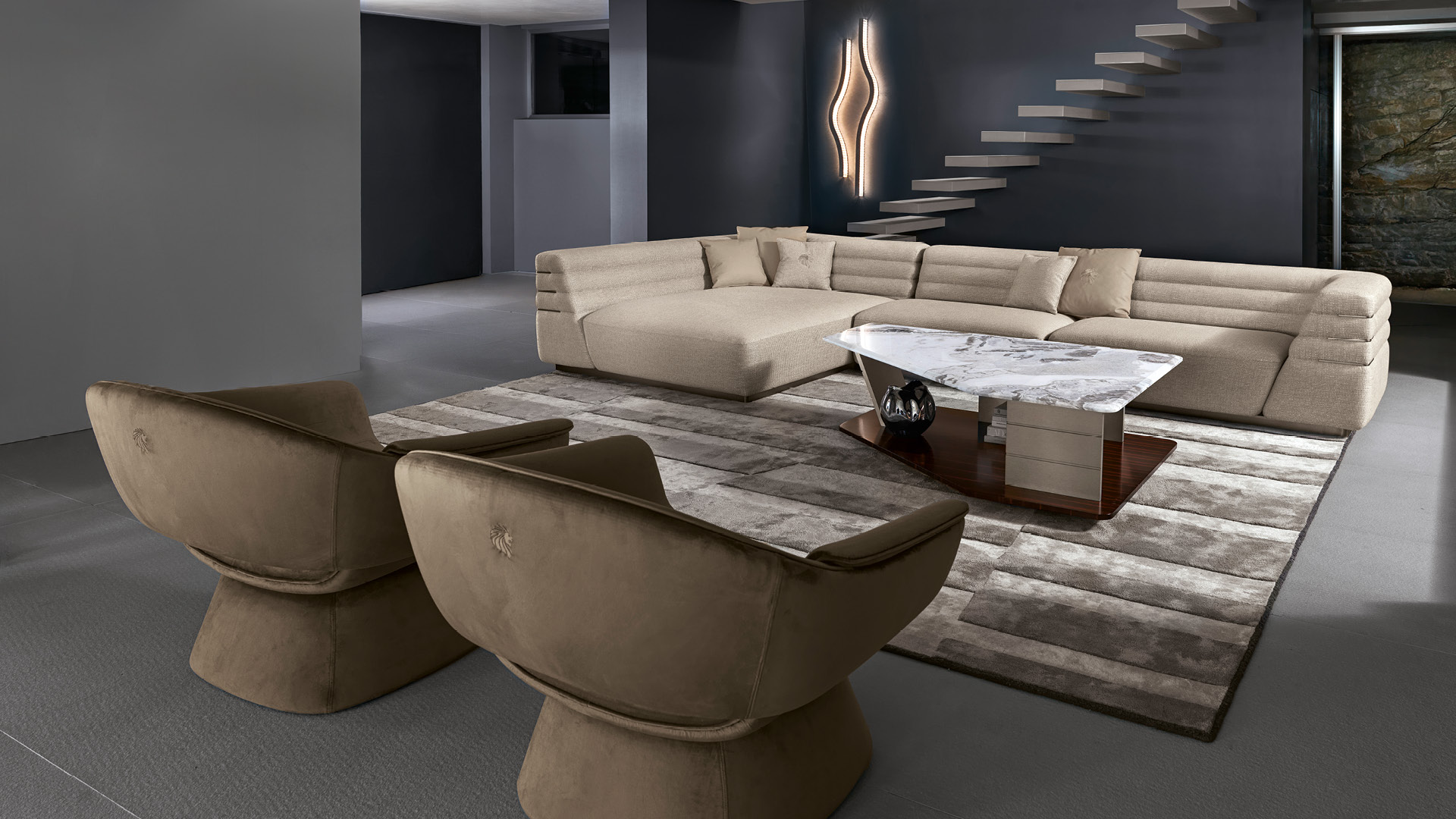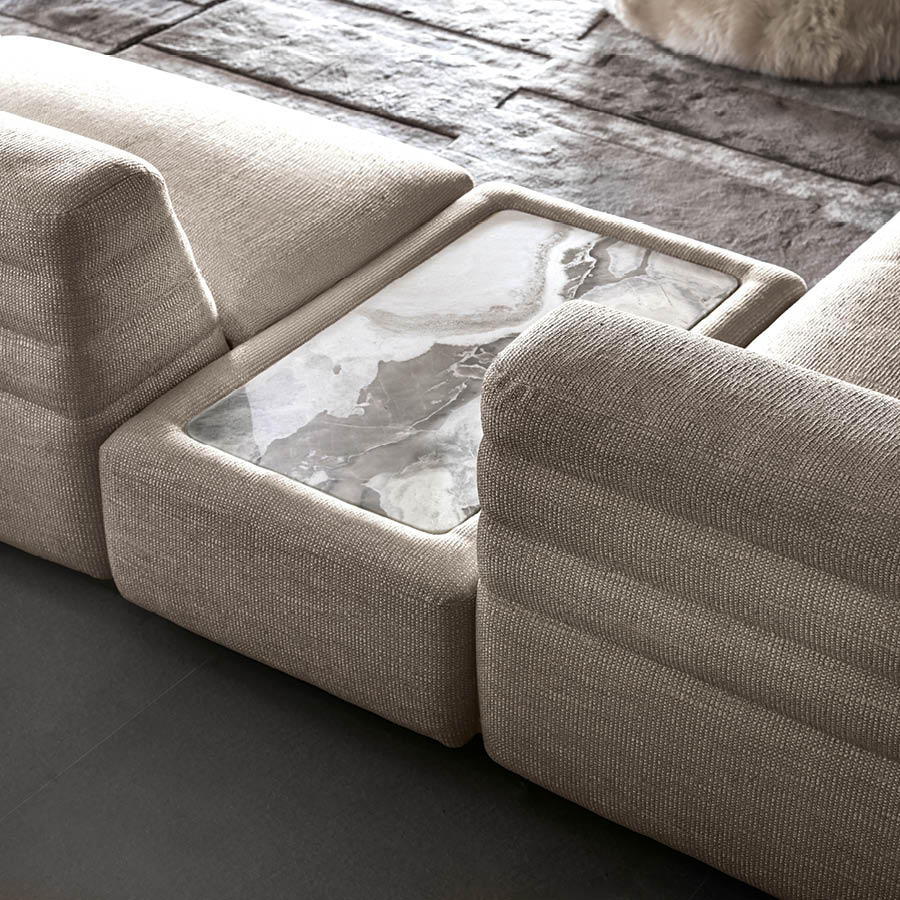 Divano modulare disponibile in pelle di prima scelta, pelle nubuk, pelle stampa lucertola o tessuto. Seduta e fianchi del divano con cucitura speciale in schiuma di poliuretano rivestita in piuma d'oca. Base in acciaio inossidabile con finitura titanio zincato satinato. Altezza seduta cm. 44