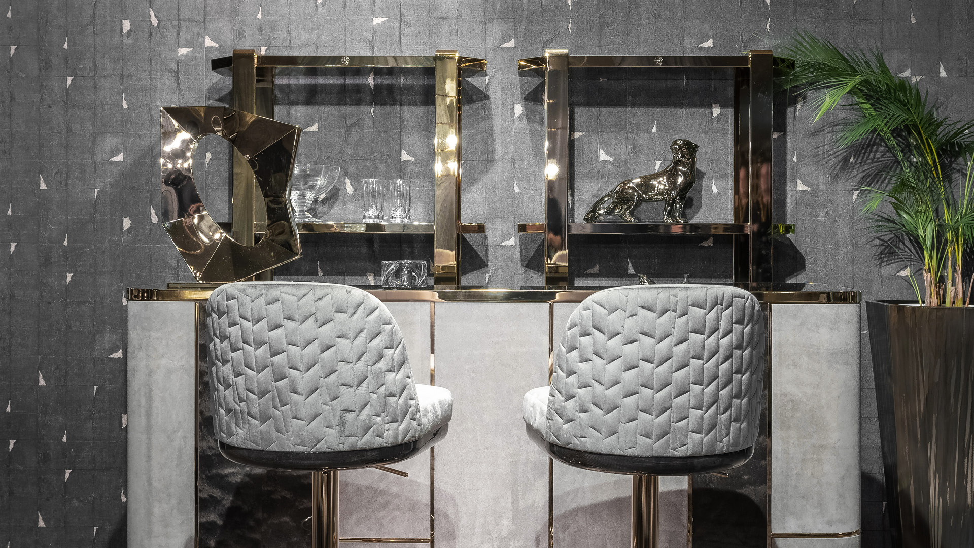 Libreria in acciaio inox cromato oro chiaro con logo Giorgio Collection. 3 ripiani in vetro a specchio temperato scuro.