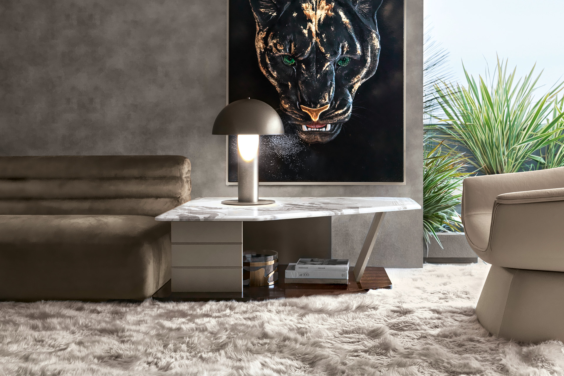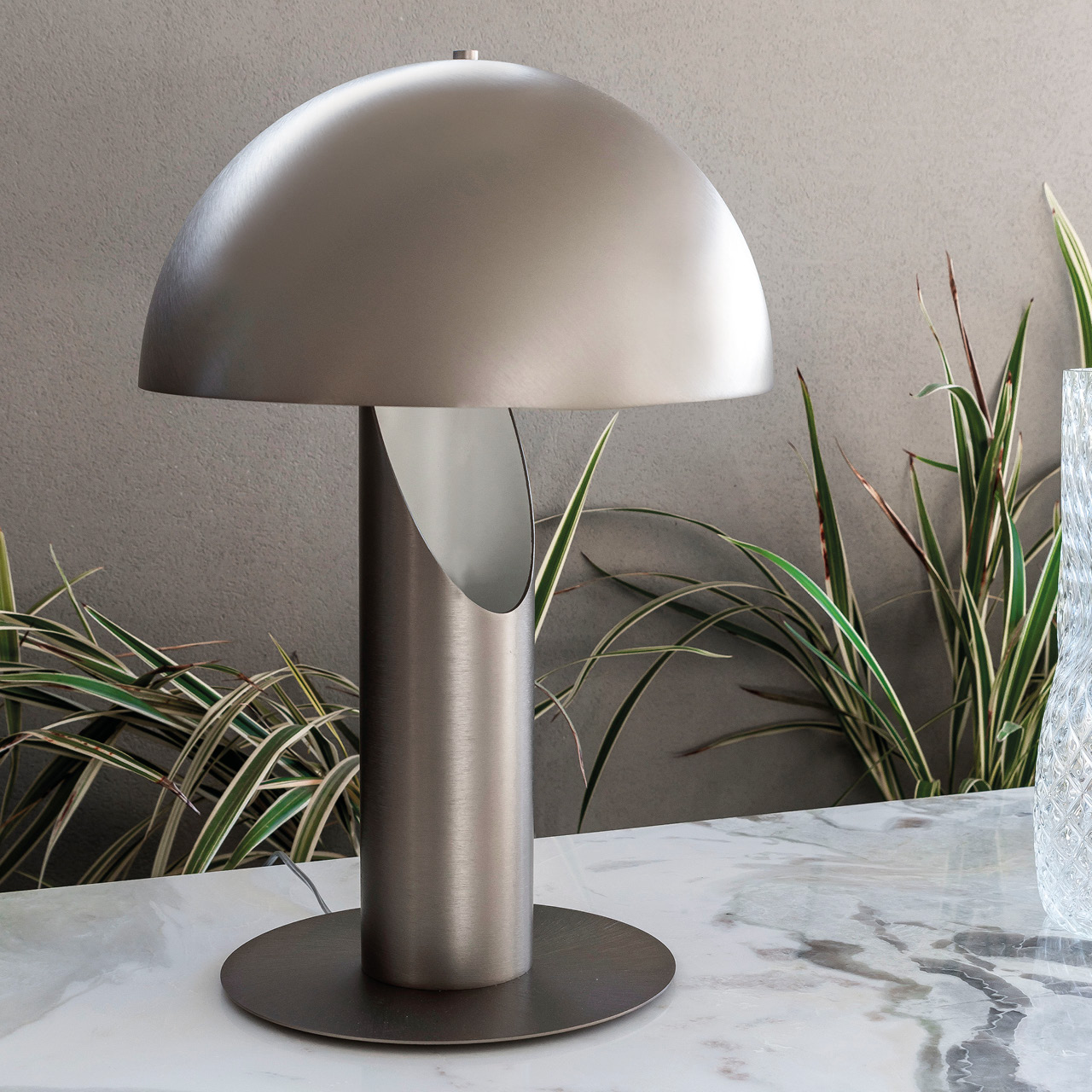 Lampada di medie dimensioni in acciaio inossidabile con finitura titanio zincato satinato. È necessaria una lampadina a LED con attacco GU10, max 20 W.