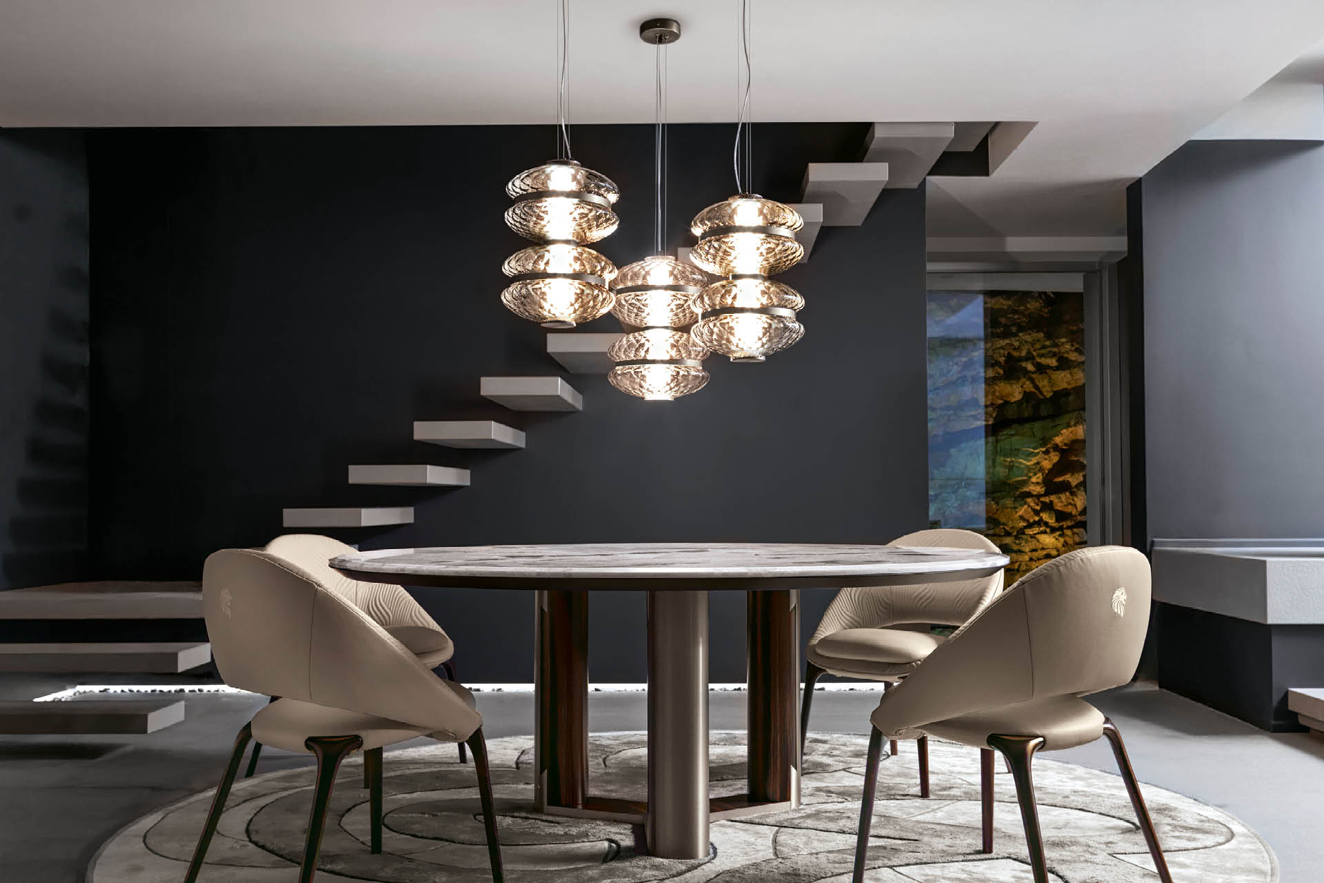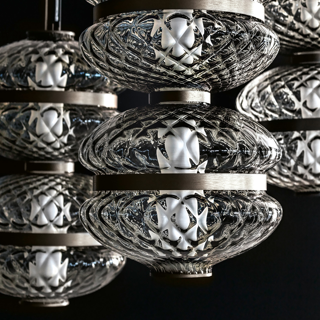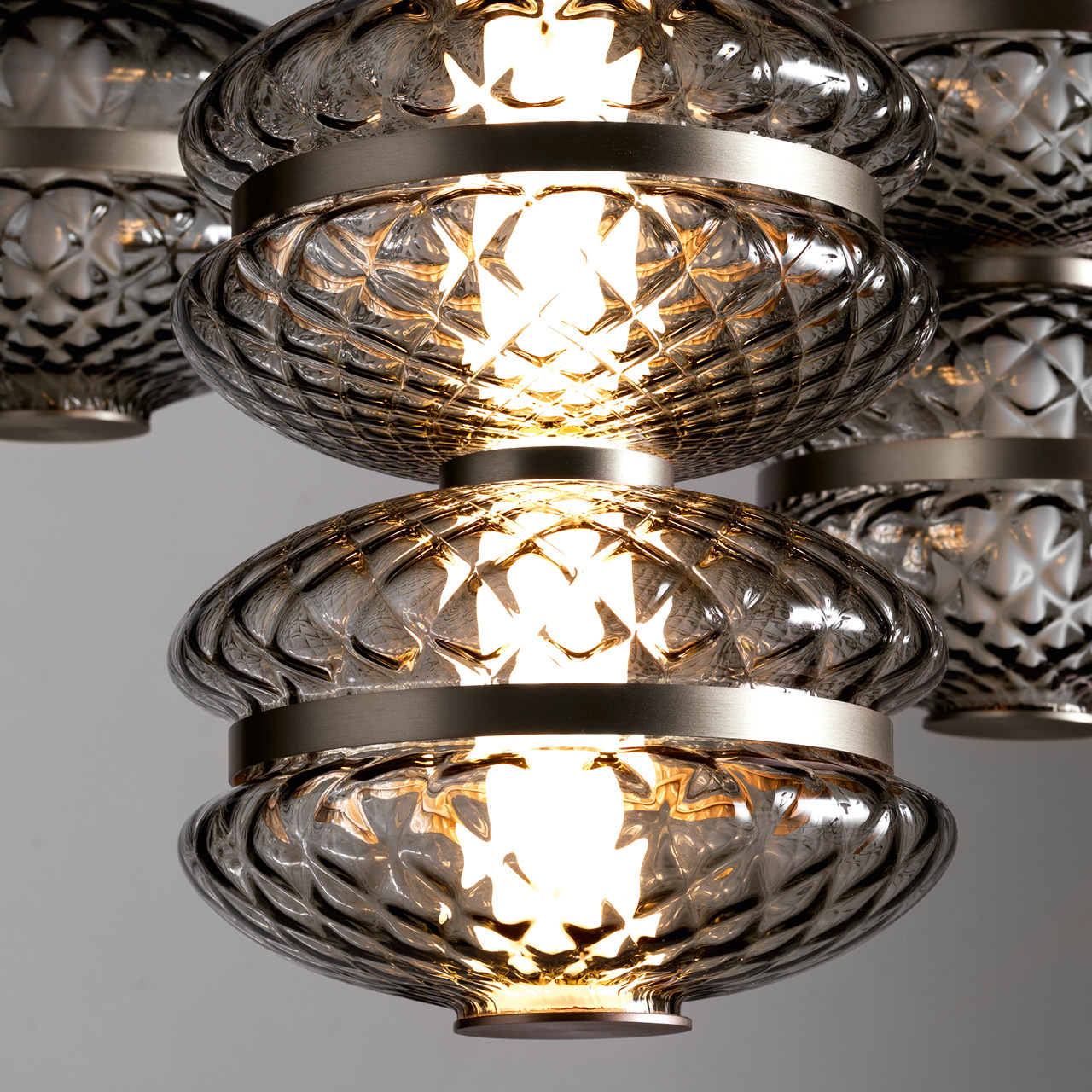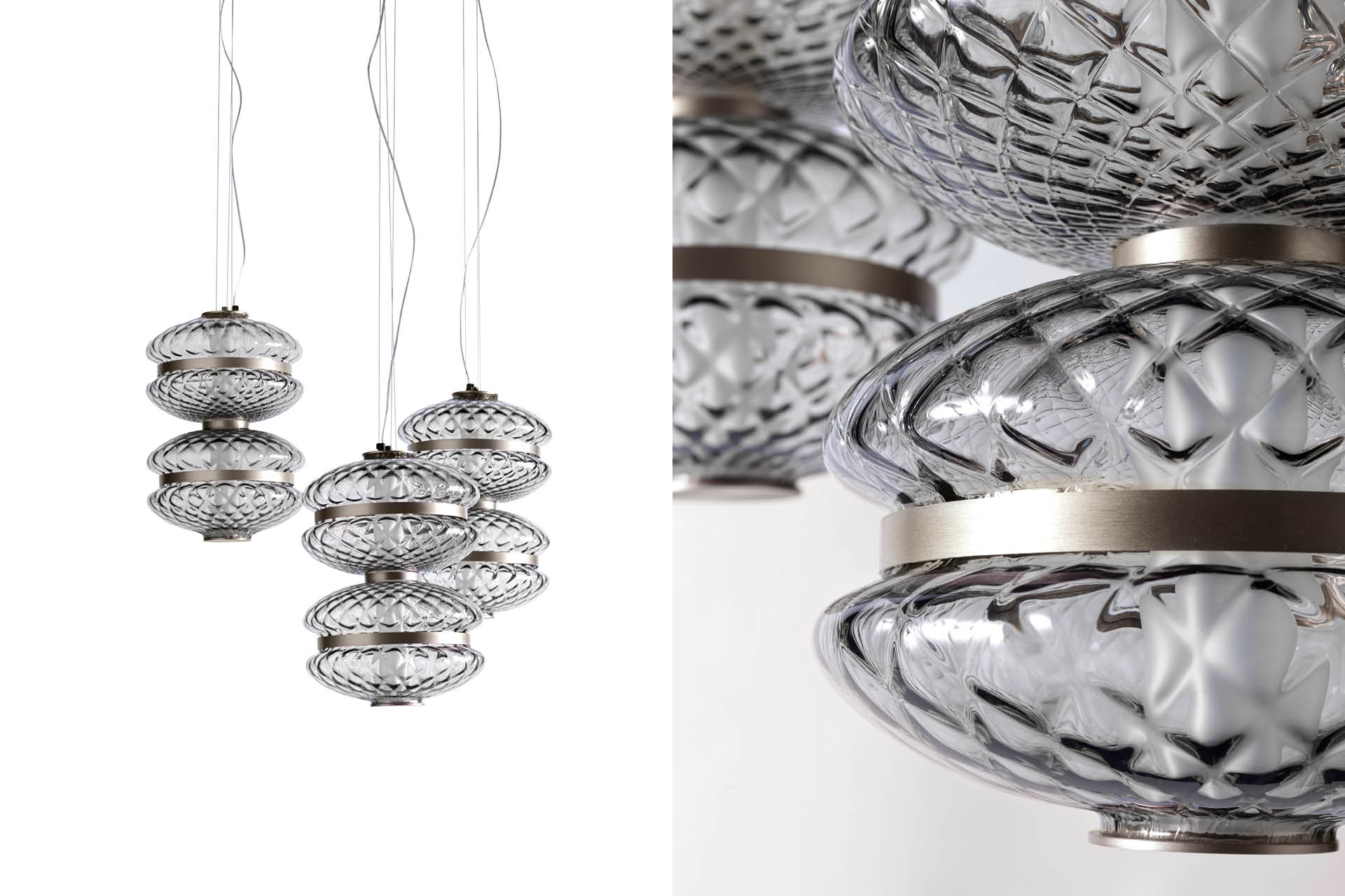 Lampadario singolo con struttura realizzata in una combinazione di vetro soffiato veneziano «Murano» Balloton fumé e acciaio inossidabile con finitura titanio zincato satinato. Illuminazione a LED inclusa.
