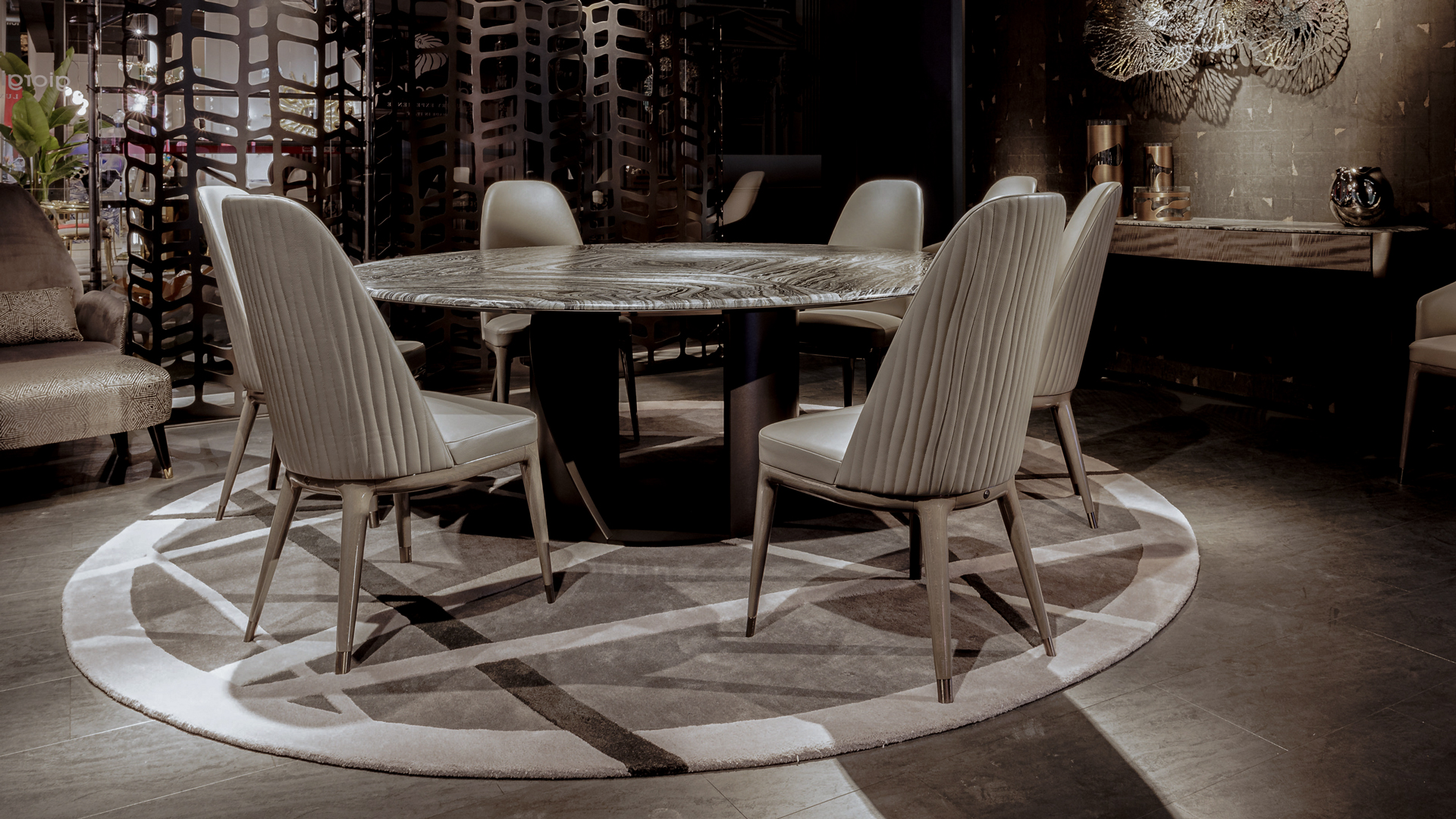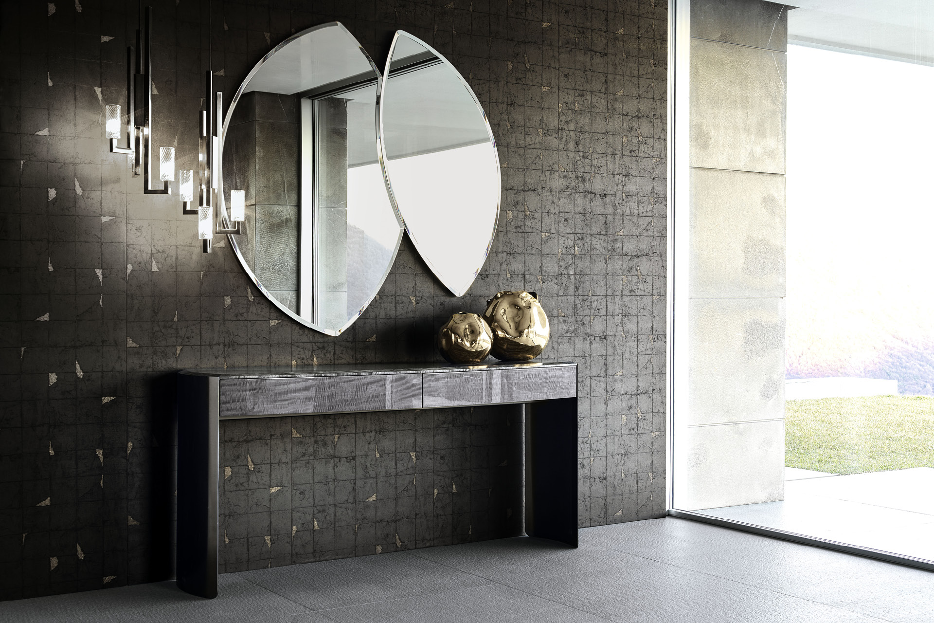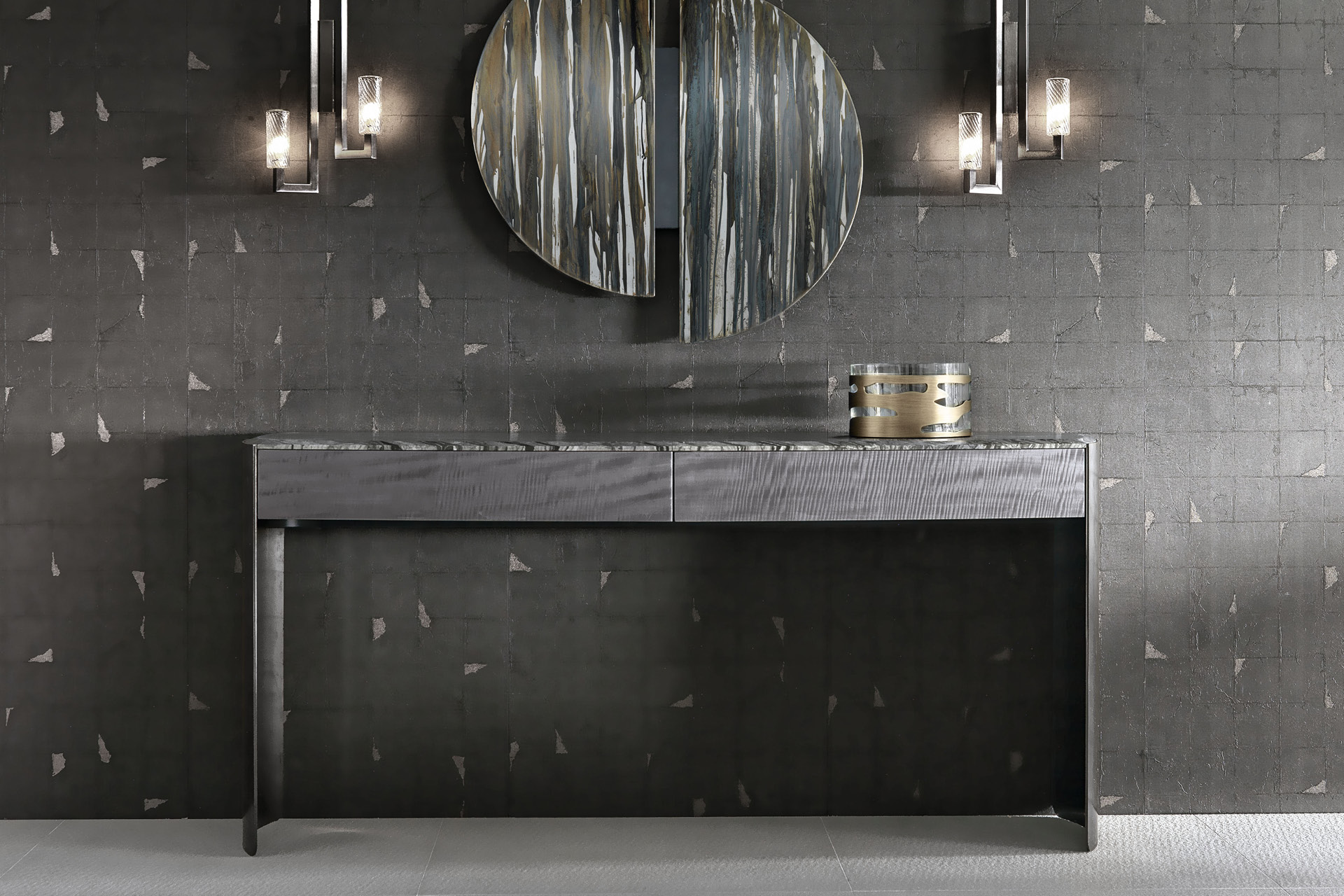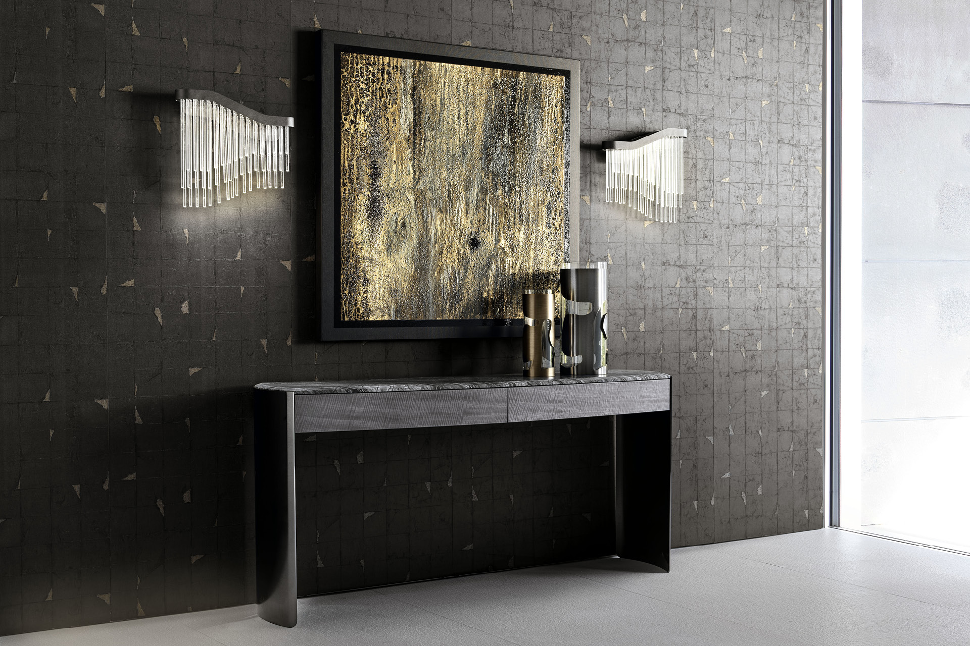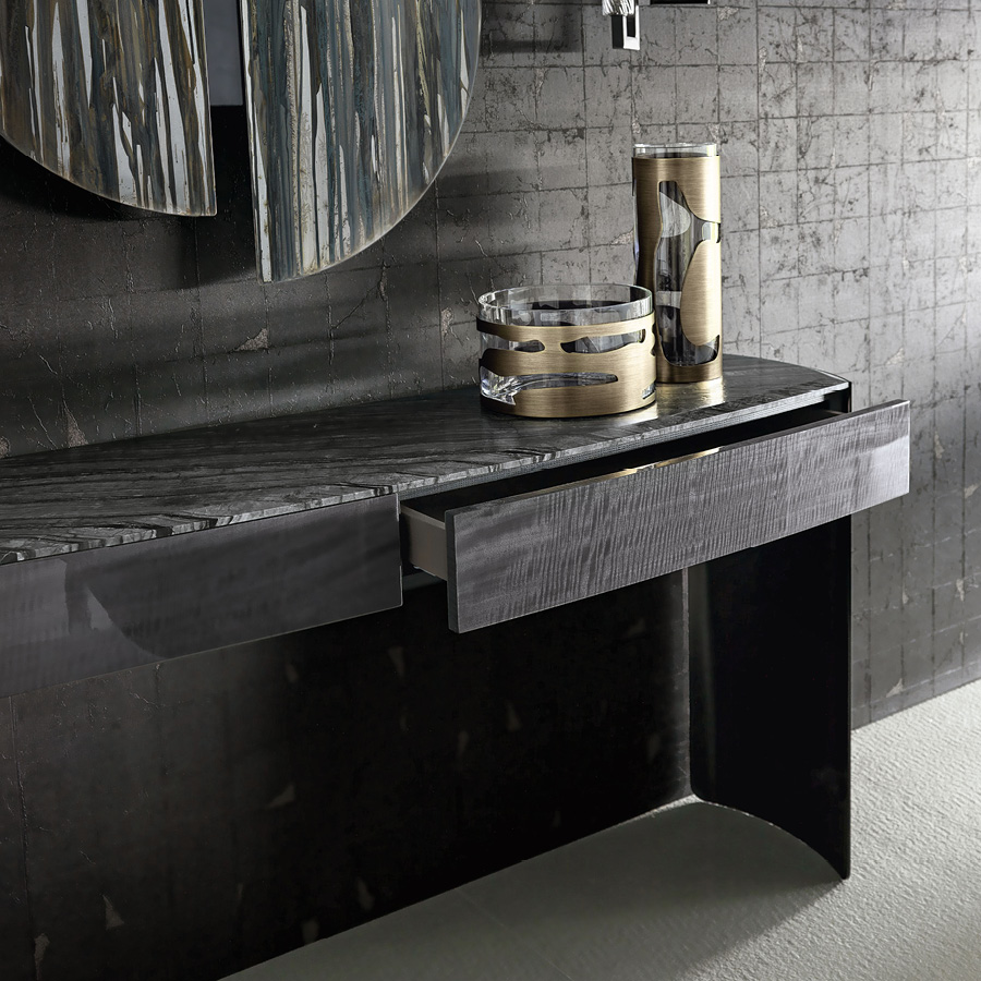 Consolle impiallacciata in movingui con motivo Madagascar, con finitura in poliestere lucido. Piano in marmo black Kenya. Gambe curve in acciaio inox satinato black nickel con logo Giorgio Collection inciso al laser. 2 cassetti esterni ad estrazione totale con fondo in velluto.