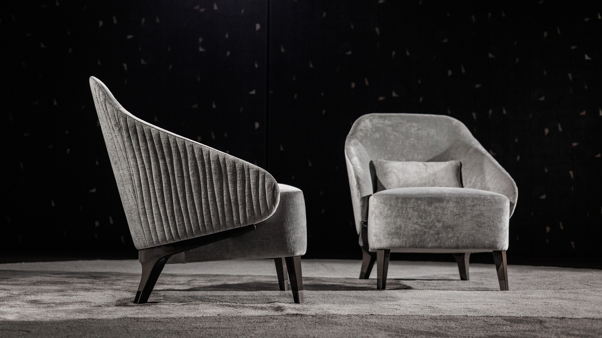 Poltrona disponibile in pelle di prima scelta, pelle nabuk, pelle stampata lucertola, velluto o tessuto scamosciato. Seduta e lati della sedia con doppia cucitura in poliuretano espanso rivestito in piuma d'oca. Schienale con fìnitura trapuntata. Base in legno con logo Giorgio Collection. 4 gambe con dettagli in acciaio inox satinato black nickel.