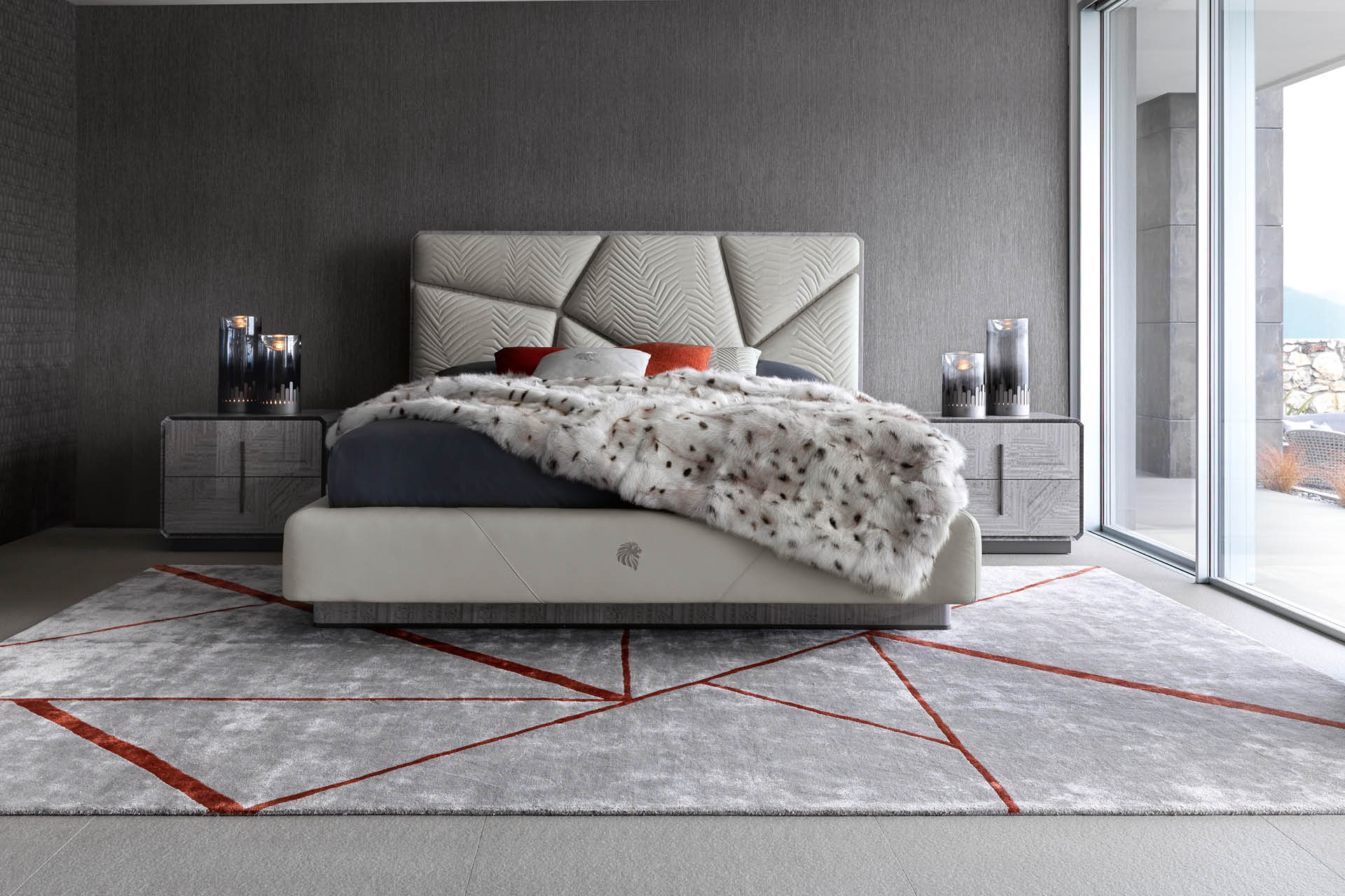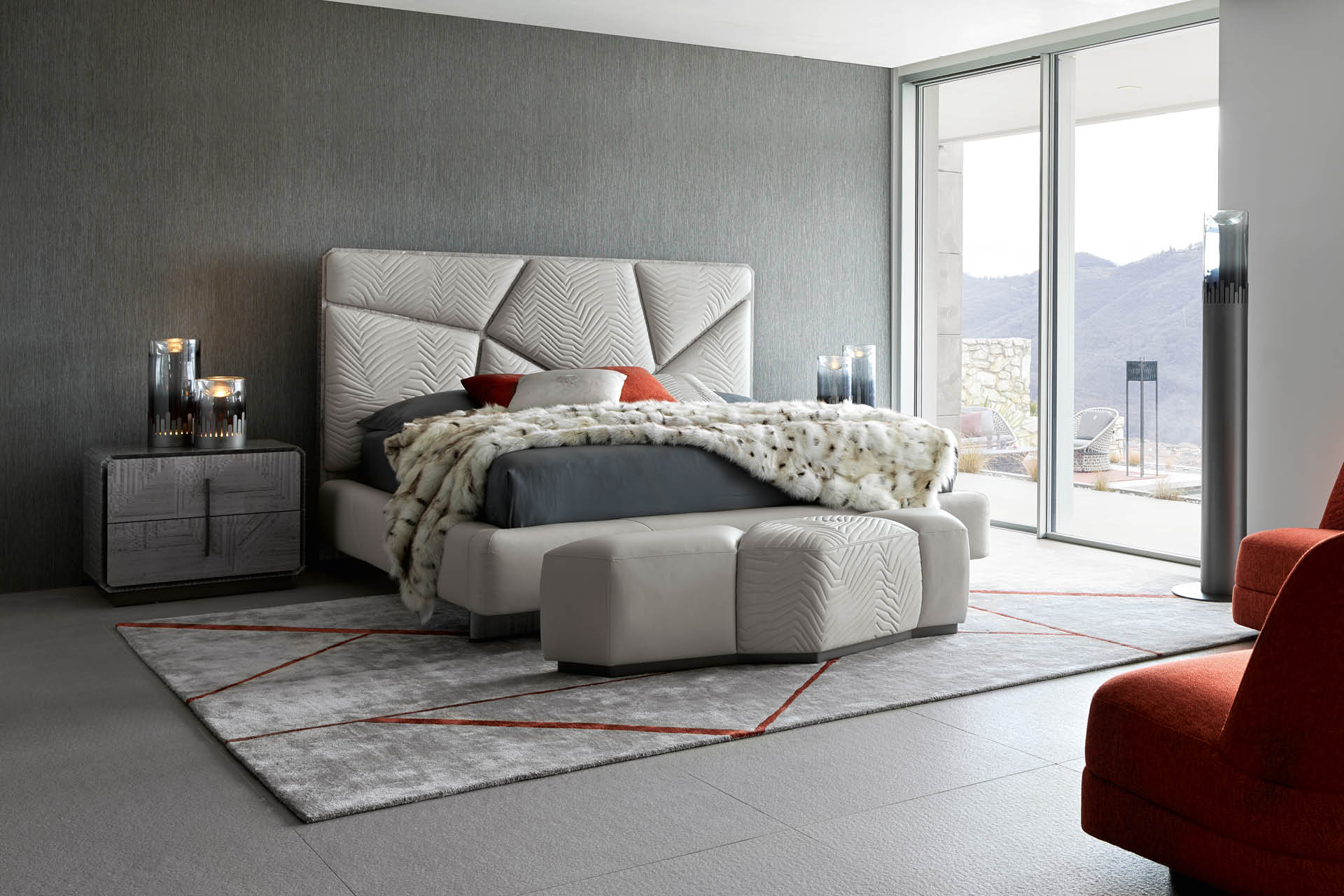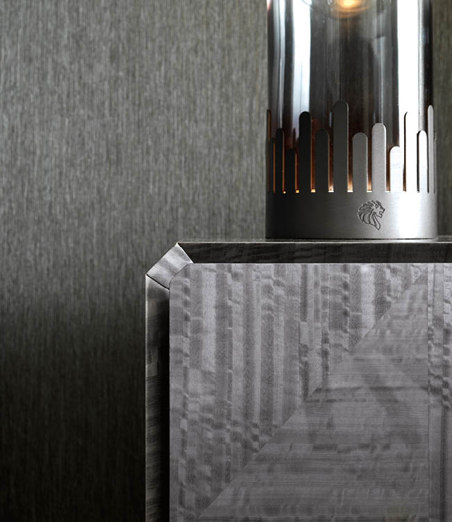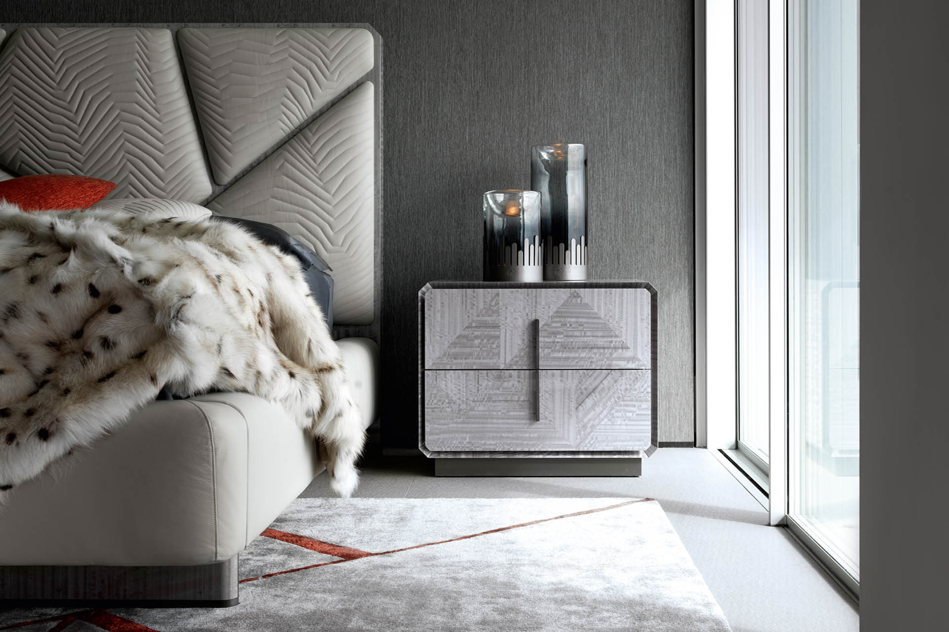 Comodino in impiallacciatura di Eucalipto riccio della Tasmania intarsiato con finitura in poliestere lucido. 2 cassetti ad estrazione totale con parte inferiore in tessuto vellutato. Base e maniglie in acciaio inox nichel grigio satinato. Piano e fianchi con inserto in acciaio inox nichel grigio satinato.