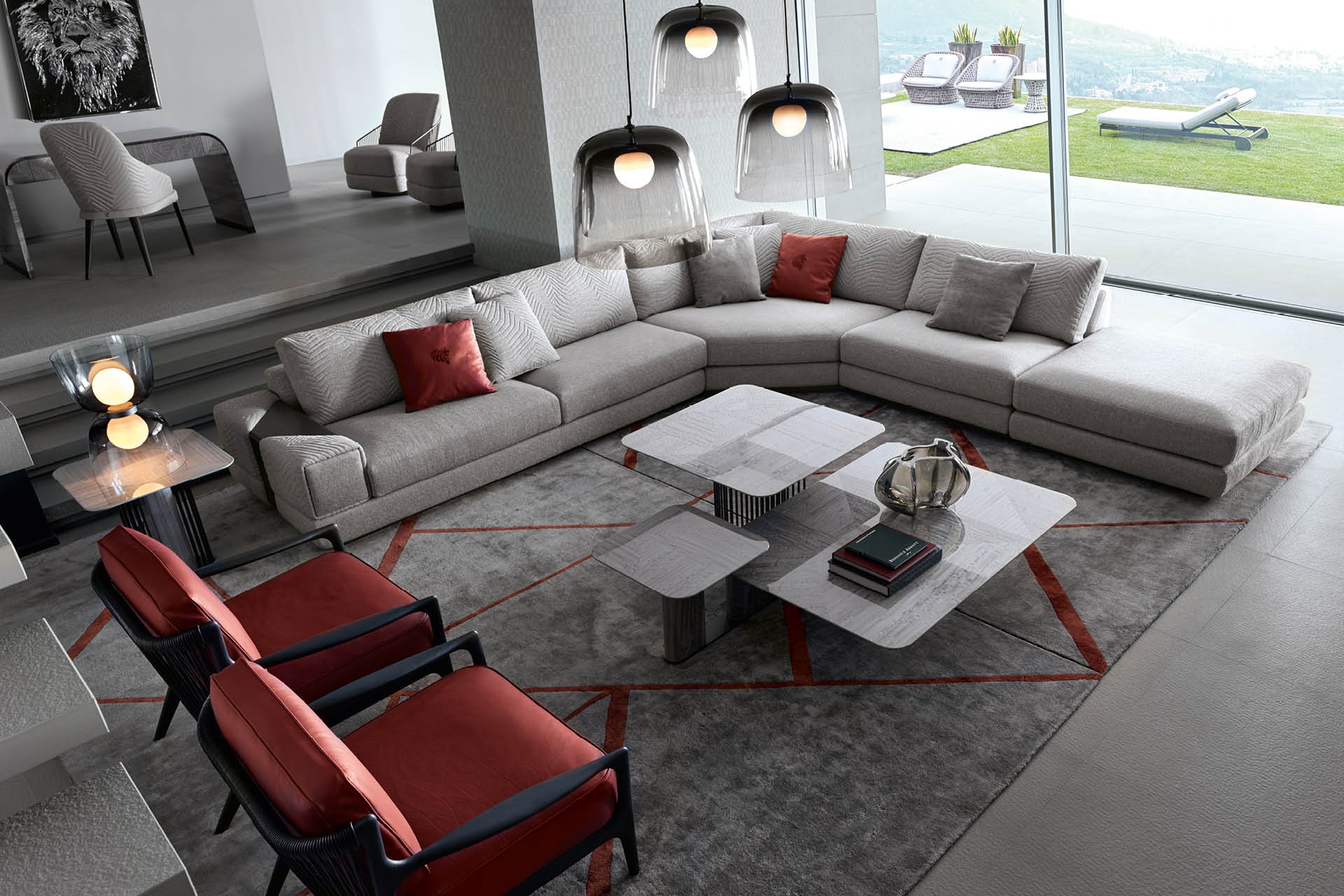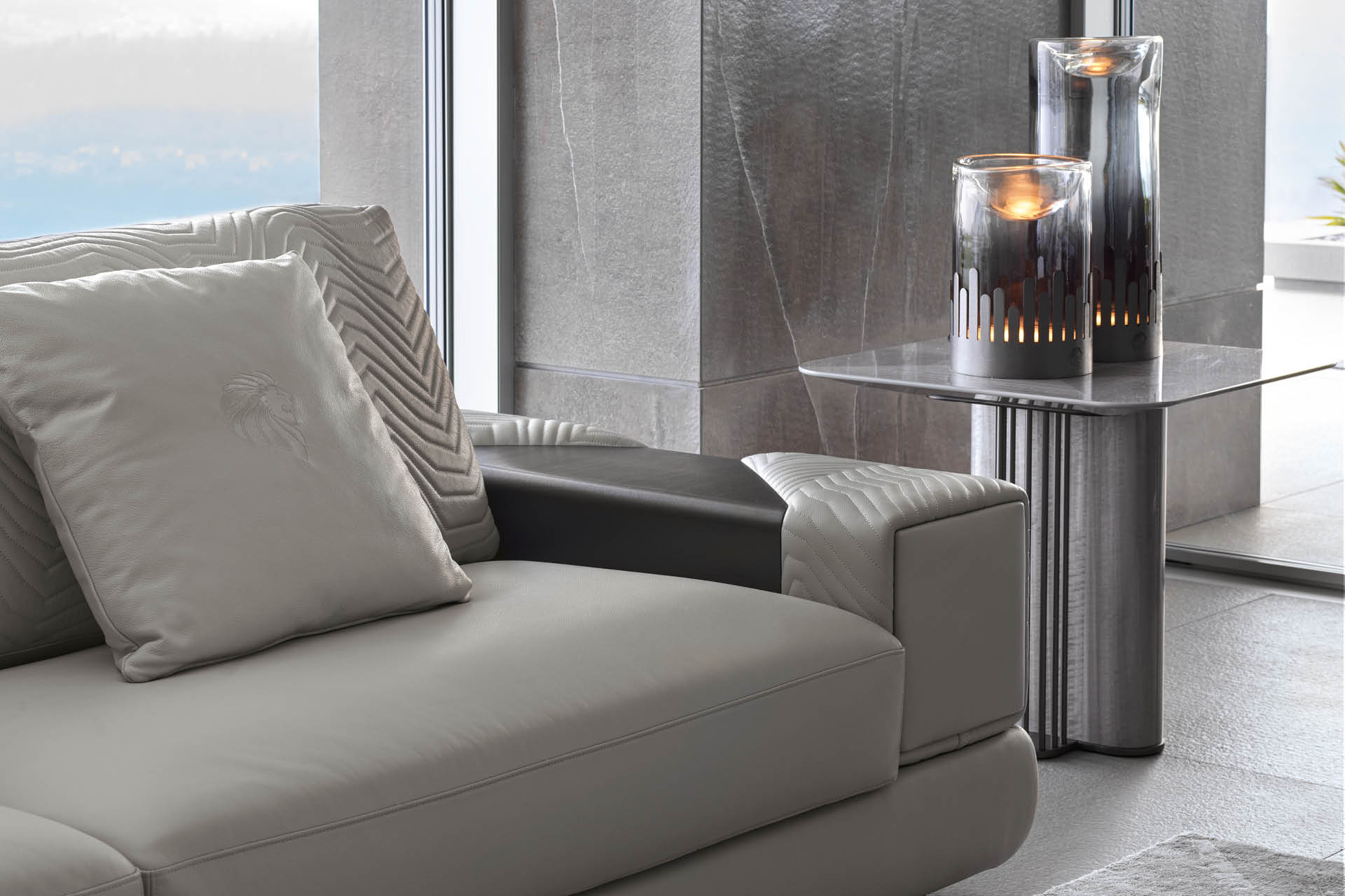 Tavolino quadrato con piano impiallacciato in Eucalipto riccio della Tasmania con finitura in poliestere lucido. Base in acciaio inox satinato e impiallacciatura in Eucaliptus riccio della Tasmania con finitura in poliestere lucido.