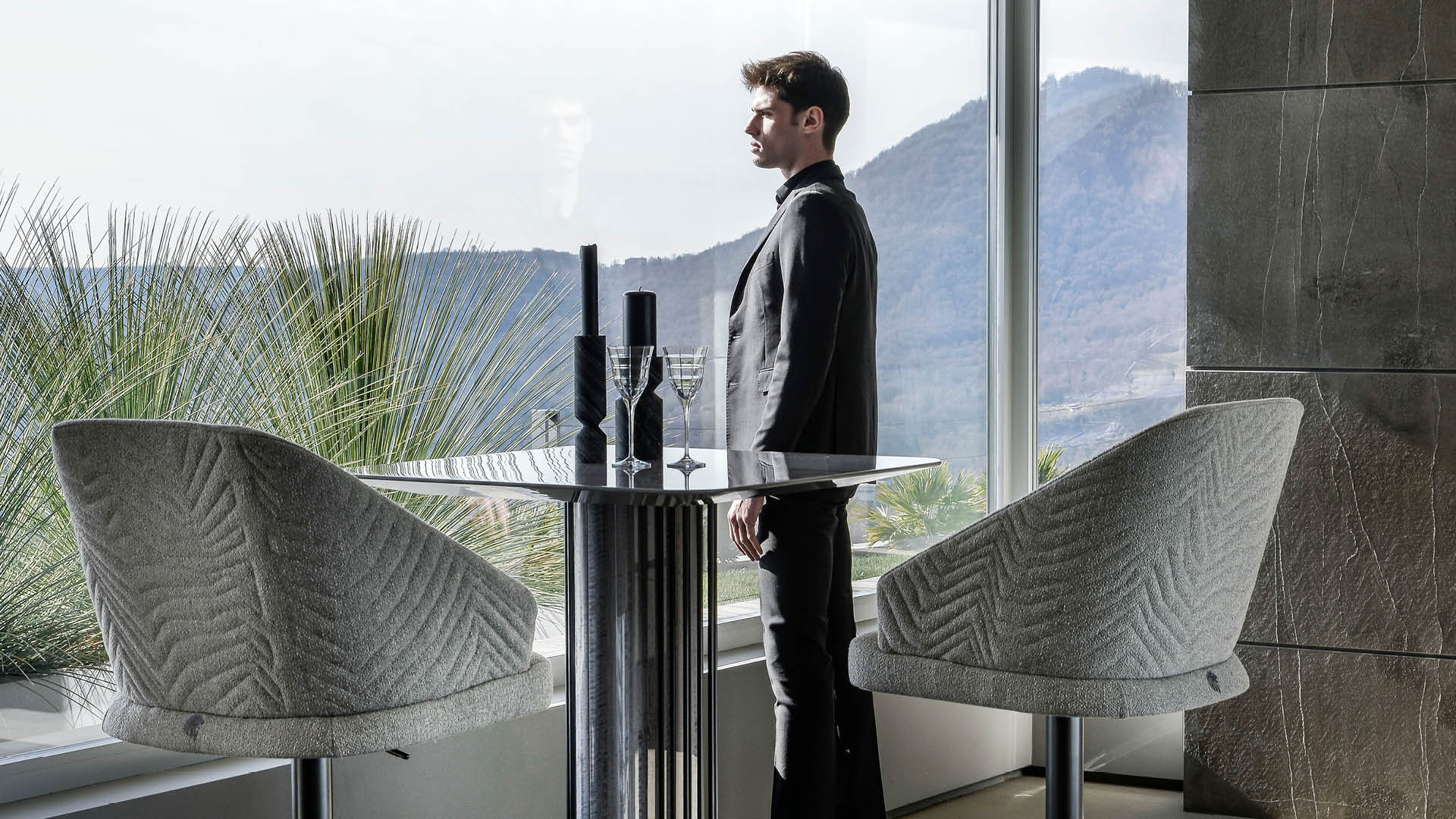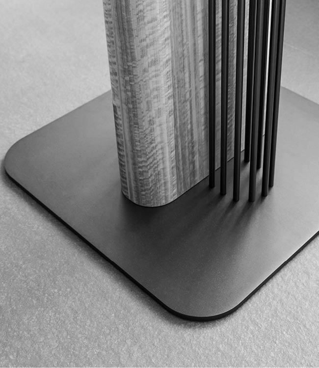 Tavolo da bar con piano impiallacciato in Eucalipto riccio della Tasmania con finitura in poliestere lucido. Base in acciaio inox satinato e impiallacciatura in Eucaliptus riccio della Tasmania con finitura in poliestere lucido.