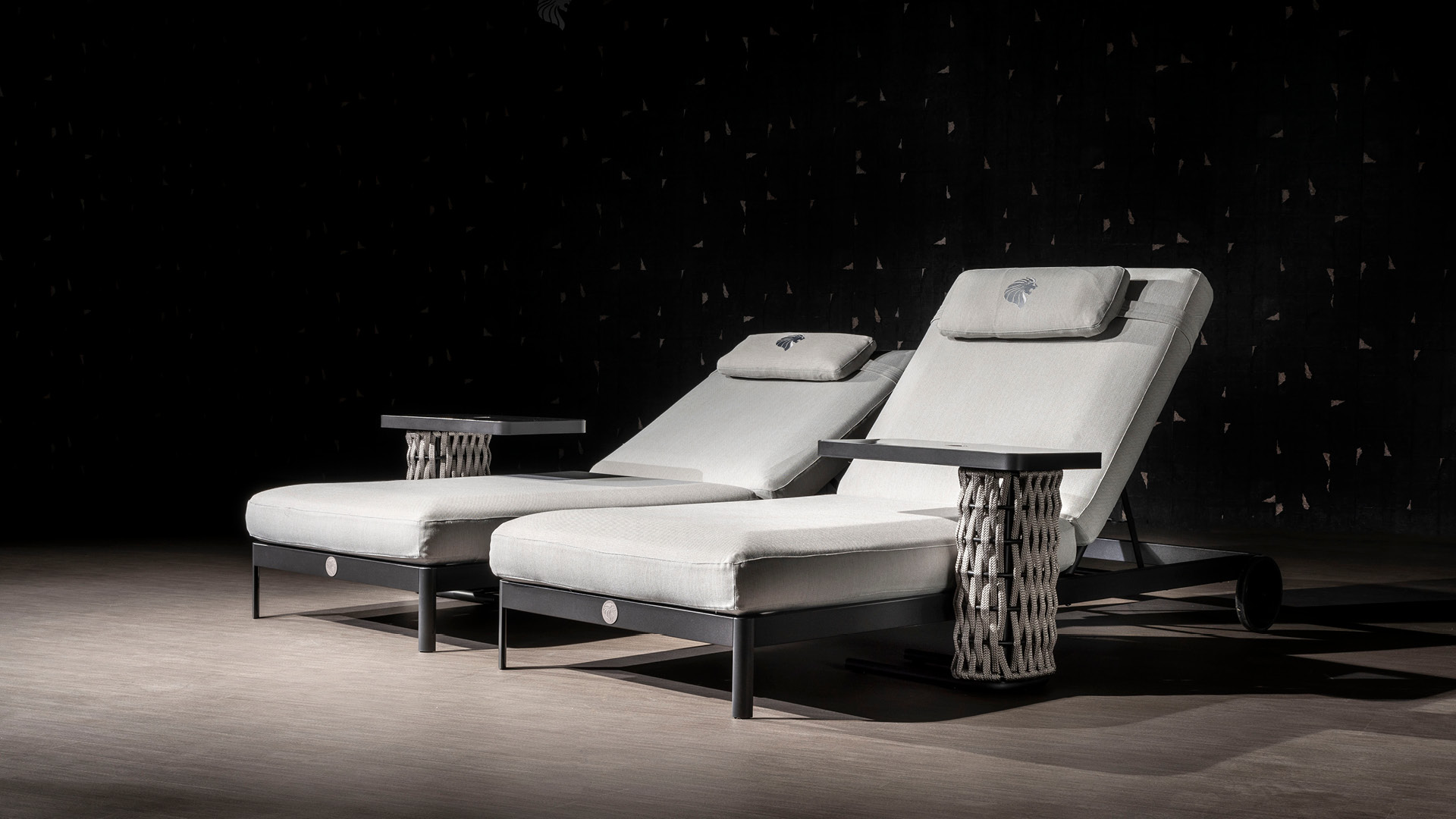 Tavolino da divano per esterni in metallo nero satinato trattato in cataforesi con logo Giorgio Collection e corde intrecciate.