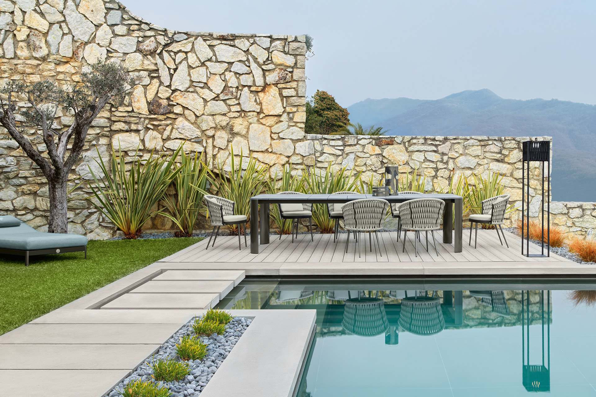 Tavolo rettangolare da esterno con piano composto da lamelle di pietra naturale Cardoso trattata, con logo Giorgio Collection. Gambe in metallo nero satinato.