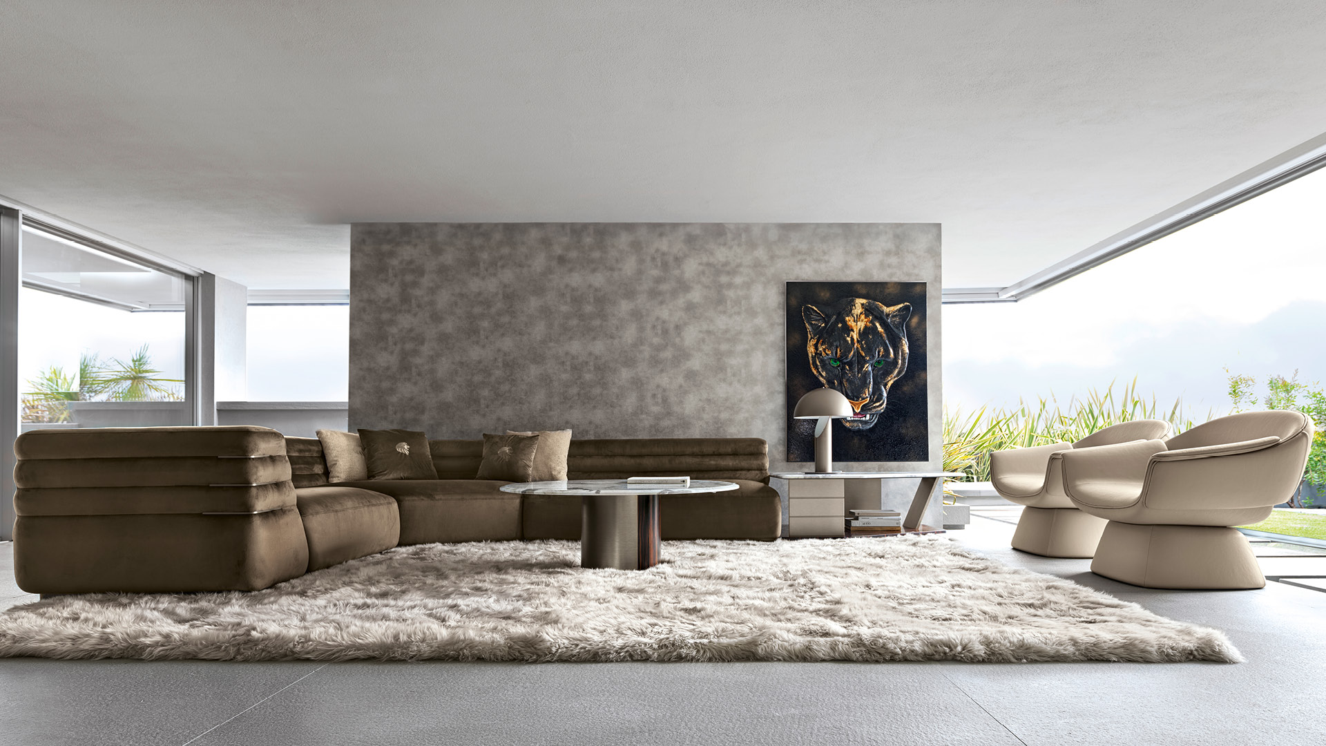 OPUS è una collezione incentrata su una versatile famiglia di divani in cui il comfort si fonde con silhouette scultoree. Sia nelle configurazioni fisse che nelle complesse composizioni modulari con chaise longue, elementi angolari e pouf con piano in marmo, i divani Opus offrono un’estrema personalizzazione per adattarsi a qualsiasi spazio abitativo contemporaneo. Una dimensione tattile unica è introdotta dalle poltrone, dai pouf e dai tavolini da cocktail disponibili in agnello australiano, che offrono una texture morbida e invitante. A completare l’arredamento c’è una gamma esclusiva di illuminazione che include lampadari, applique e lampade realizzate con centinaia di pezzi di vetro soffiato veneziano “Murano” a forma di diamante, che catturano e riflettono la luce con precisione ipnotica. Infine, la collezione OPUS trova la sua massima espressione in dipinti su misura che fondono tecniche di gioielleria e di altorilievo, caratterizzati da foglie d’oro e d’argento. OPUS è una sinfonia di texture rare e riflessi luminosi pensata per chi considera la propria casa un capolavoro vivente.