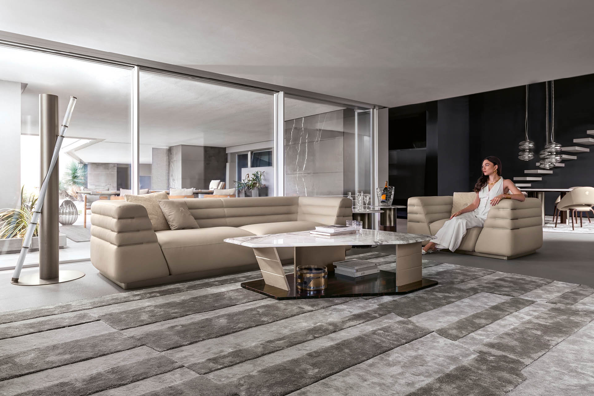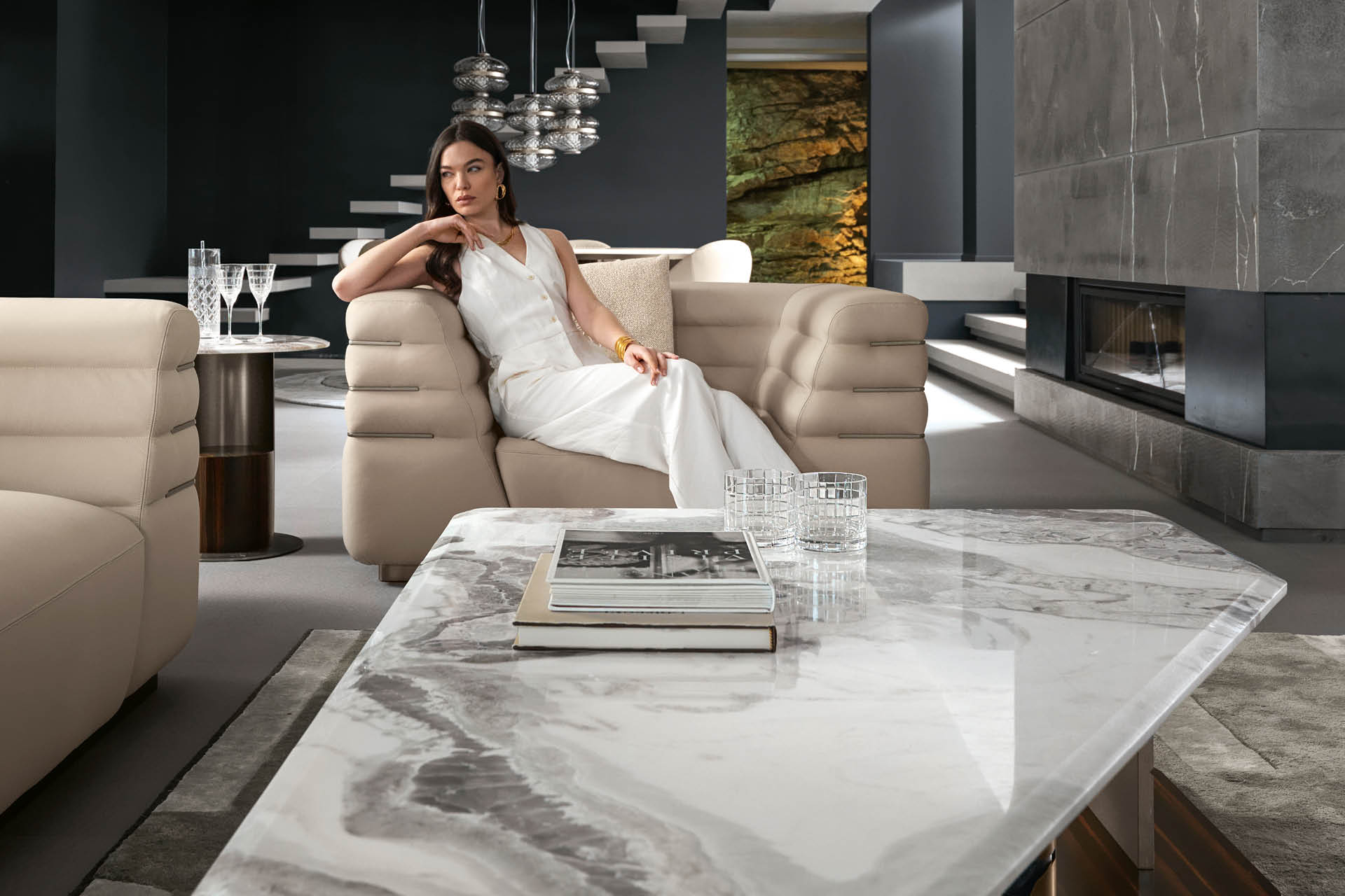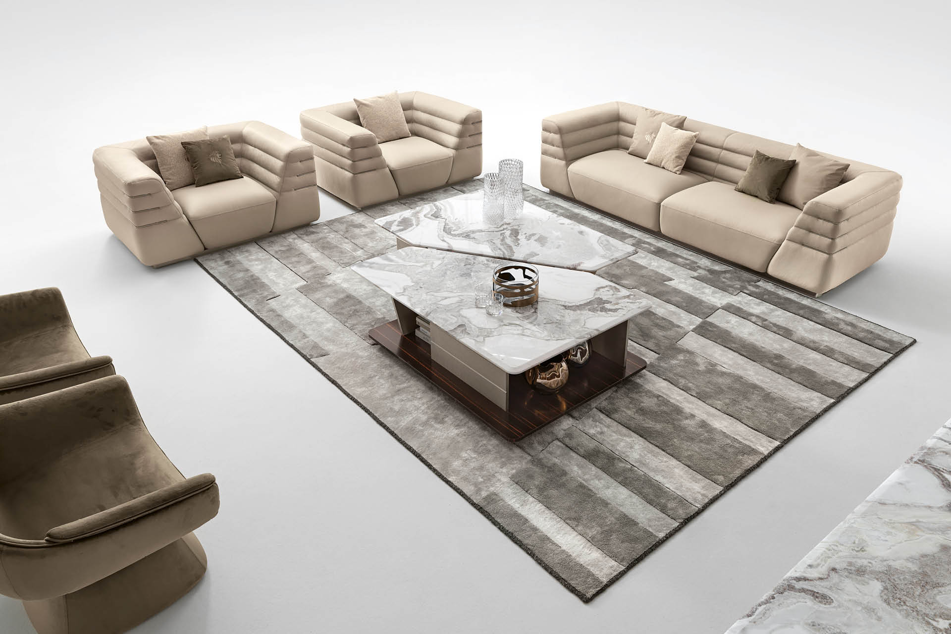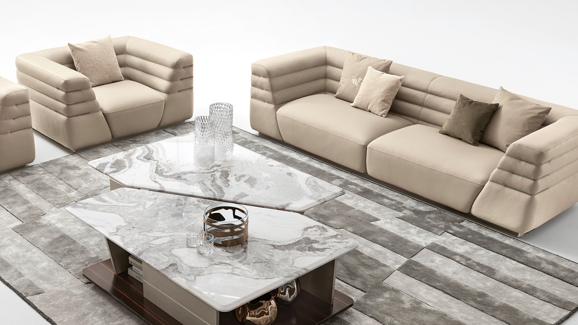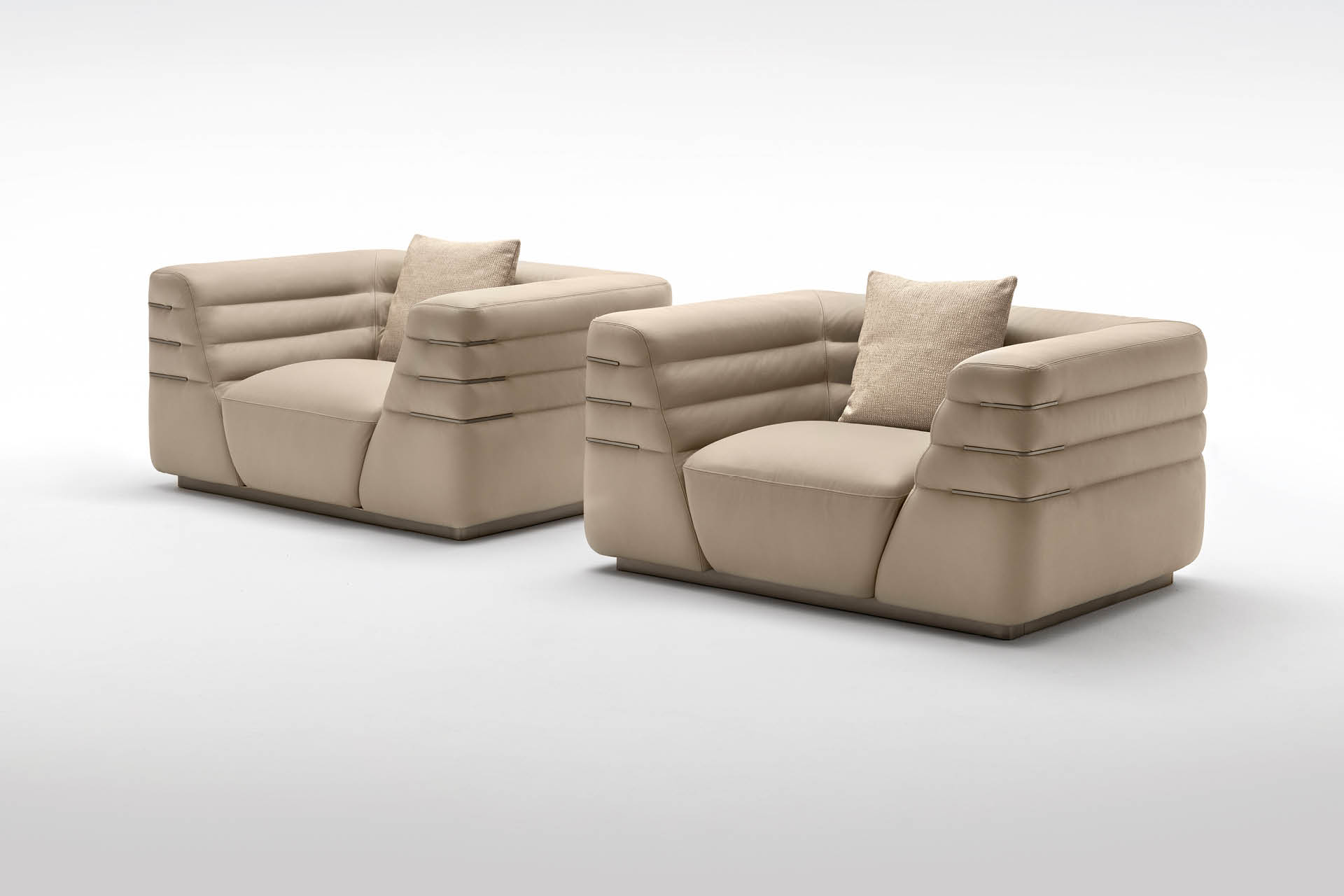 Poltrona disponibile in pelle di prima scelta, pelle nubuk, pelle stampa lucertola o tessuto. Seduta e fianchi della poltrona con cucitura speciale in schiuma di poliuretano rivestita in piuma d'oca. Base e inserti in acciaio inossidabile con finitura titanio zincato satinato. Altezza seduta cm. 44