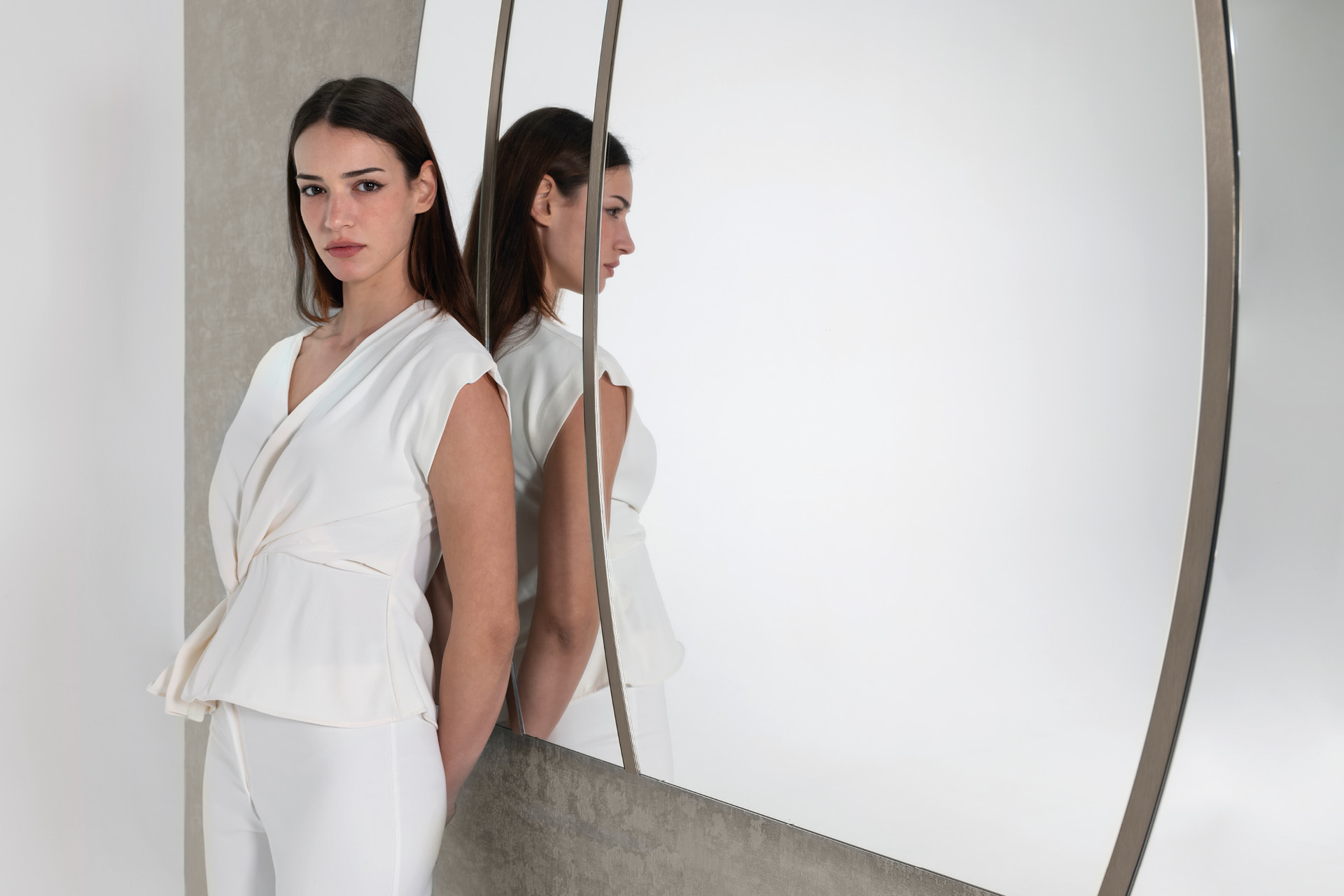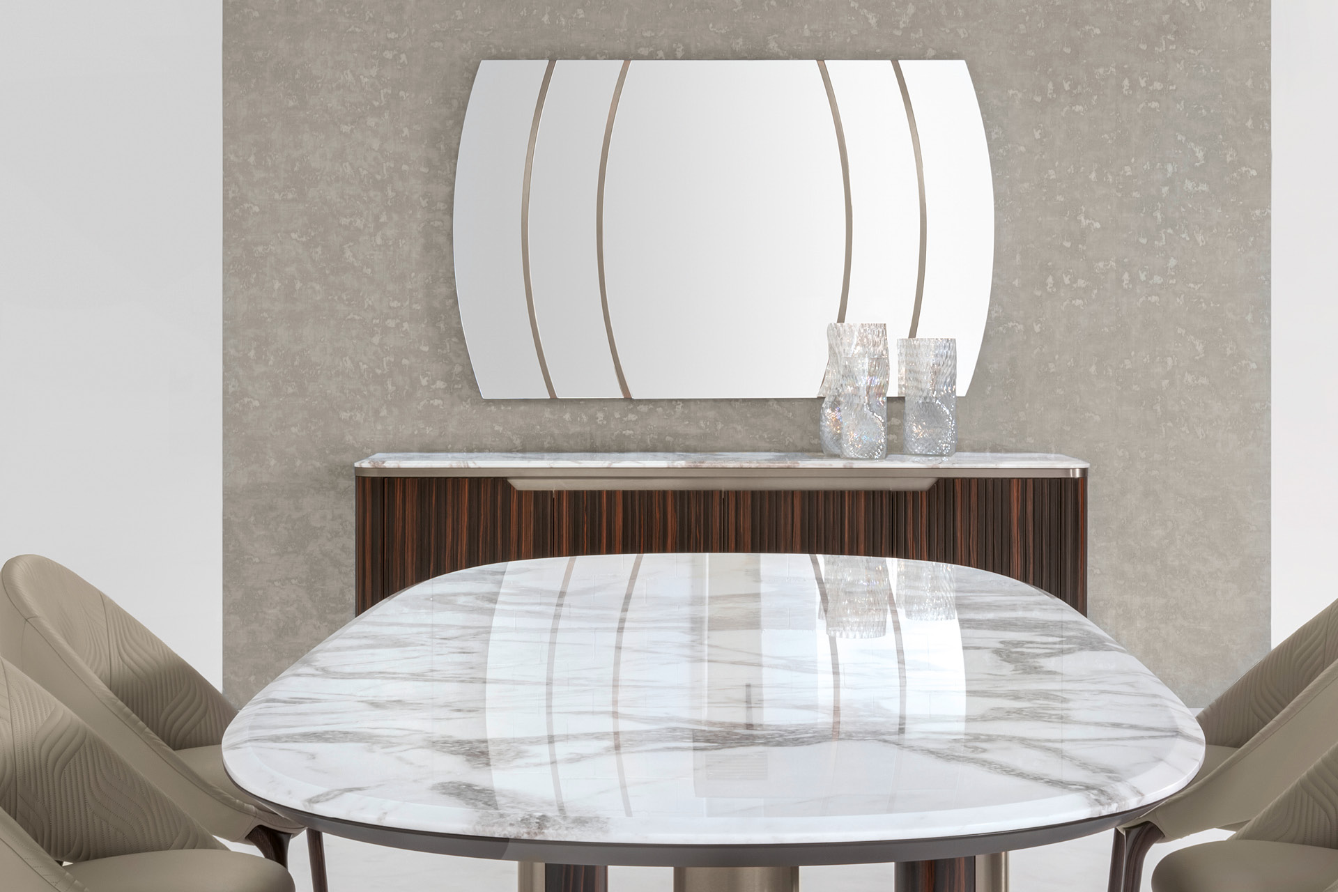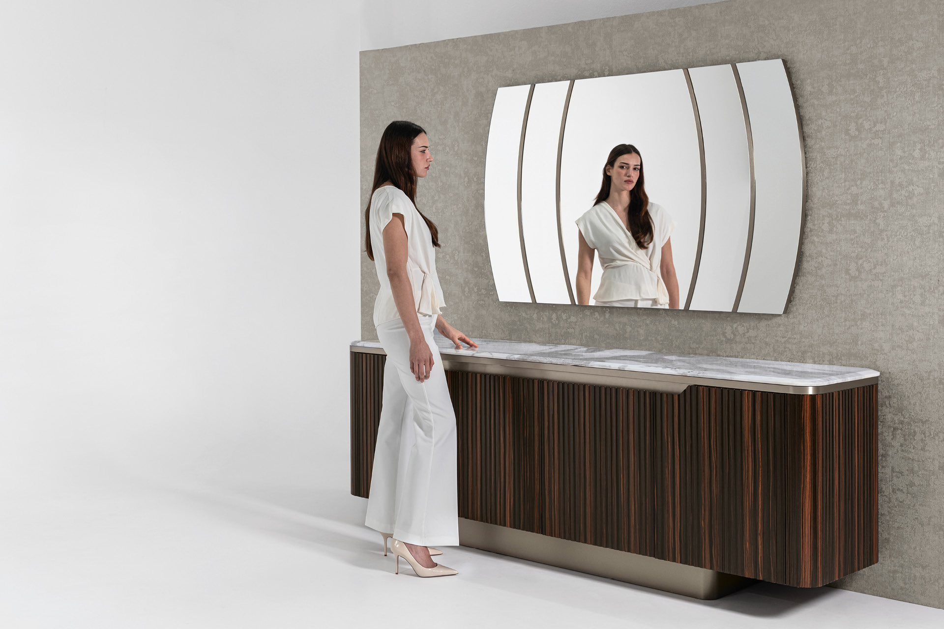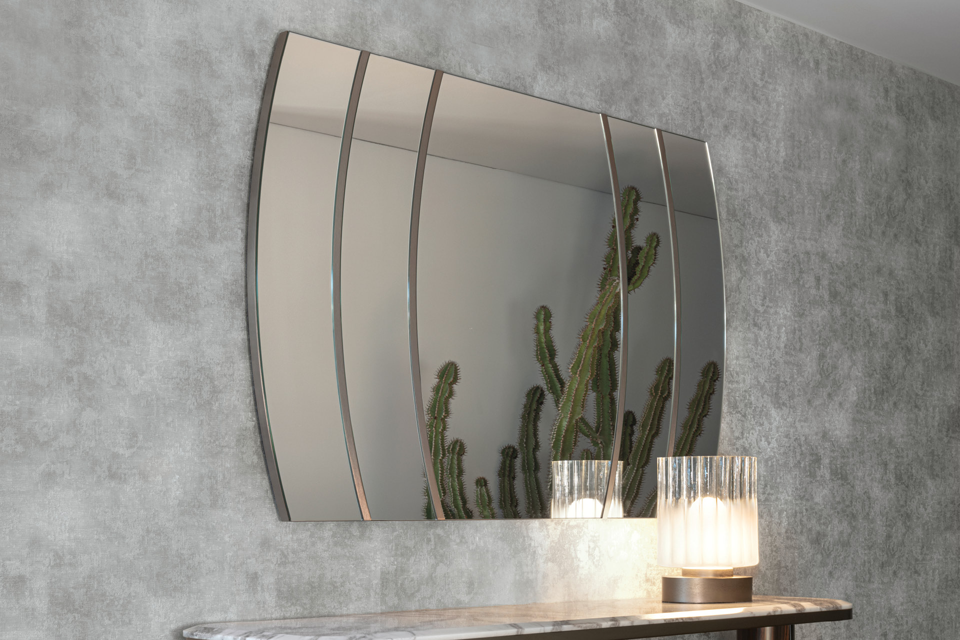Specchio con cornice e inserti in acciaio inox finitura titanio satinato.